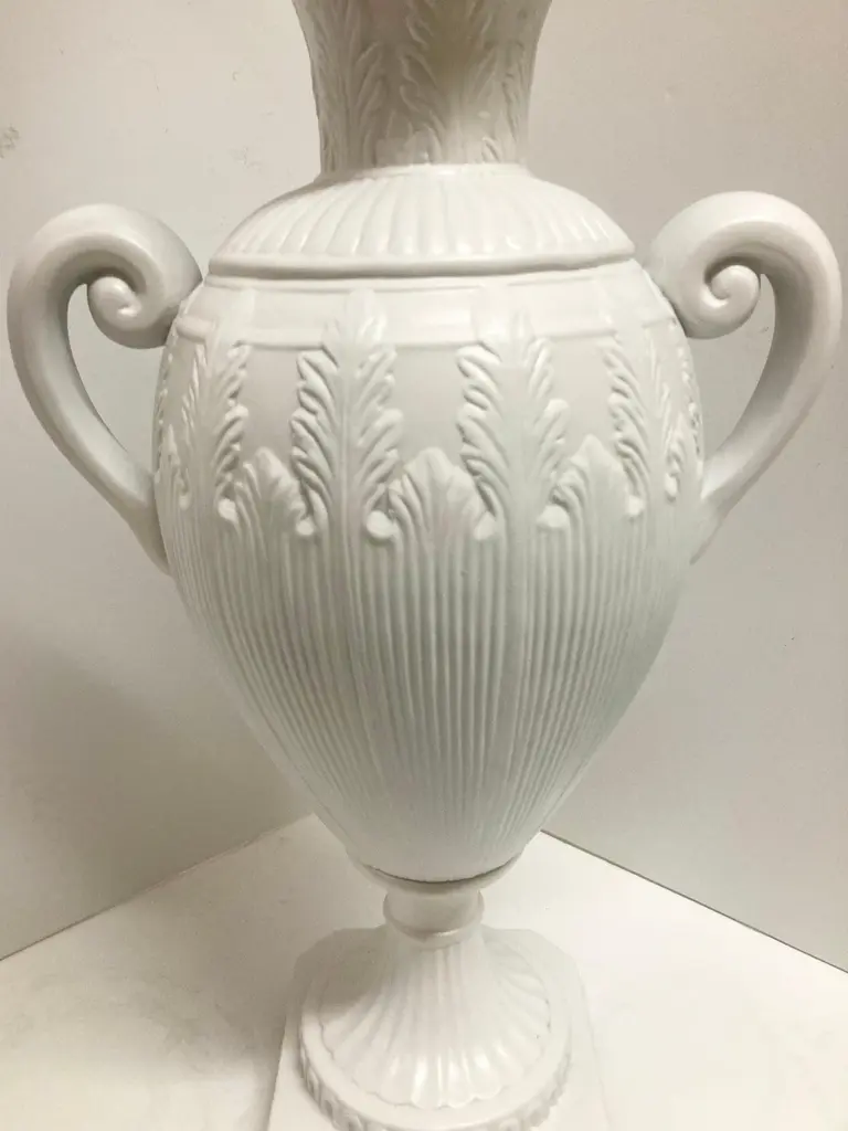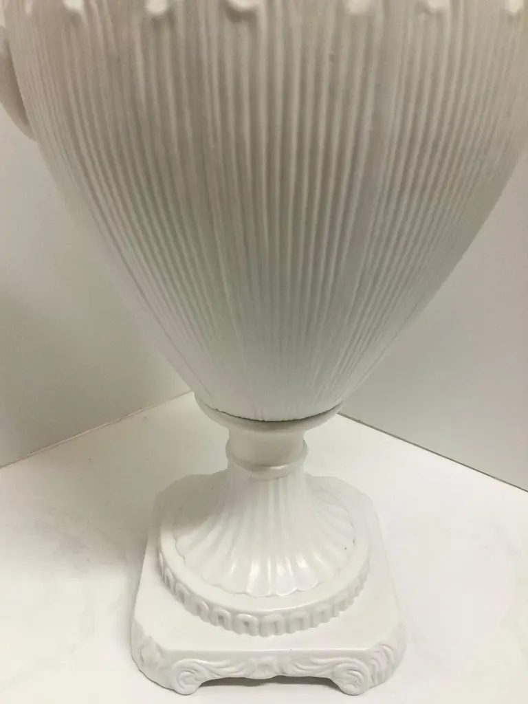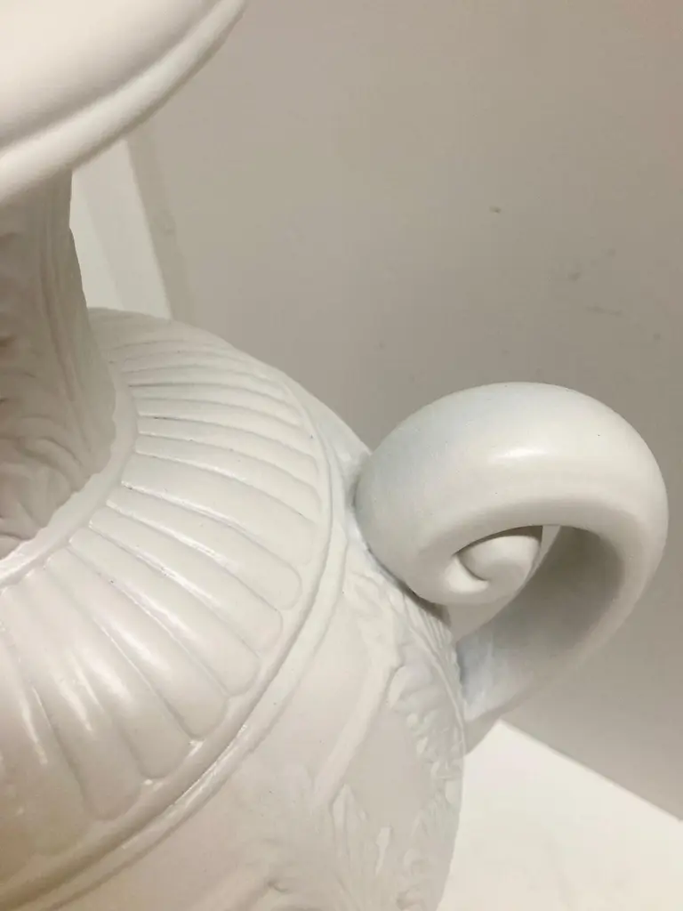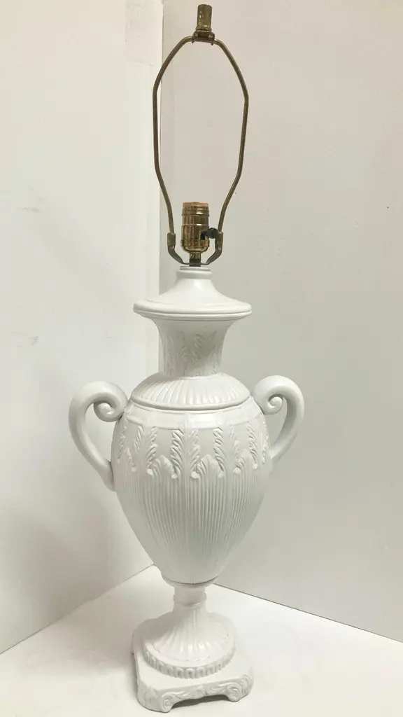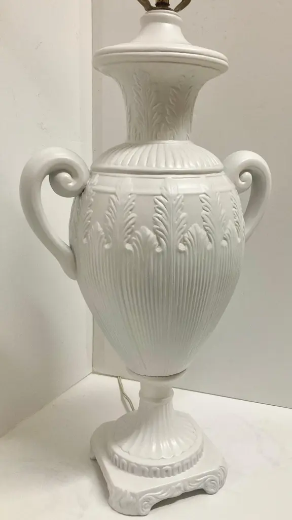 Gorgeous Hollywood Regency ceramic urn table lamp in fresh white lacquered finish. Wonderful neoclassical design. Add some architecture to your home or project. Just add your favorite shade style. We have 2 available, so buy both and have a fabulous pair.