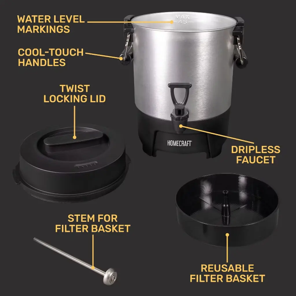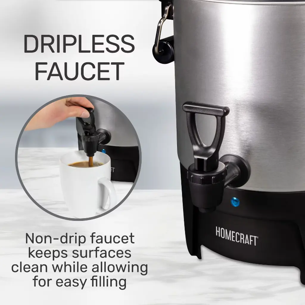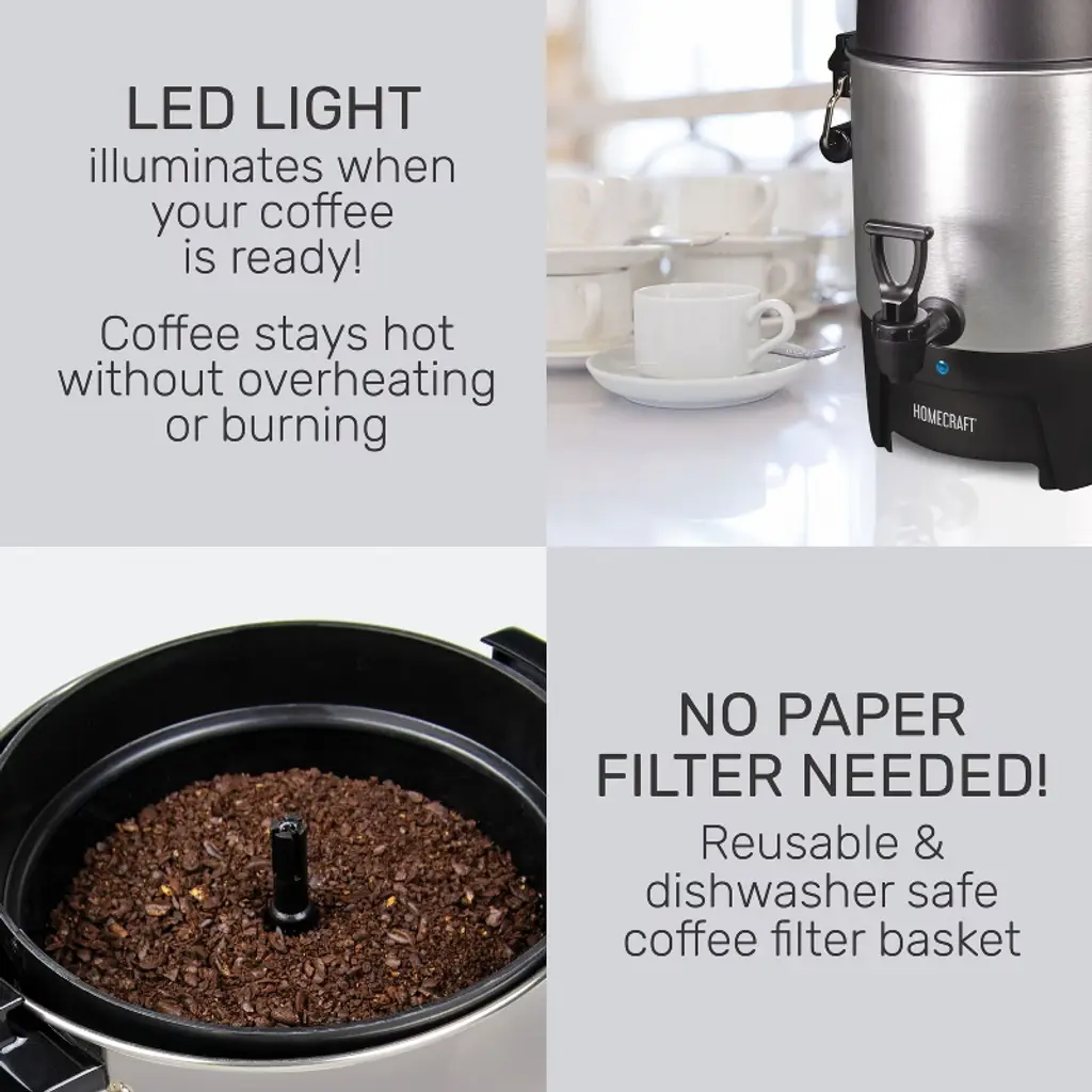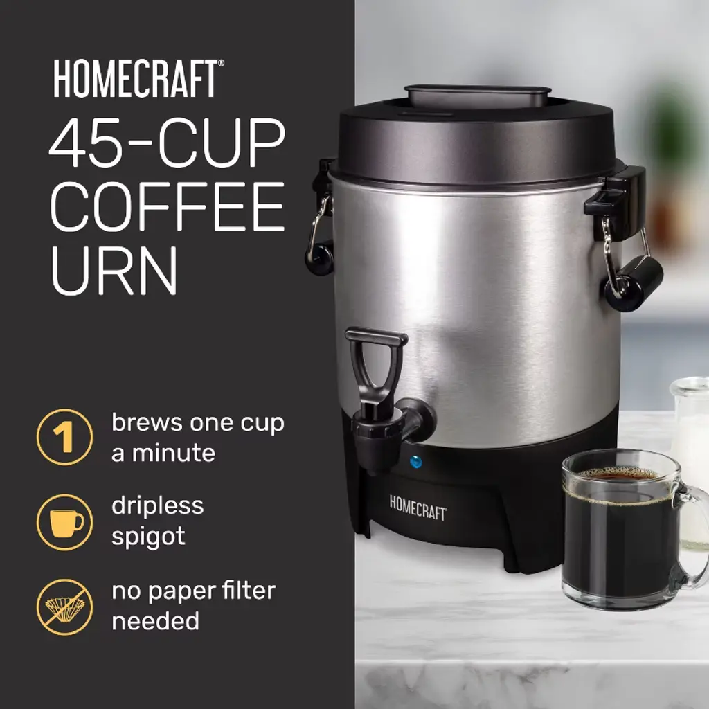 When it's time to host a big event, there's no better way to serve up refreshing beverages to your guests than with Homecraft's 45-Cup Coffee Urn. This polished aluminum coffee pot brews up to 45 cups of great tasting coffee quickly and keeps it hot and fresh for hours. It also features easy to read water level markings for you to operate with ease and an indicator light to signal when brewing is complete and it's time to grab your mug. If coffee isn't your cup of tea, you can use this brewing system to make tea or other beverages like cider and hot chocolate. Clean up is a breeze as the aluminum interior is easy to clean and the reusable filter basket is dishwasher safe, ready for the next batch.