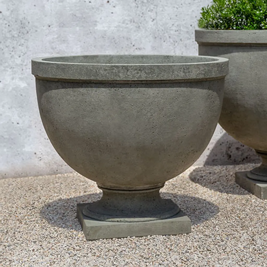 Designed with durability in mind, this cast-stone urn was made in the USA using locally sourced natural materials. Its hand-applied patina adds to its already-considerable stateliness. The urn has two drainage holes in the bottom.