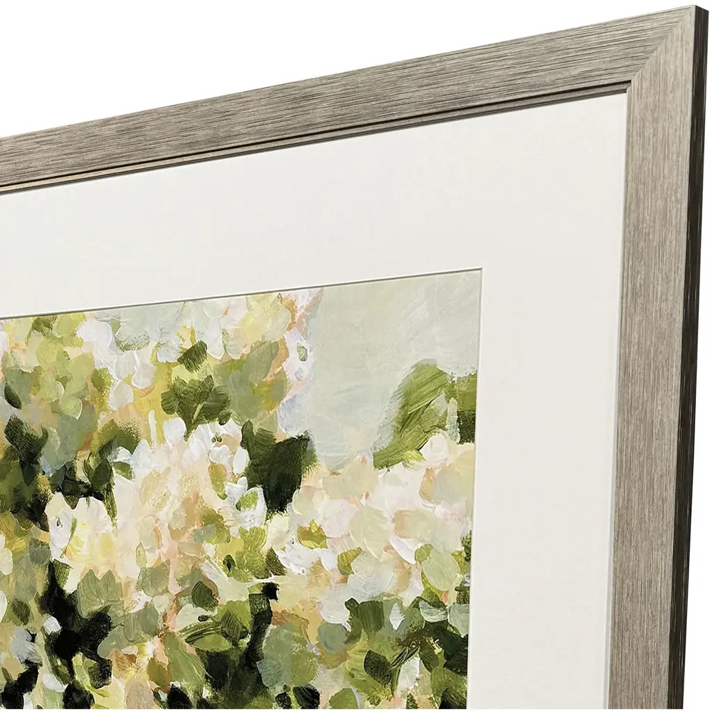 Hydrangea blossoms overflow a blue vase. Matted in white and framed in a distressed silver finish moulding with a combed embossed pattern.