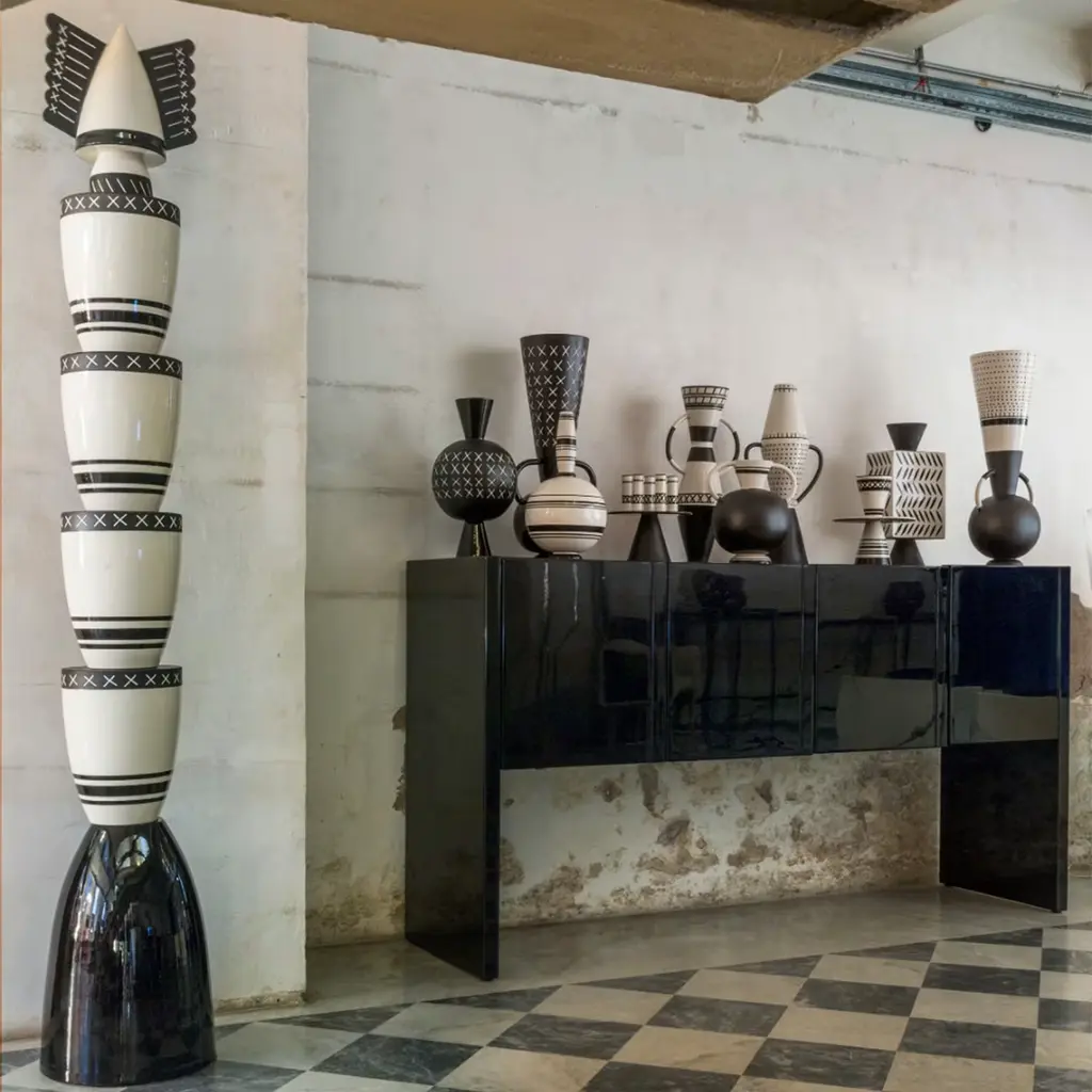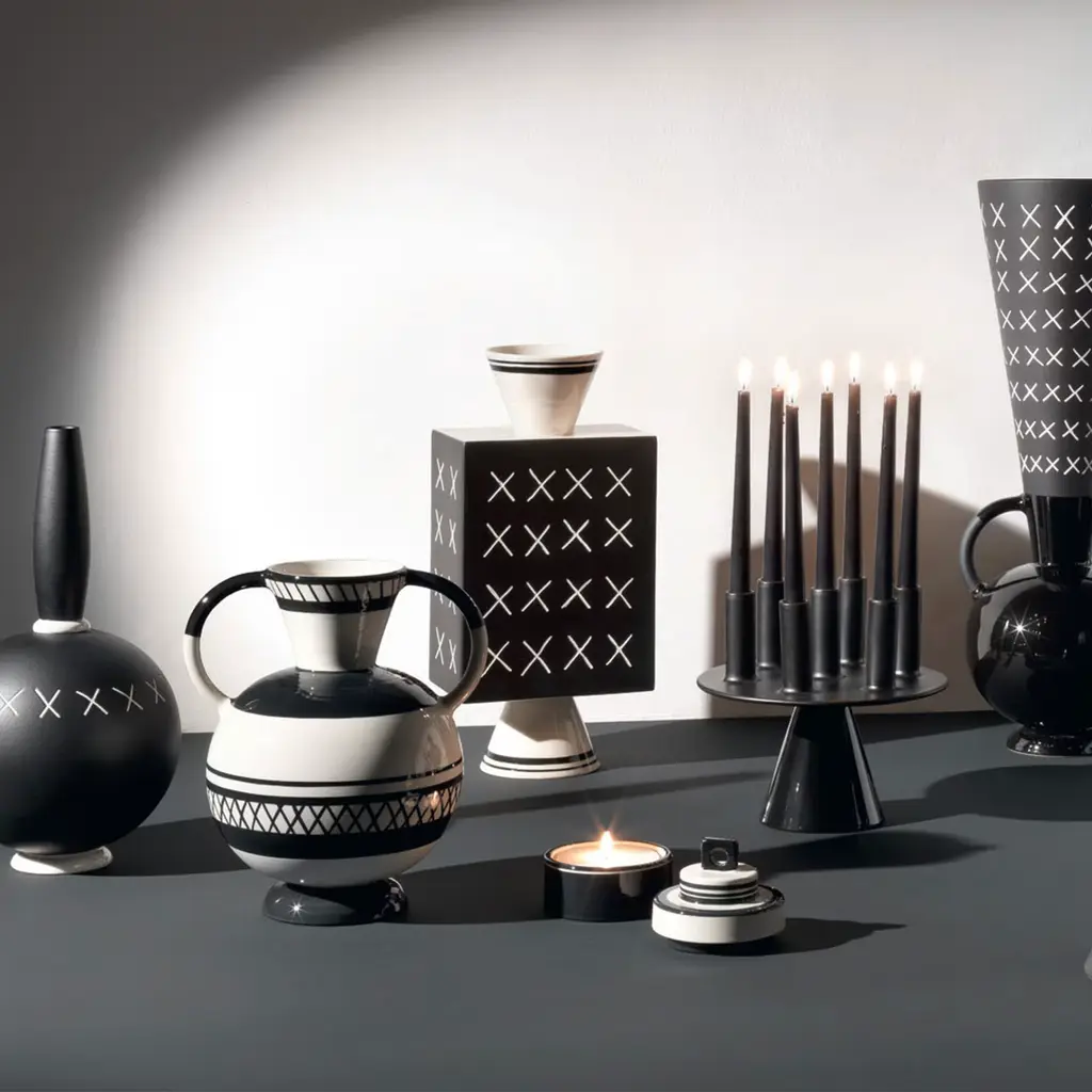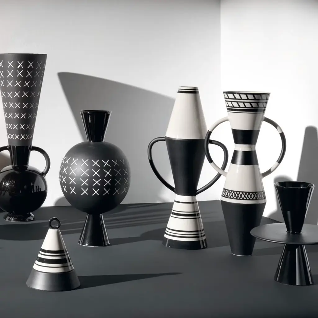 Conical and spheroidal vases play with lines and crosses in a black-and-white ritual: large clay vase, hand thrown, with clay handles. Finish in a glossy black glaze for the base and handles, matte black glaze and decoration with white engobe cross for the upper part. Designed by Ugo La Pietra