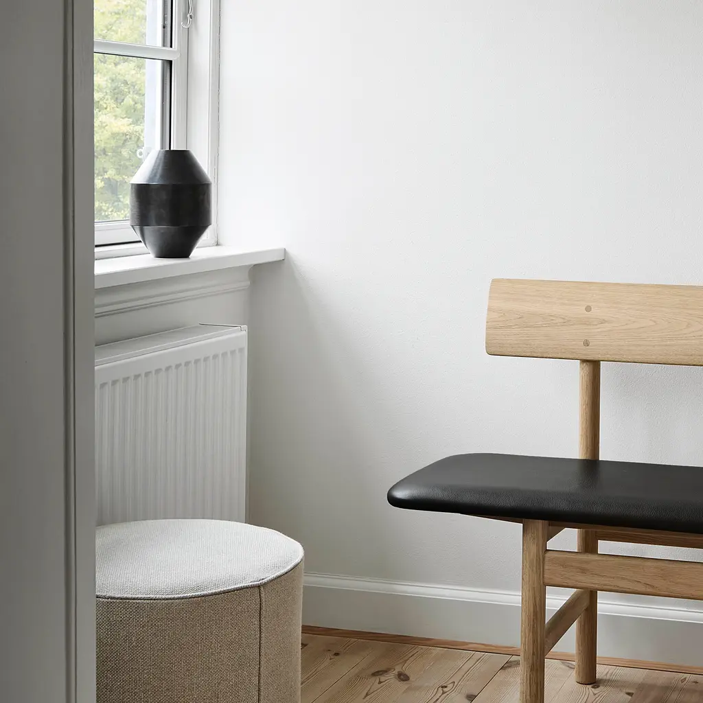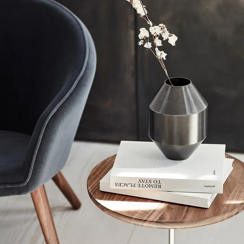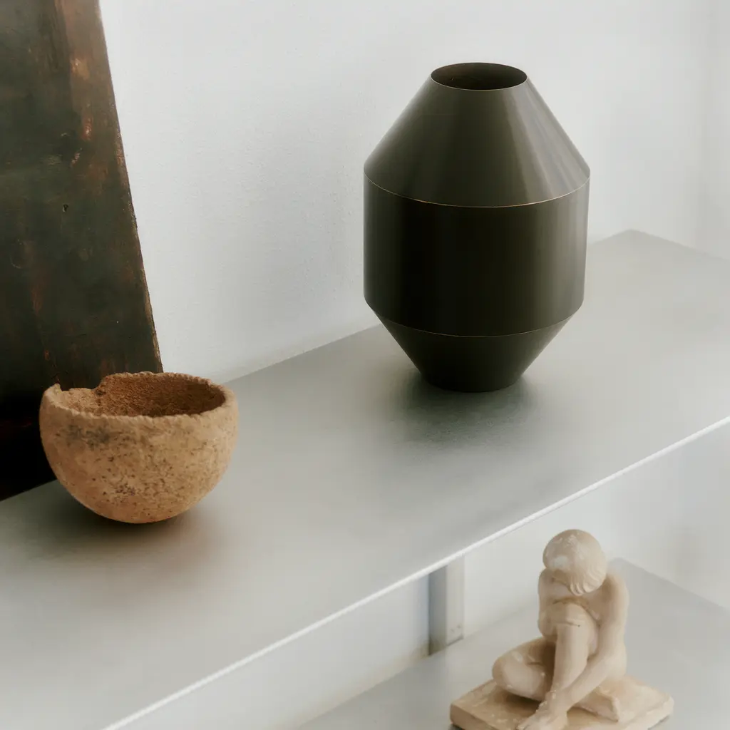 Inspired by ancient Greek vases, designer Sofie Østerby beautifully reinterpreted the ceramic vessel archetype as a solid brass object. Modern and distinctive, the Hydro Vase creates a perfect equilibrium between the familiar shape of earthenware artifacts and the solidity of brass. To produce this vase, Fredericia Furniture collaborates with a Portuguese workshop who still crafts with traditional casting methods that have been used in the past to make traditional armor. The solid brass has an oxidized surface that gives the material an almost black color. Over time and with use, the vase will develop a charming patina to infuse your home décor with more character. Completely waterproof, the Fredericia Hydro Vase, Brass is perfect for fresh flowers. To reduce the risk of water spots, keep the exterior dry. This handcrafted vase is also available in a mouth-blown glass version.