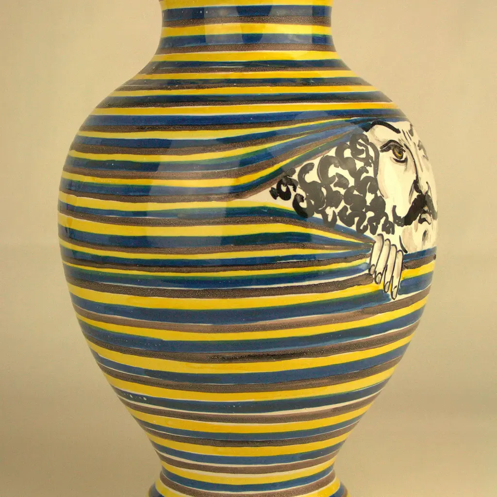 Dream-like and eclectic, this elegant vase is part of the I Curiosi Collection (translating to "Curious People" in English). Fashioned of ceramic, the vase's classic, amphora-inspired silhouette is decorated entirely by hand with a series of blue, yellow, and brown parallel lines that accentuate the gentle curves of the piece. The alternating lines of color are punctuated by the image of a man's face, looking to one side with an inquisitive gaze. Exquisitely executed, this vase will enliven any decor.