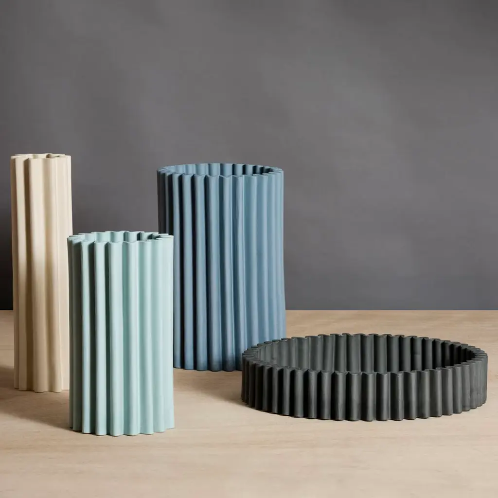 Modern and original, this ceramic vase of the I Flessi Collection reveals Francesca Verardo's ability to infuse a highly expressive quality to ceramic surfaces creating contemporary designs that will enliven any interior. Handcrafted using the slip casting technique, the surface boasts a dynamic movement of convex and concave lines that highlight the rigid cylindrical shape. This artistic object showcases a delicate aqua green color with a matte hue that will suit most interior styles and color palettes.