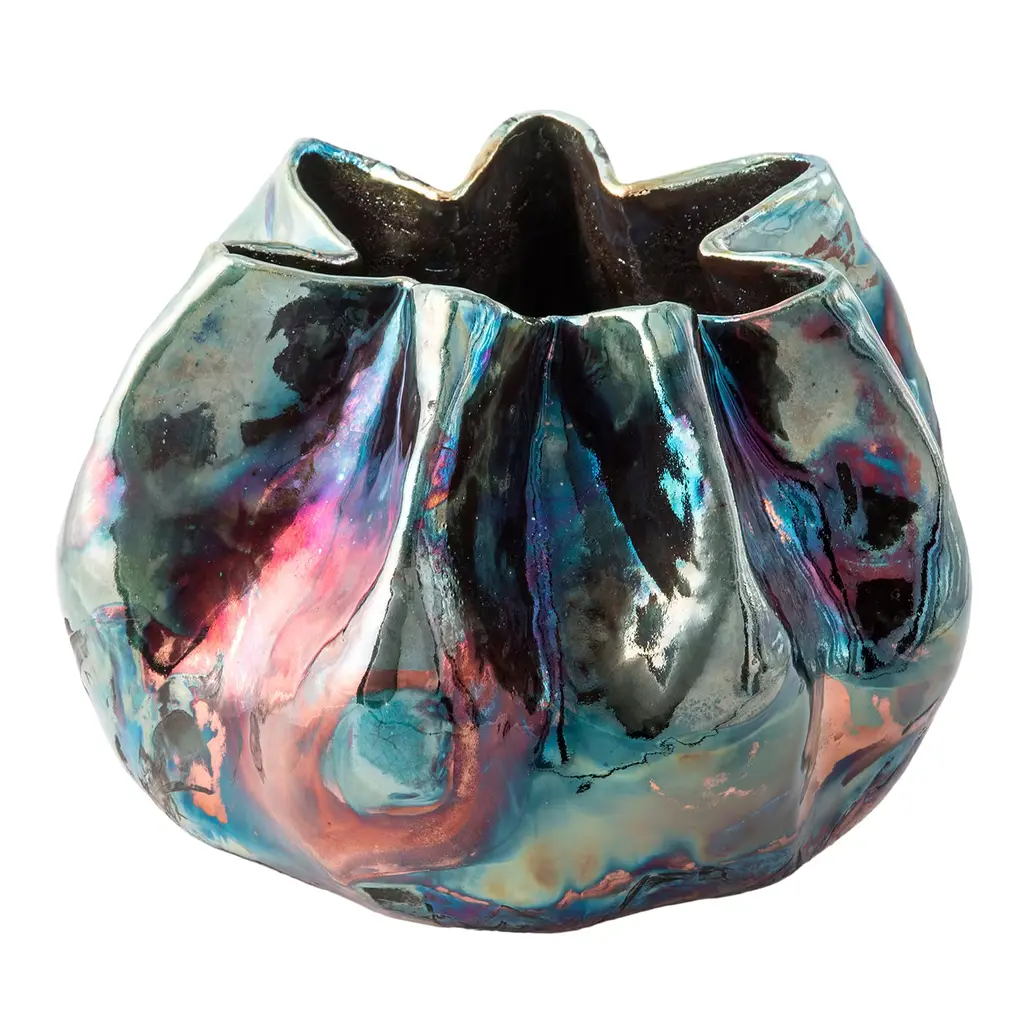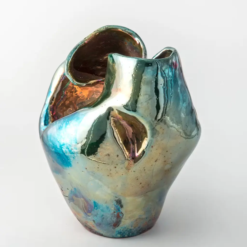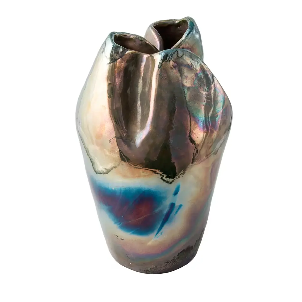 Introducing I Giardini dell'Eden Vase#2, a stunning ceramic sculpture that captivates with its modern form and iridescent colors of blue, pink, and gold. These hues shift beautifully with changes in light, creating a dynamic visual experience. Handcrafted by Basso, this unique piece reflects the beauty of nature through intricate details and a rich raku finish. It serves as an elegant centerpiece, perfect for any decor. A true testament to artistry and craftsmanship. This vase is a unique piece.