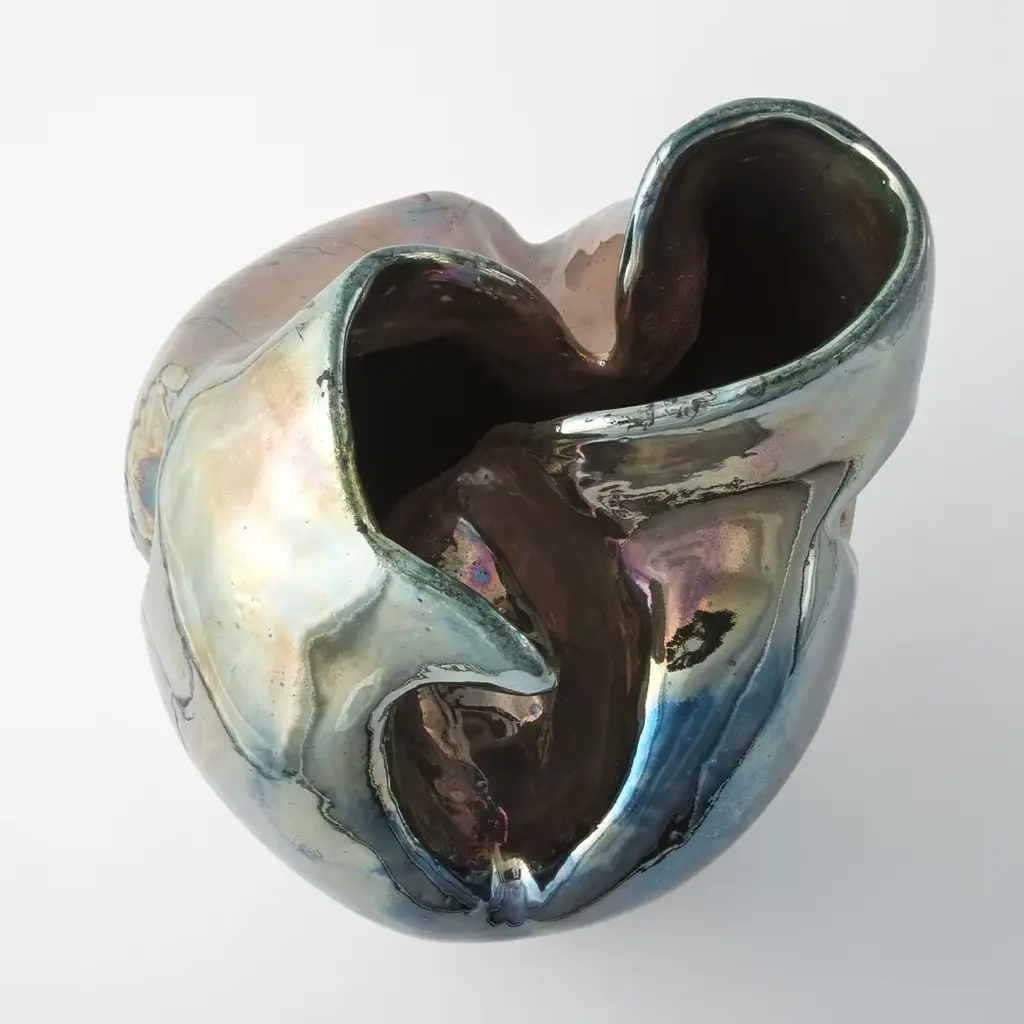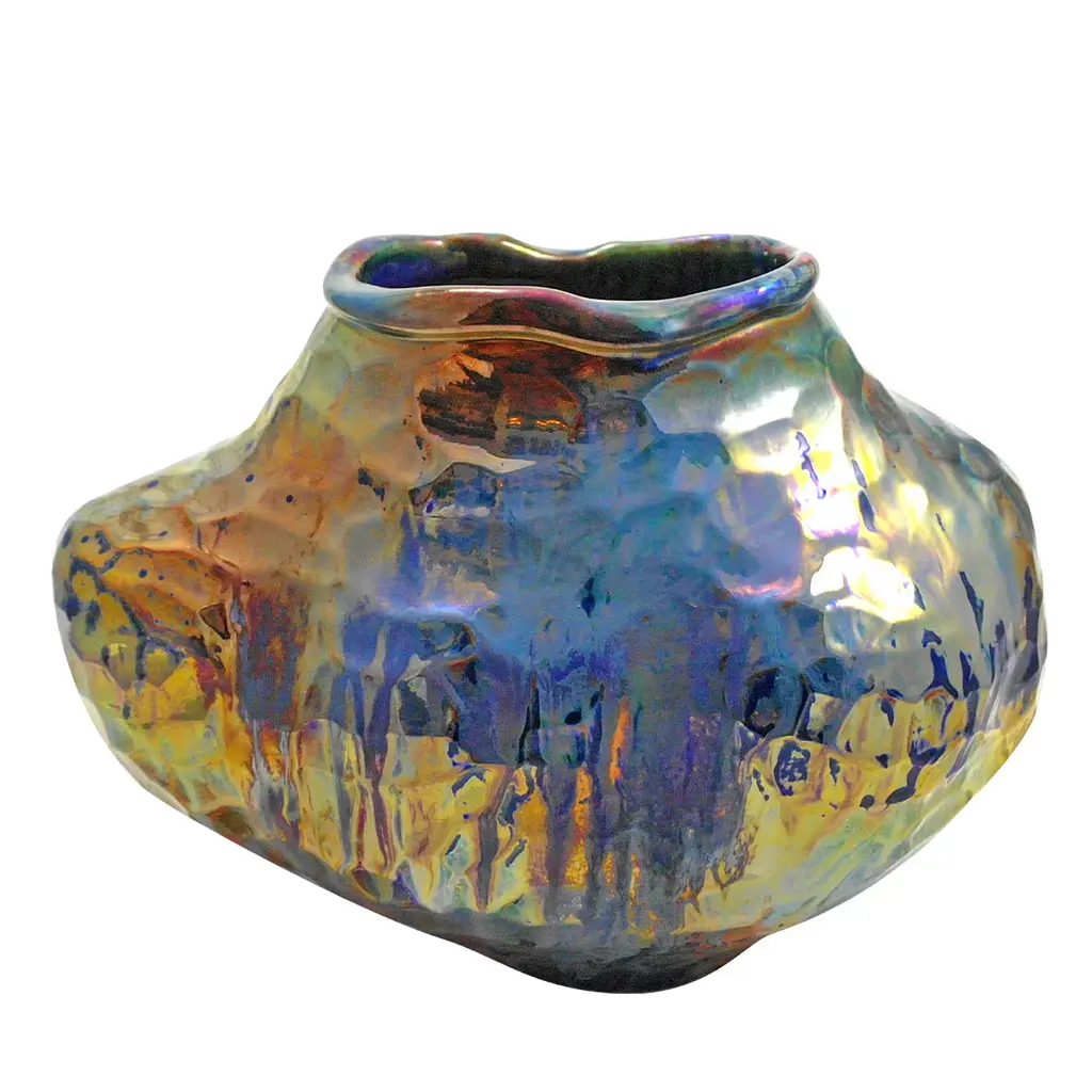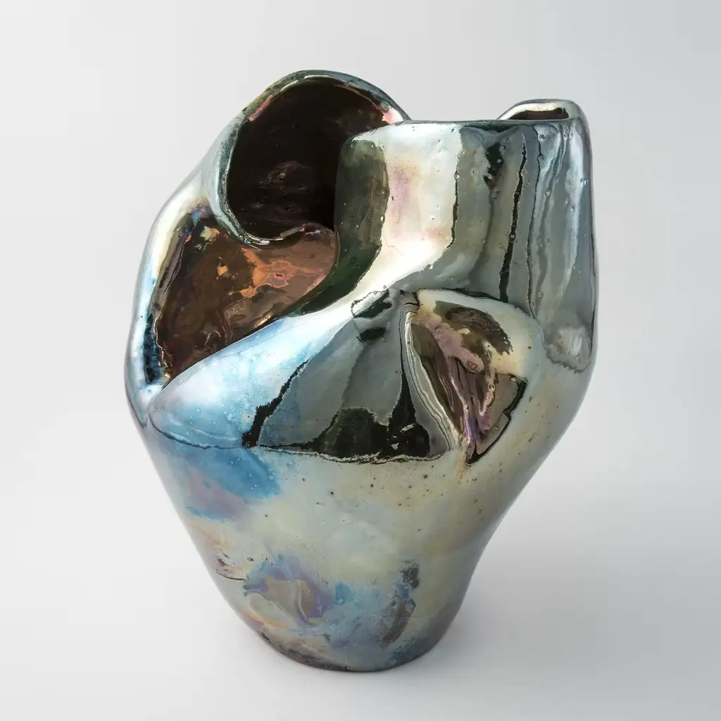 Introducing I Giardini dell'Eden Vase#2, a stunning ceramic sculpture that captivates with its modern form and iridescent colors of blue, pink, and gold. These hues shift beautifully with changes in light, creating a dynamic visual experience. Handcrafted by Basso, this unique piece reflects the beauty of nature through intricate details and a rich raku finish. It serves as an elegant centerpiece, perfect for any decor. A true testament to artistry and craftsmanship. This vase is a unique piece.