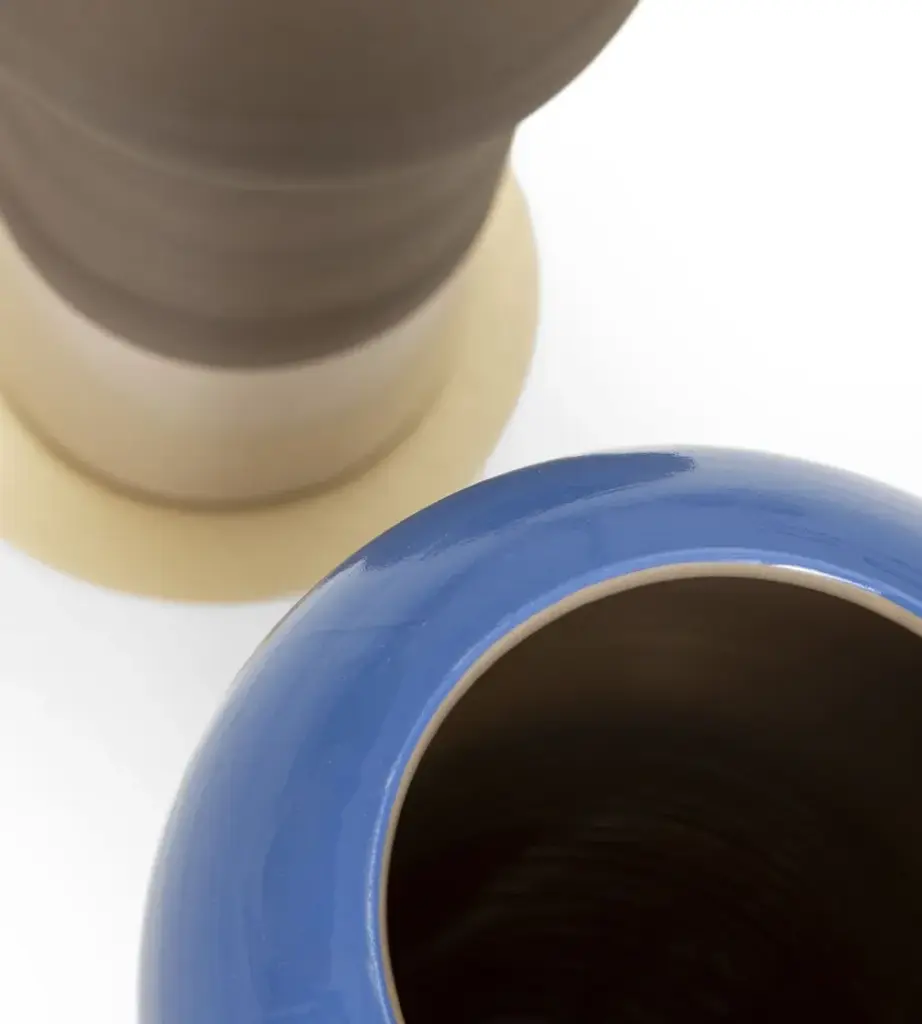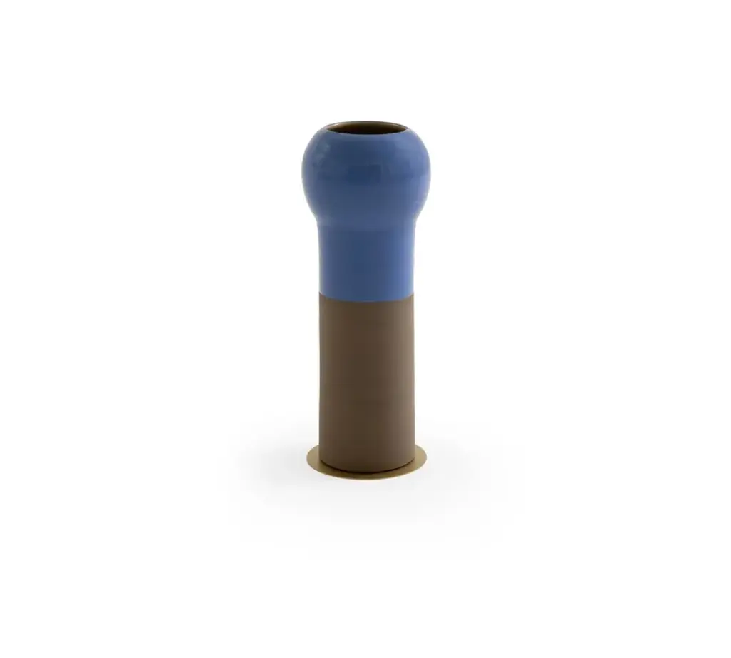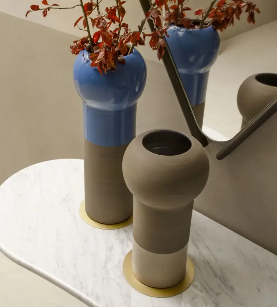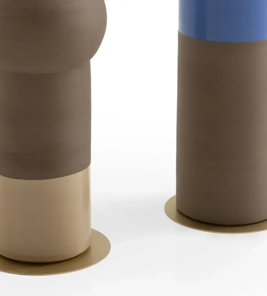 Ibisco Jardin Arctique is a decorative vase in dark clay, wheel-thrown, with a glossy enamel insert and glossy enamel interior. Brushed metal base, brass-colored finish.HM.IBA.DM.AZ.DV.AS: Glossy Azure enamel insert, glossy Dove Gray enamel interior.HM.IBA.DP.AZ.DV.AS: Glossy Dove Gray enamel insert, glossy Azure enamel interior.