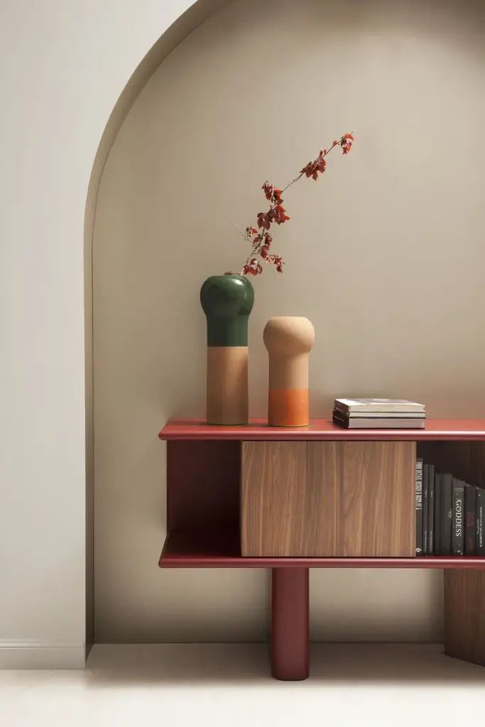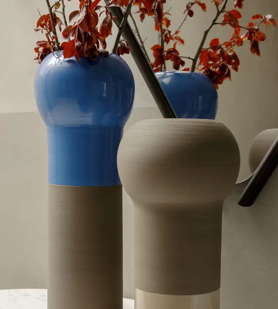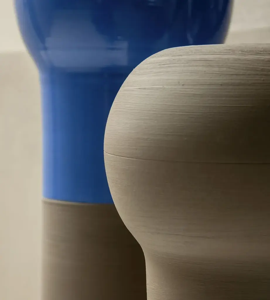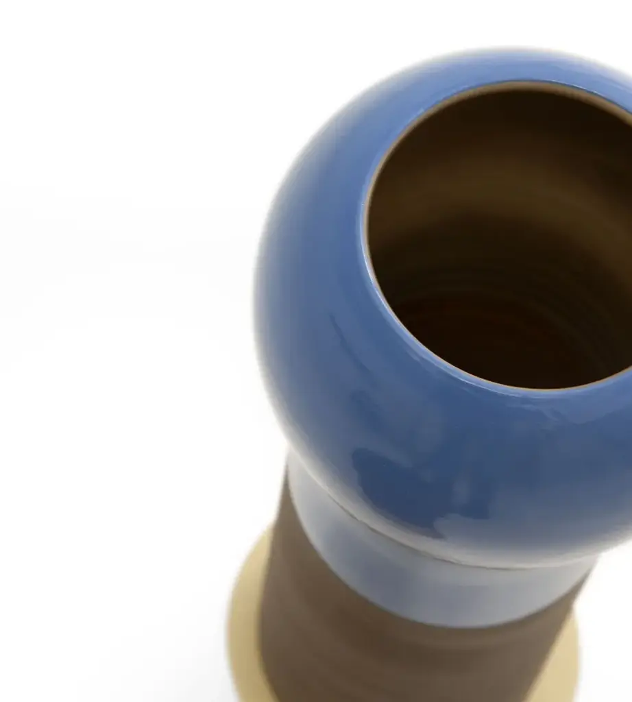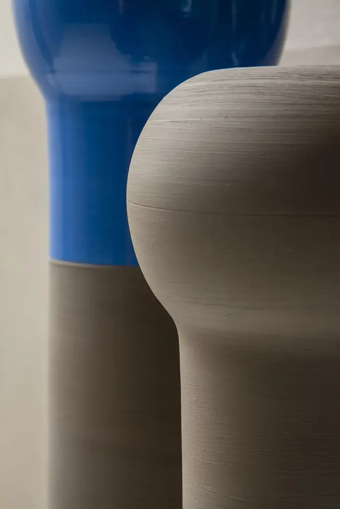 Ibisco Jardin Arctique is a decorative vase in dark clay, wheel-thrown, with a glossy enamel insert and glossy enamel interior. Brushed metal base, brass-colored finish.HM.IBA.DM.AZ.DV.AS: Glossy Azure enamel insert, glossy Dove Gray enamel interior.HM.IBA.DP.AZ.DV.AS: Glossy Dove Gray enamel insert, glossy Azure enamel interior.