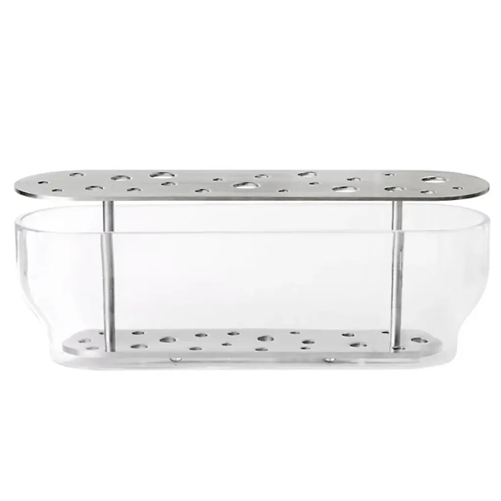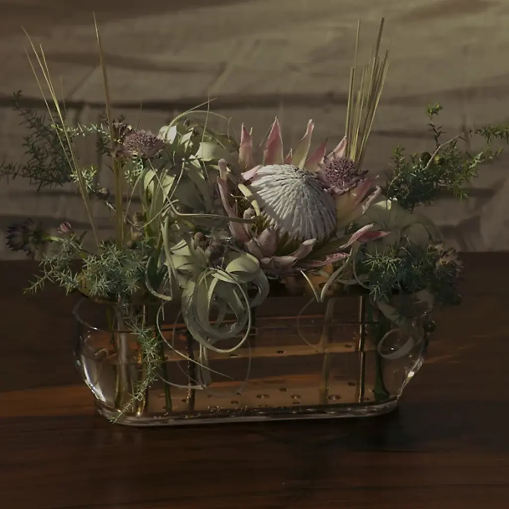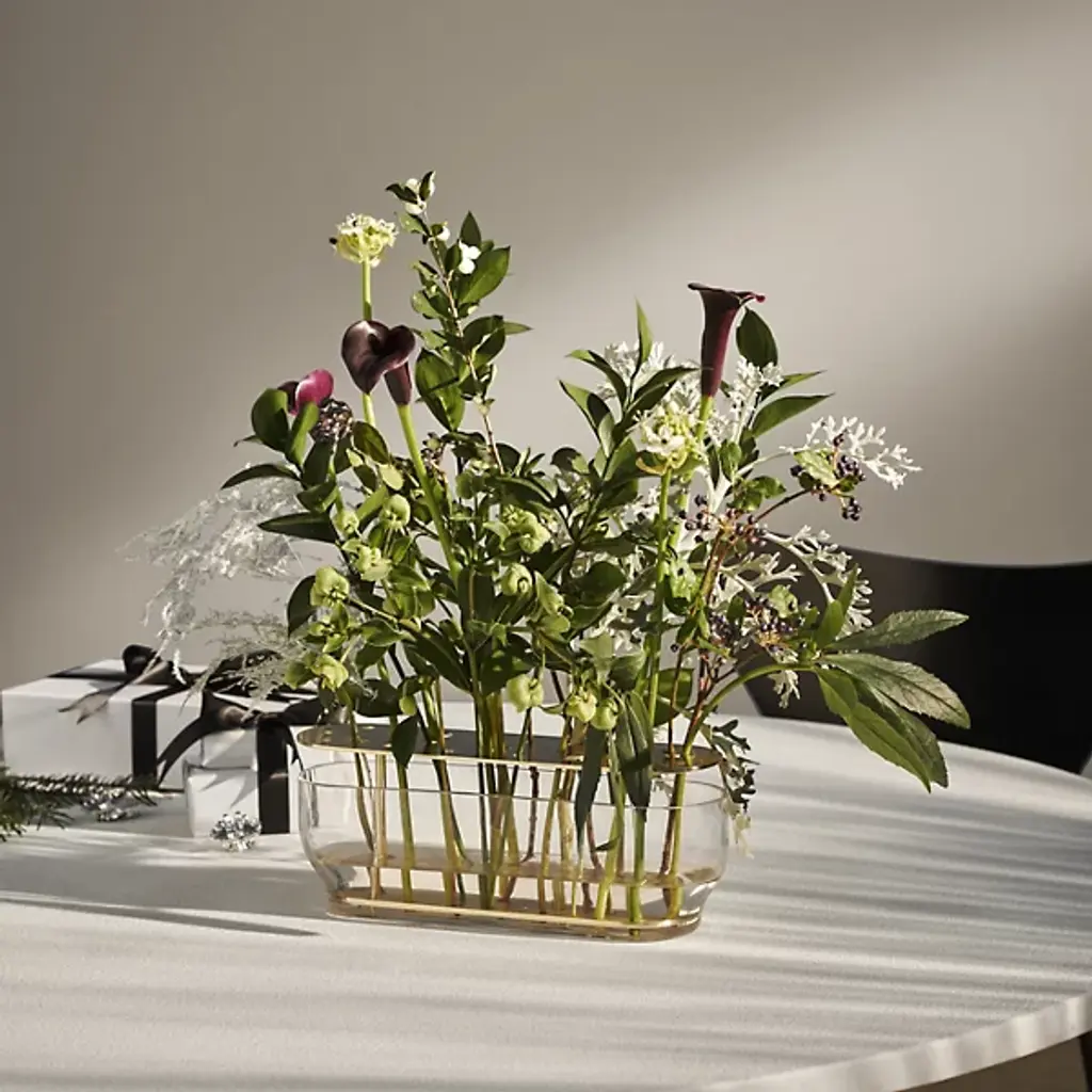 The Ikebana Long Vase from Fritz Hansen is an exquisite design by Jaime Hayon. This vase combines artistic elegance with functionality, making it a standout piece. Crafted from handblown glass, it’s delicate yet sturdy. Its elongated form is designed to showcase floral arrangements beautifully. A distinctive feature of this vase is the centrally placed addendum, available in either polished brass or stainless steel finish, which rests gracefully within the vase. This addendum includes strategically placed holes that provide support for the stems of your favorite flowers. It’s also Greenguard Certified, meeting strict low chemical emissions standards.