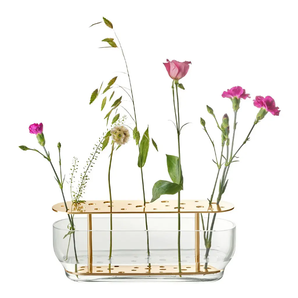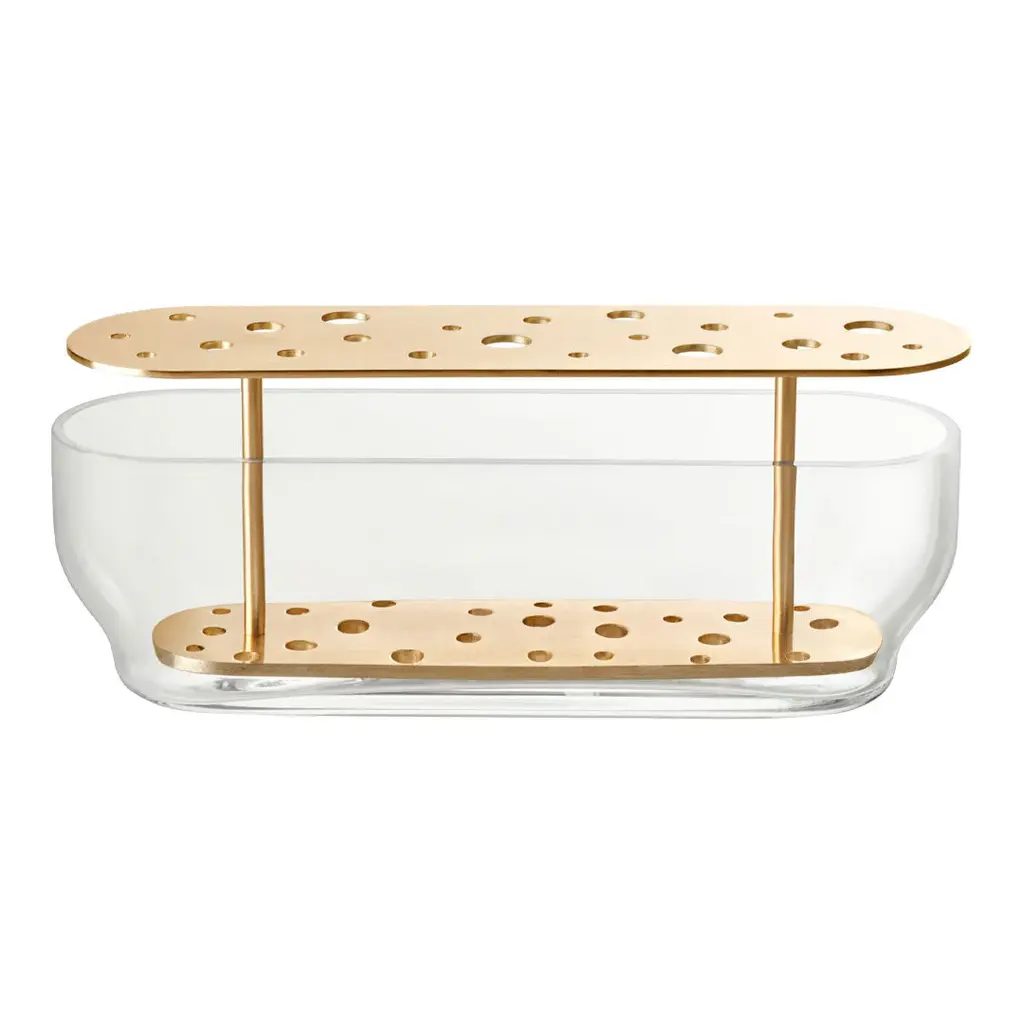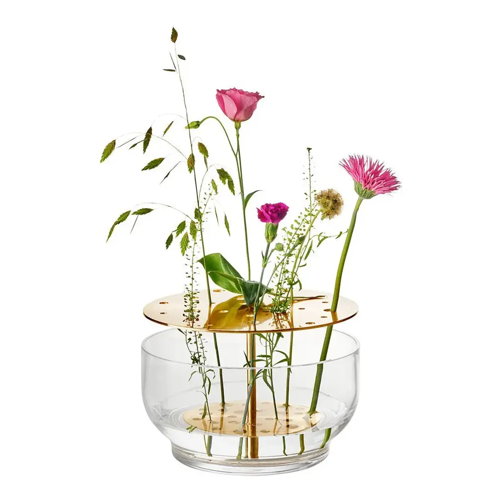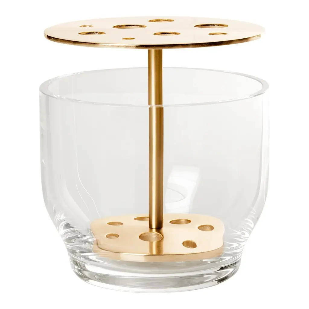The Fritz Hansen Ikebana Vase, a masterpiece by celebrated Spanish designer Jaime Hayon, reimagines the ancient Japanese art of flower arrangement for contemporary interiors. This sophisticated vessel pairs mouth-blown glass with a sculptural metal framework, available in either solid brass that develops a coveted patina over time, or timeless stainless steel. Unlike traditional vases that showcase only the flower heads, this artisanal piece honors the complete natural beauty of each stem. The innovative freestanding structure, punctuated with precisely sized openings, allows for mindful arrangement that transforms single blooms or minimal stems into living art. The handcrafted glass vessel, produced by master glassblowers, provides a crystal-clear stage for your botanical compositions. Available in three distinct profiles – a statement-making large size (9.4" diameter), an intimate small version (4.7" diameter), or an elegantly elongated form (13.2" length) – this Fritz Hansen creation adapts to various interior settings while maintaining its minimalist grace. Each piece reflects Hayon's signature ability to blend playful creativity with refined Scandinavian design sensibilities, resulting in a versatile vessel that serves as both a functional object and contemporary sculpture, even when not in use.
