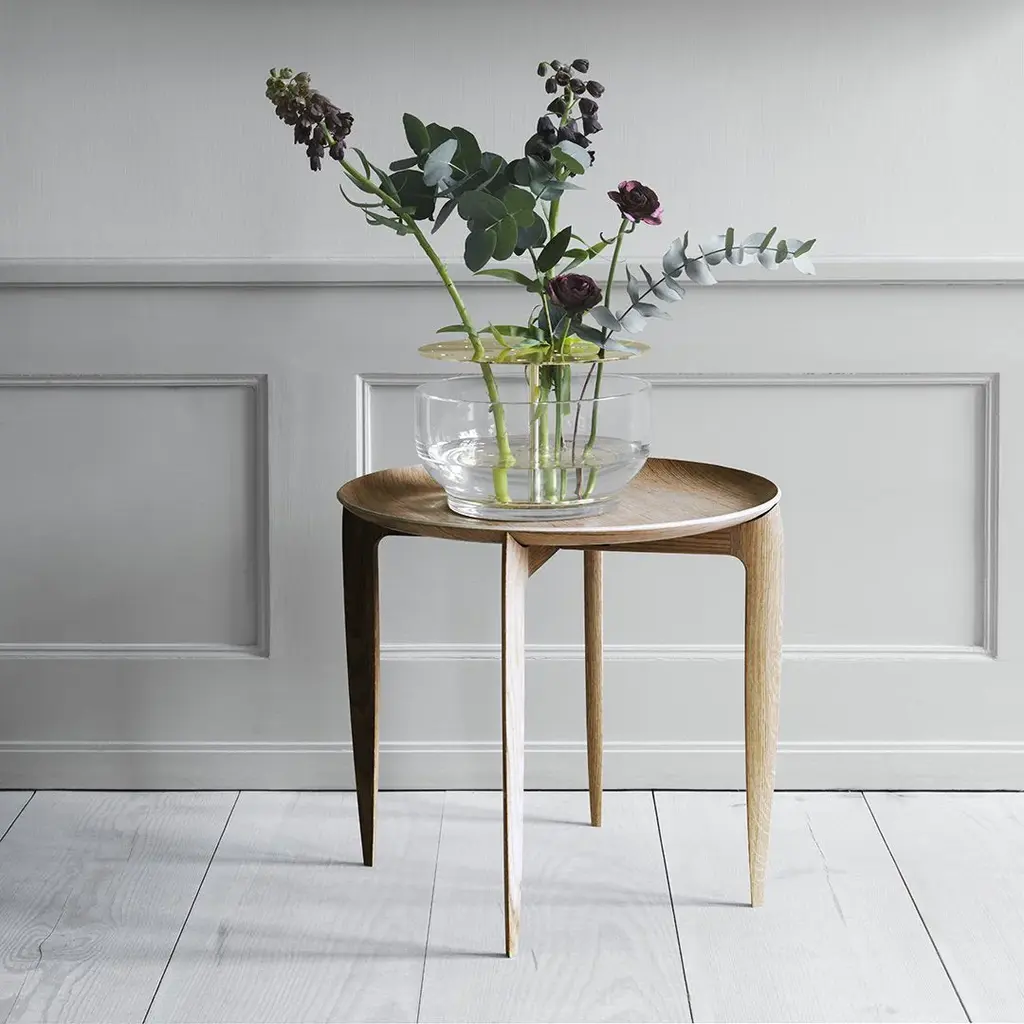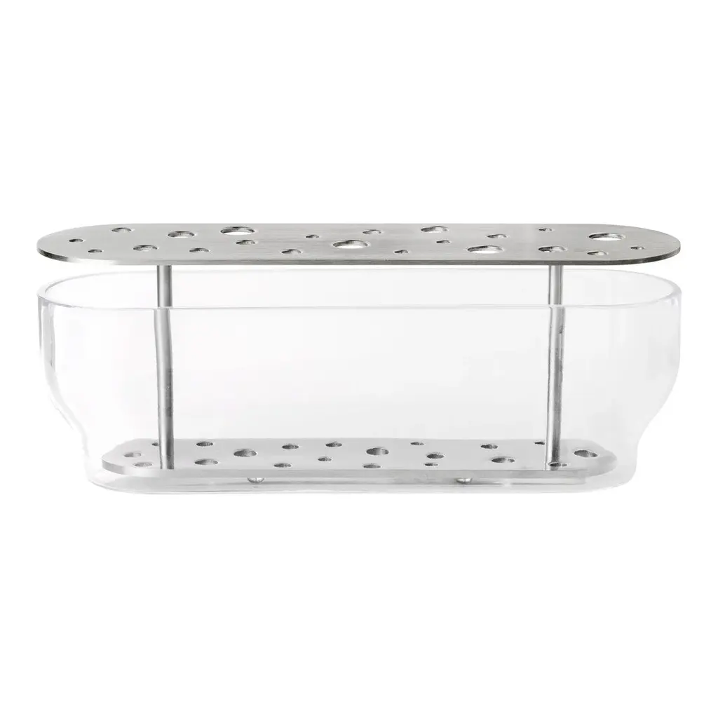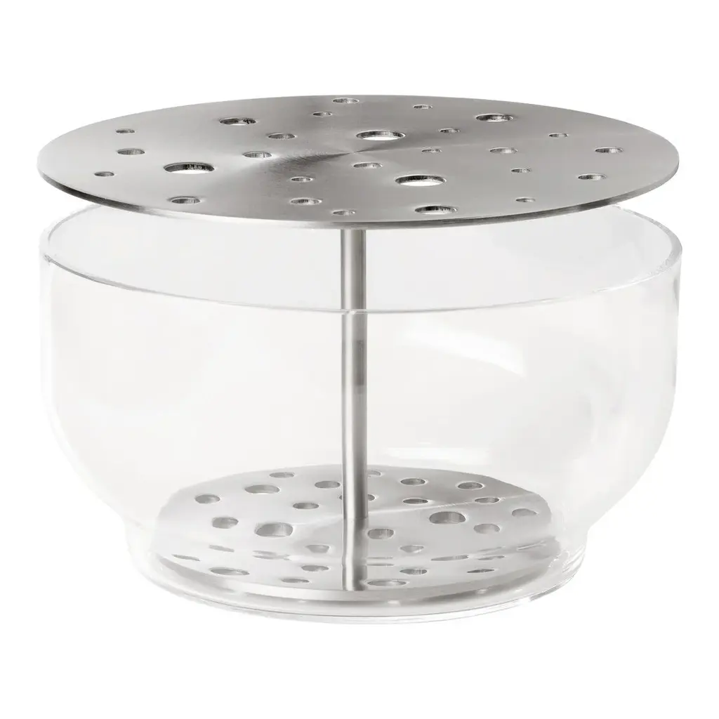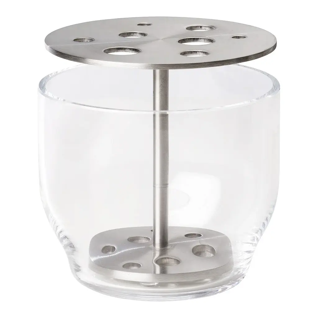 The Fritz Hansen Ikebana Vase, a masterpiece by celebrated Spanish designer Jaime Hayon, reimagines the ancient Japanese art of flower arrangement for contemporary interiors. This sophisticated vessel pairs mouth-blown glass with a sculptural metal framework, available in either solid brass that develops a coveted patina over time, or timeless stainless steel. Unlike traditional vases that showcase only the flower heads, this artisanal piece honors the complete natural beauty of each stem. The innovative freestanding structure, punctuated with precisely sized openings, allows for mindful arrangement that transforms single blooms or minimal stems into living art. The handcrafted glass vessel, produced by master glassblowers, provides a crystal-clear stage for your botanical compositions. Available in three distinct profiles – a statement-making large size (9.4" diameter), an intimate small version (4.7" diameter), or an elegantly elongated form (13.2" length) – this Fritz Hansen creation adapts to various interior settings while maintaining its minimalist grace. Each piece reflects Hayon's signature ability to blend playful creativity with refined Scandinavian design sensibilities, resulting in a versatile vessel that serves as both a functional object and contemporary sculpture, even when not in use.