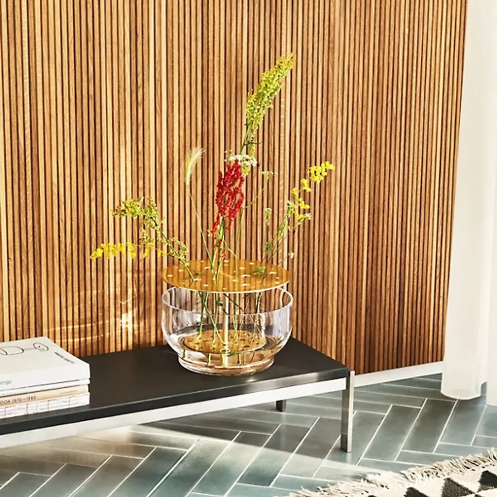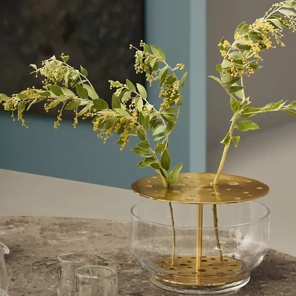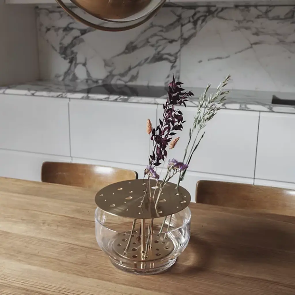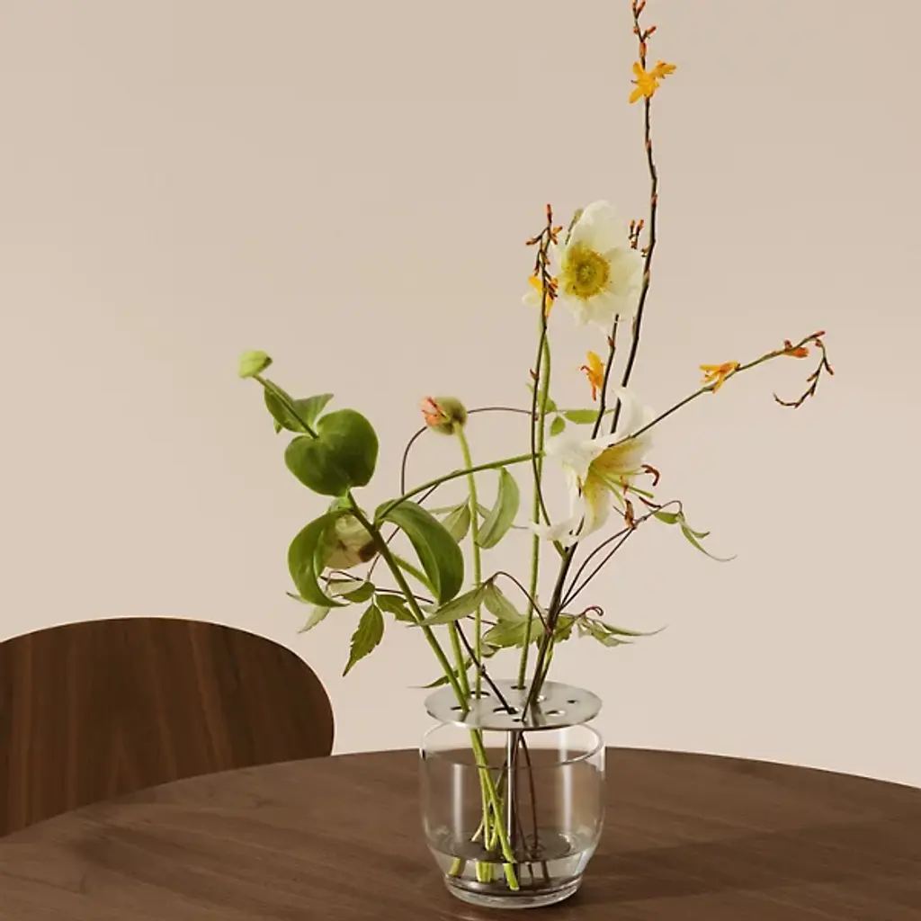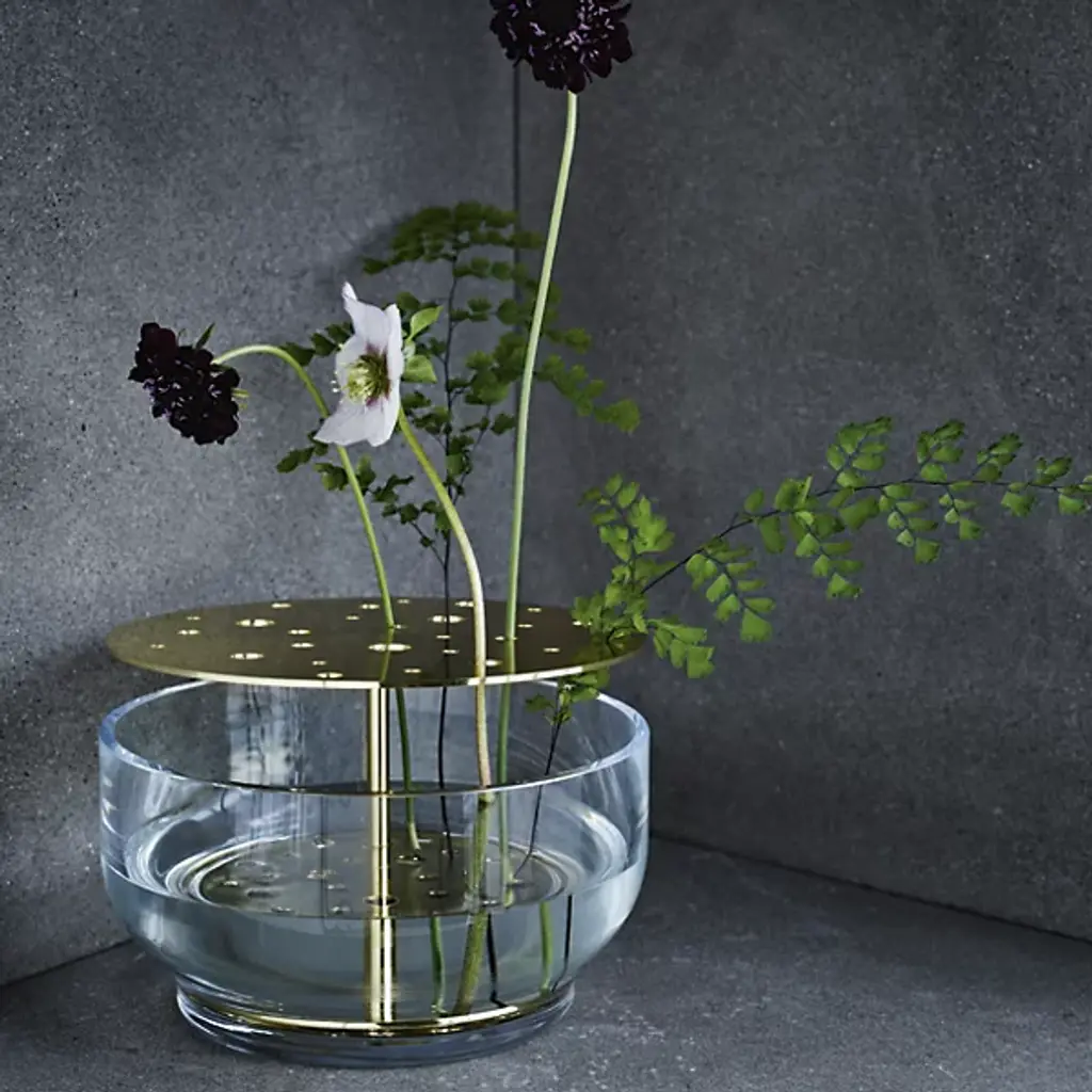 The Ikebana Vase from Fritz Hansen combines artisanal modern aesthetics with Japanese Minimalism. It is designed by Jaime Hayon and is elegantly crafted with mouth-blown glass, demonstrating meticulous attention to detail. Standing inside the vase is a stainless steel or brass-plated addendum with a rounded crown and base. Each segment features holes of various sizes, offering support for the stems of your favorite flowers and giving you a customized arrangement that you and your guests will love.