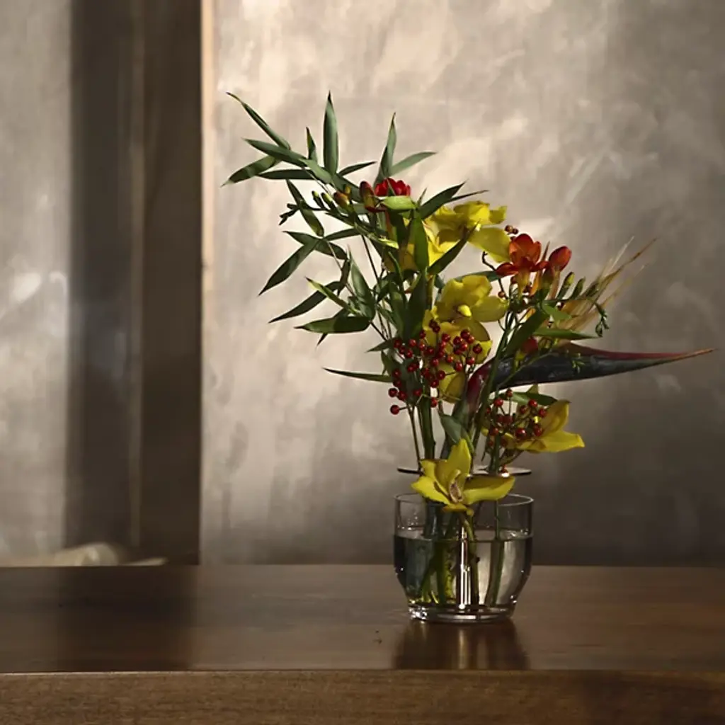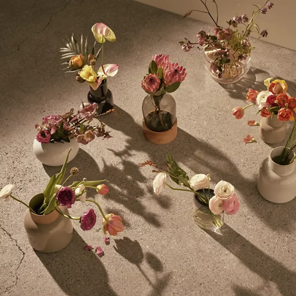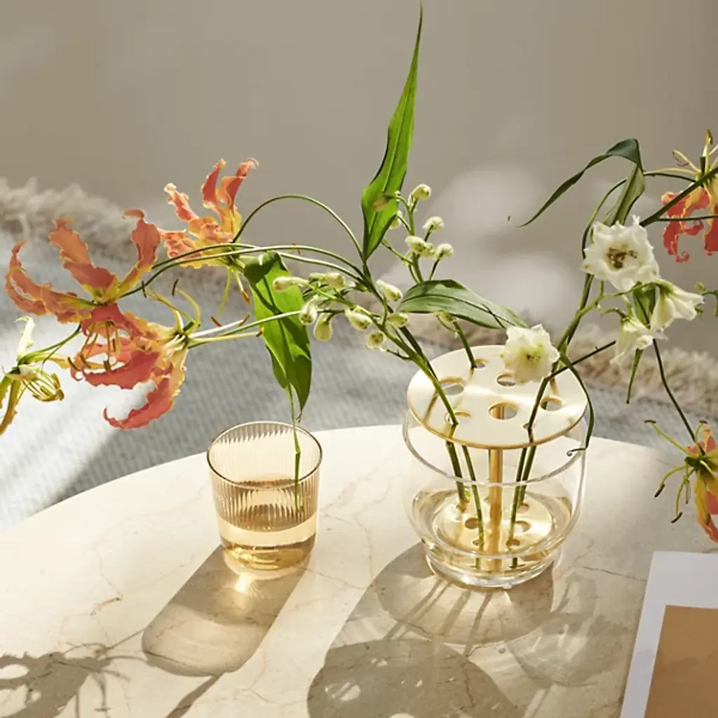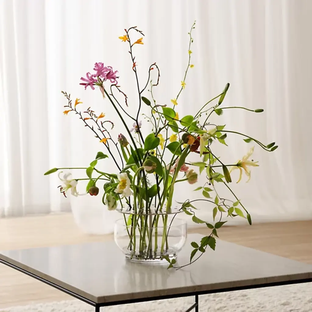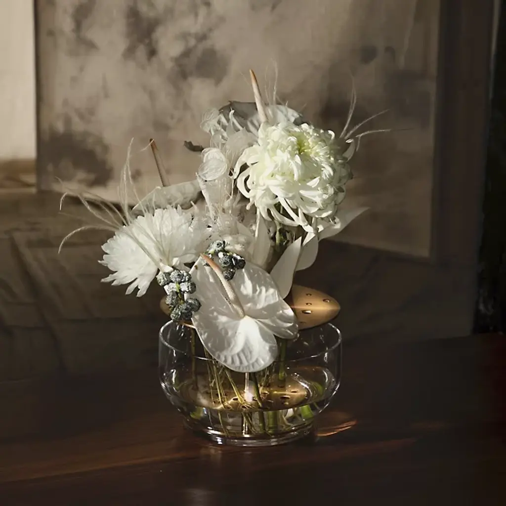 The Ikebana Vase from Fritz Hansen combines artisanal modern aesthetics with Japanese Minimalism. It is designed by Jaime Hayon and is elegantly crafted with mouth-blown glass, demonstrating meticulous attention to detail. Standing inside the vase is a stainless steel or brass-plated addendum with a rounded crown and base. Each segment features holes of various sizes, offering support for the stems of your favorite flowers and giving you a customized arrangement that you and your guests will love.