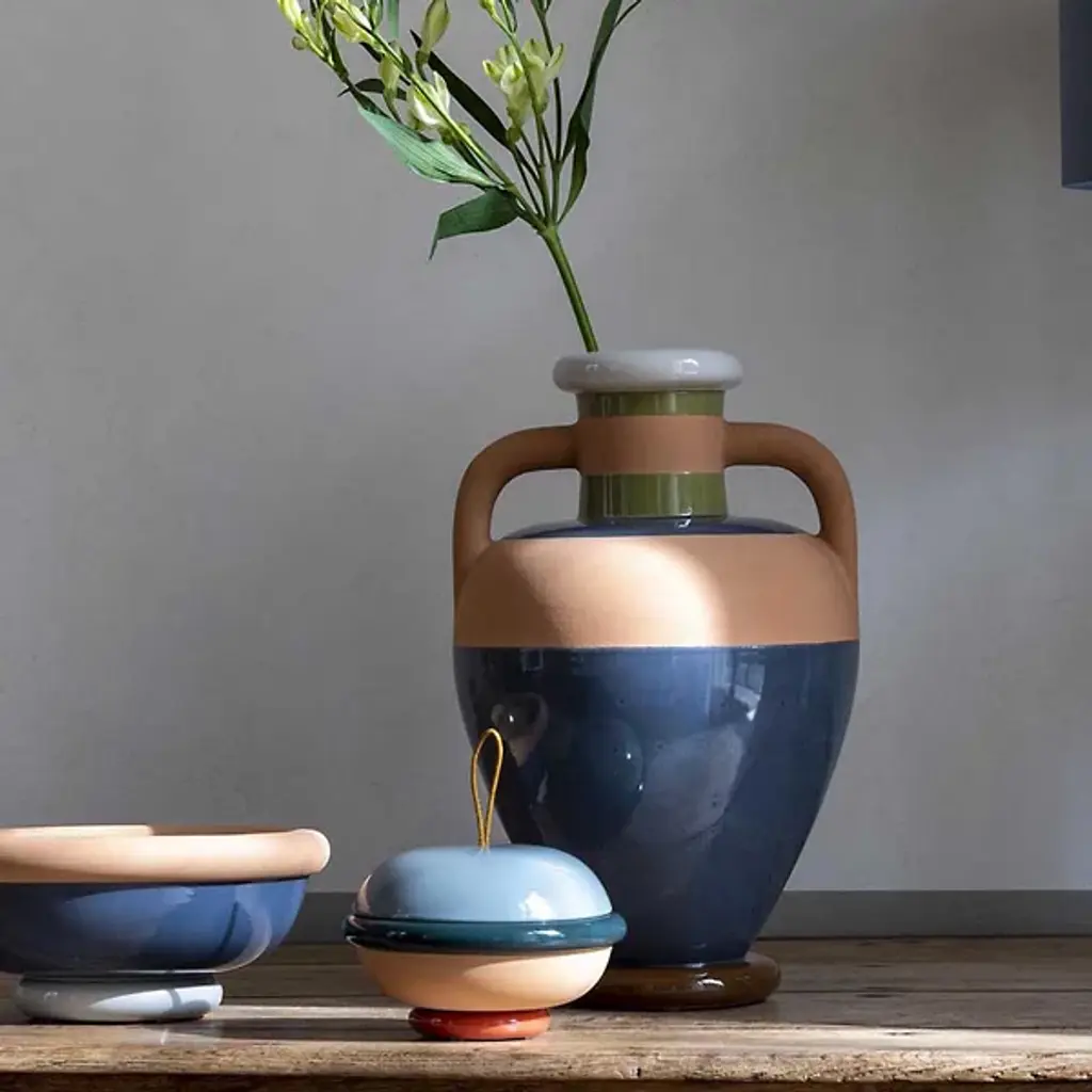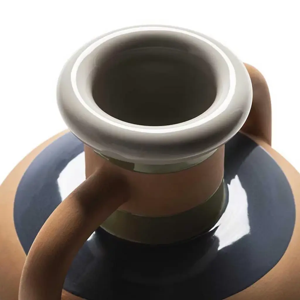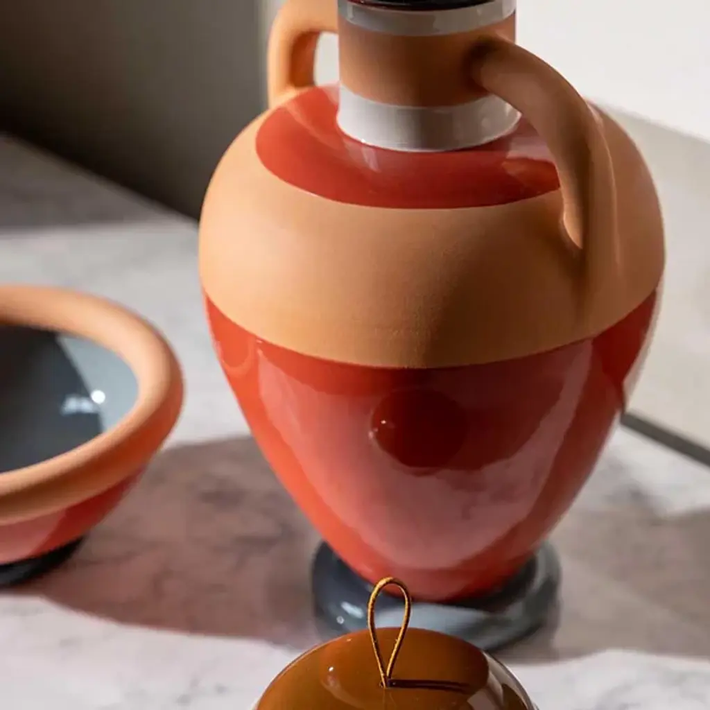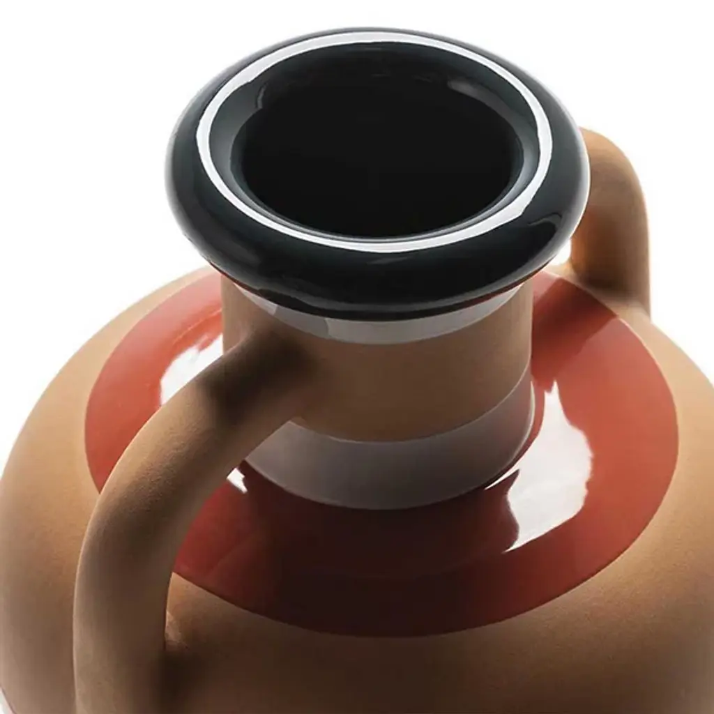 The hand-turned and hand-painted Ikiperu Vase from Poltrona Frau draws inspiration from the shape of ancient Etruscan decorative objects. Its rounded form features horizontal bands that blend glazed and unglazed ceramic, creating a striking multi-sensory effect. The Ikiperu Vase brings timeless elegance to any space with Pelle Frau leather shades.