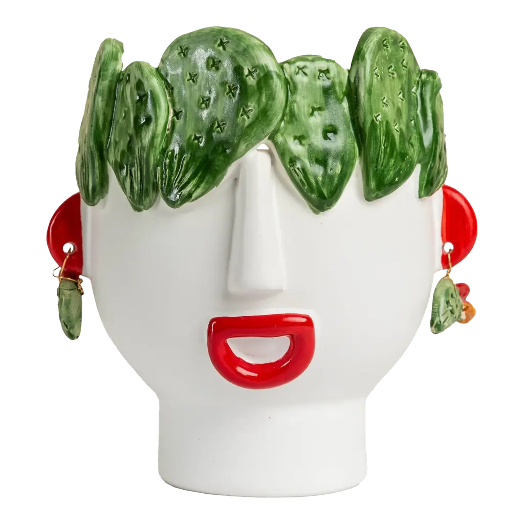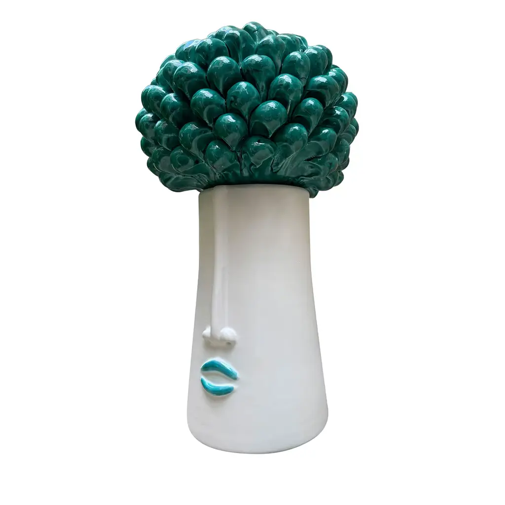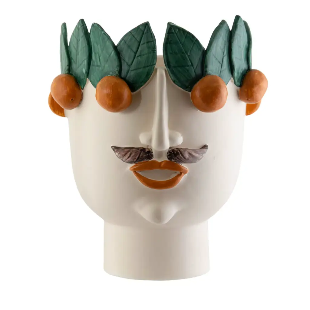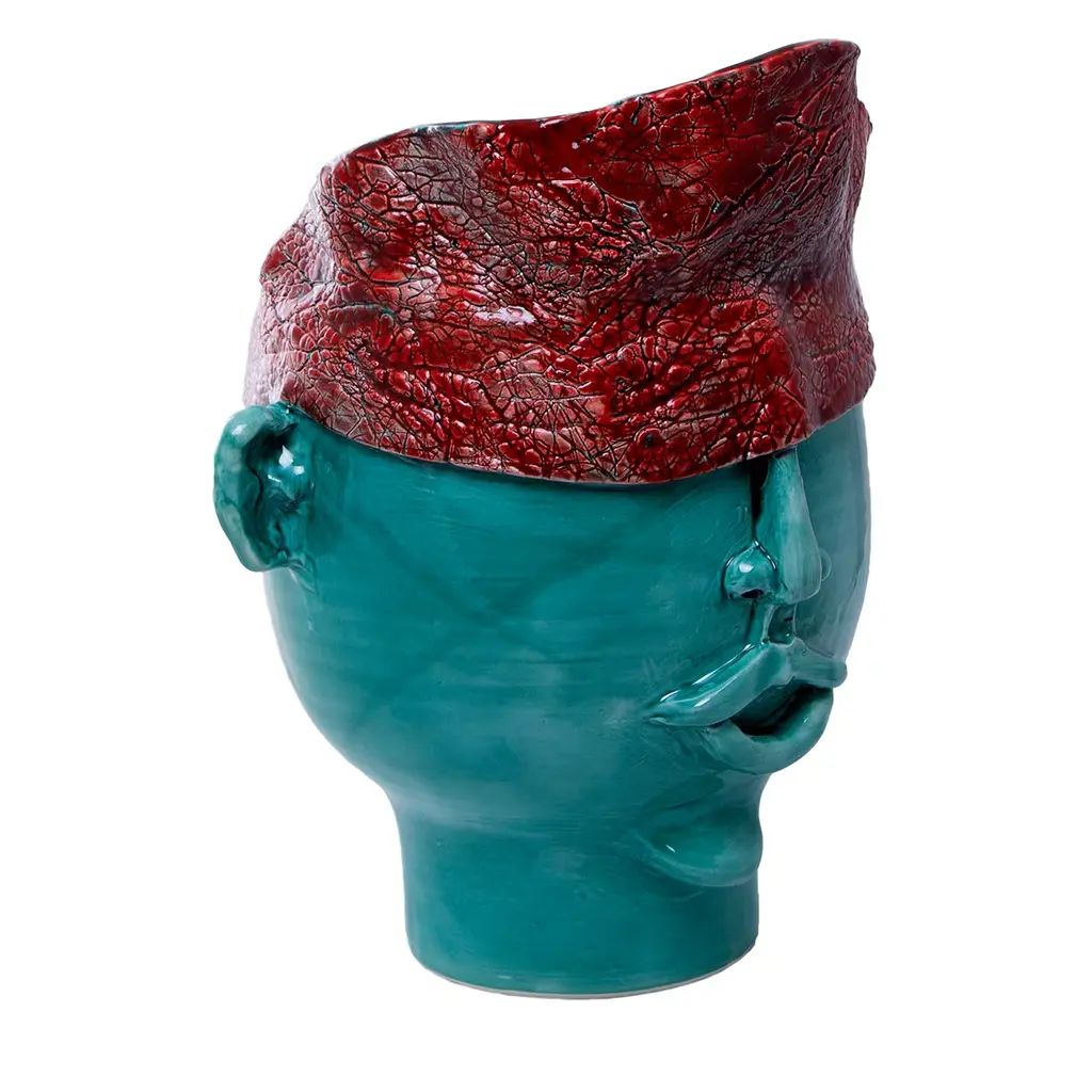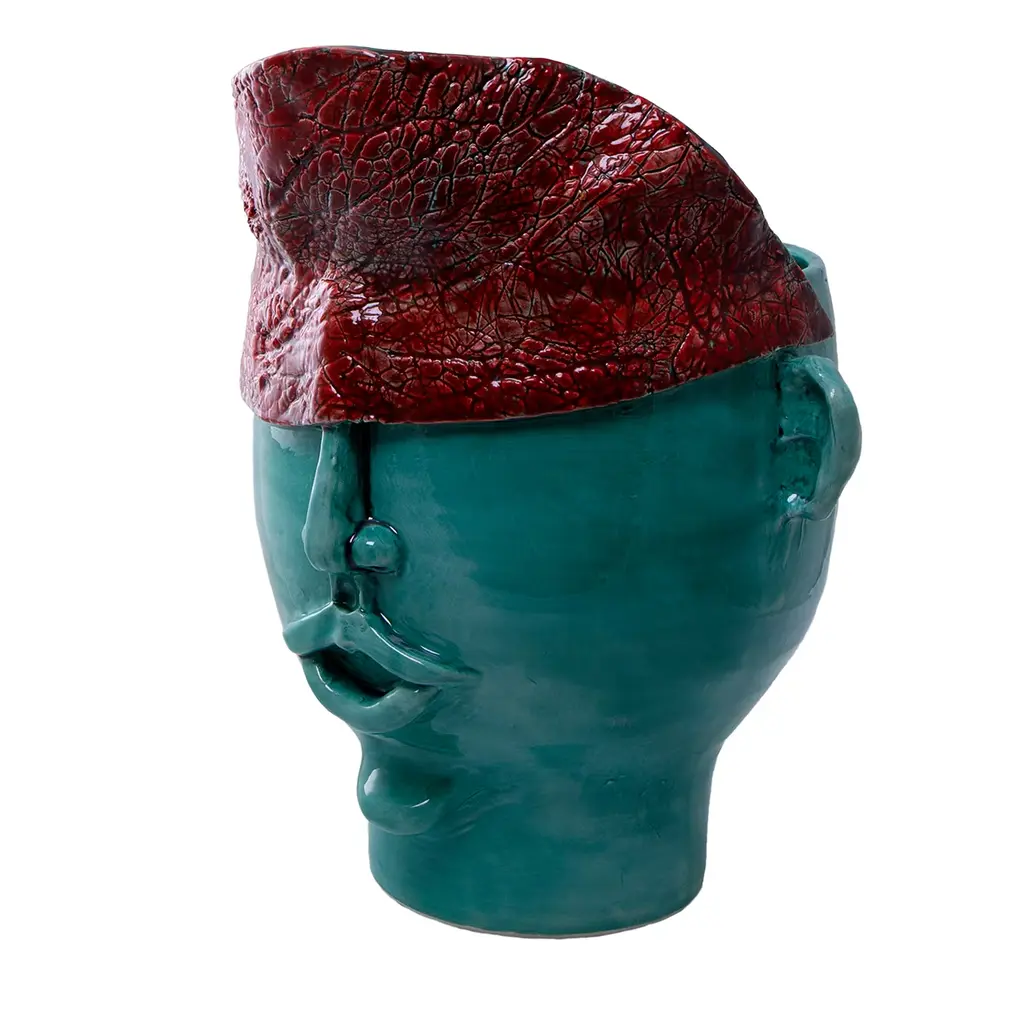 Handmade ceramic head, white clay and crystalline colored. It can contain water and be used for decoration or for plant holders or flower holders.