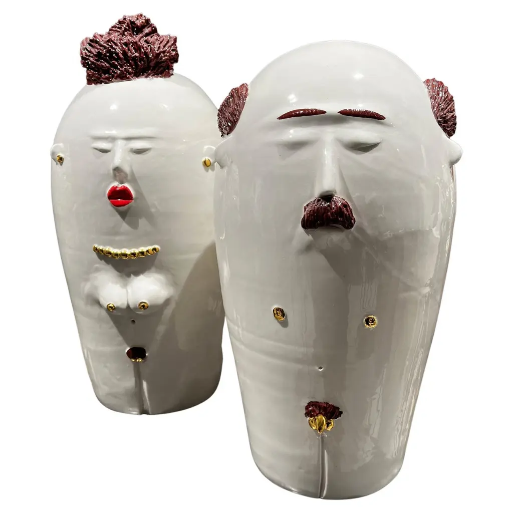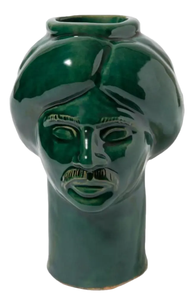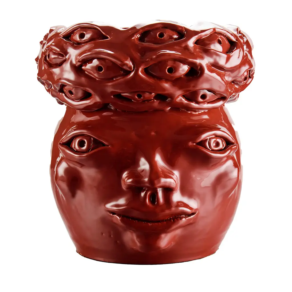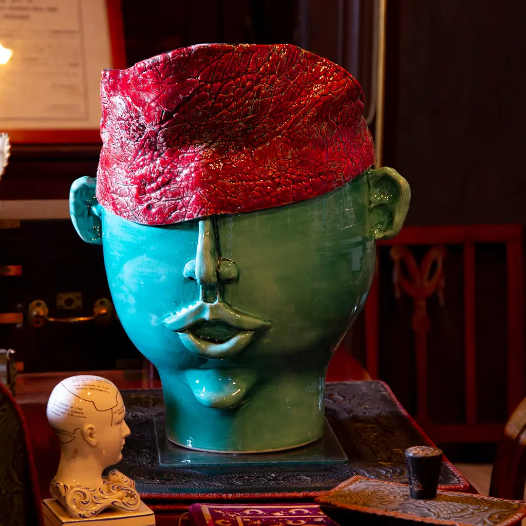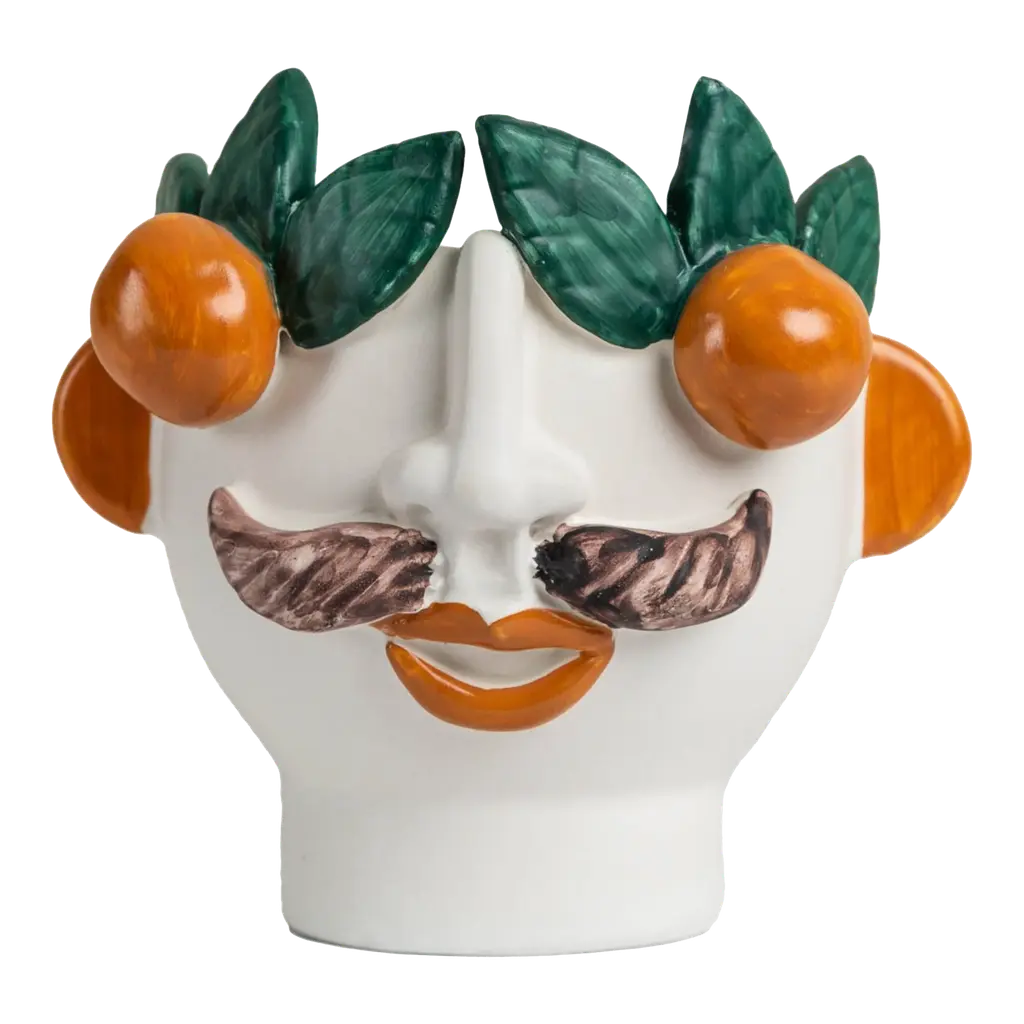Handmade ceramic head, white clay and crystalline colored. It can contain water and be used for decoration or for plant holders or flower holders.