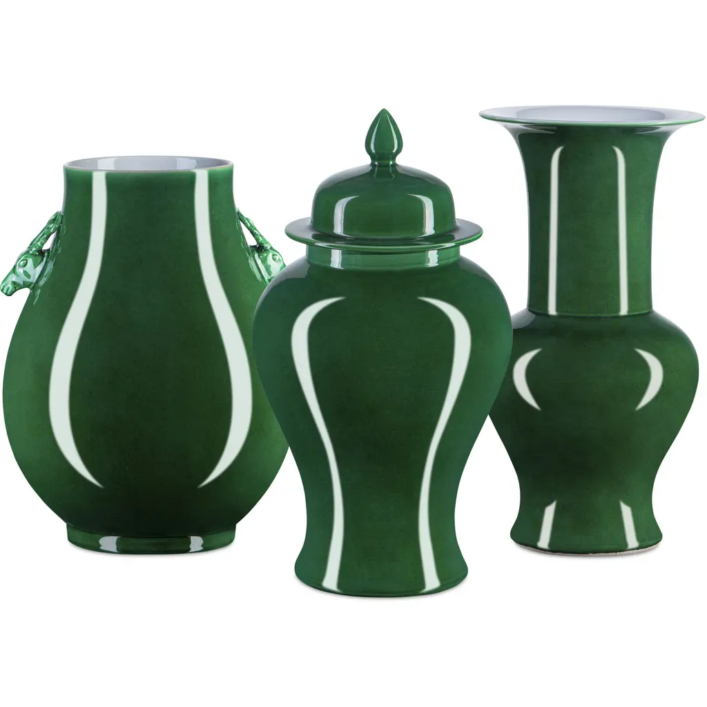 The Imperial Green Corolla Vase is a decorative green vase that has its roots far in the past. The Imperial label is apropos for the porcelain vase because this piece is made of clay sourced from the area surrounding the kilns that produced objects for the Imperial estate during the heyday of the dynasties. The formulas to achieve the particular green on this vase’s surface is a secret one guarded by ceramicist families devoted to the single color. The deep green hue was originally produced exclusively for those in high society.