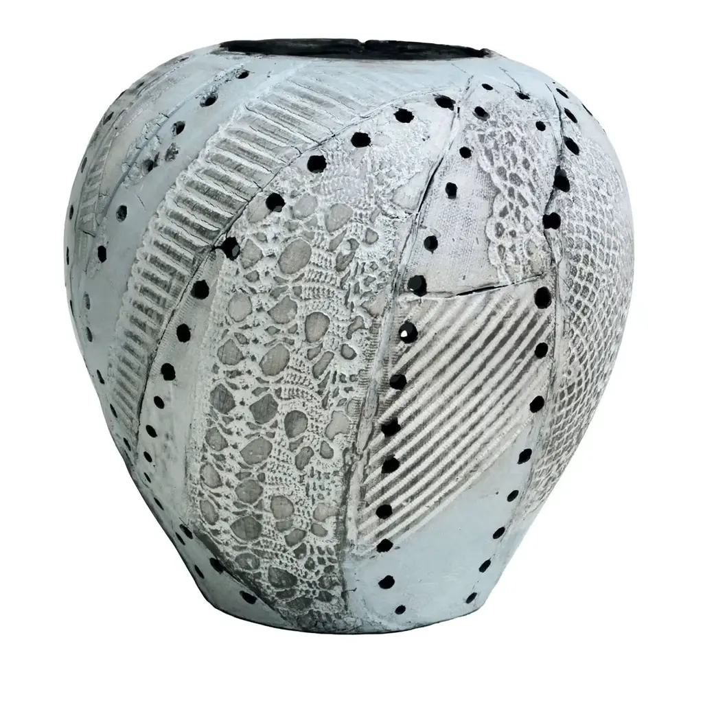 This lantern vase has a dual function: it can be a striking outdoor or indoor lampshade, but it can also be set up as an electrified hanging lamp. It can be a single evocative vase object or a luminous sculptural group. The material used is a dark-colored Umbrian terracotta, texturized with fabric and wood stamps and finished with a gray slip patina. Suitable for outdoor use.