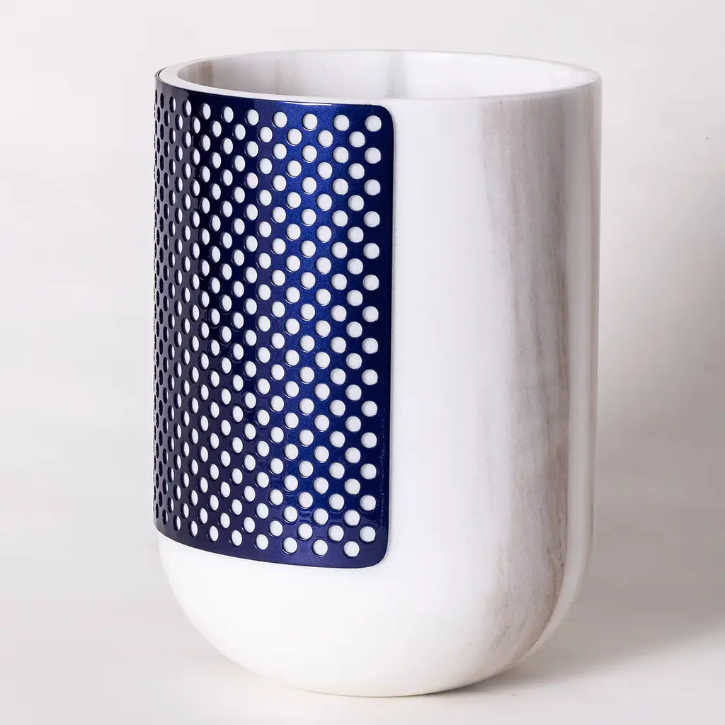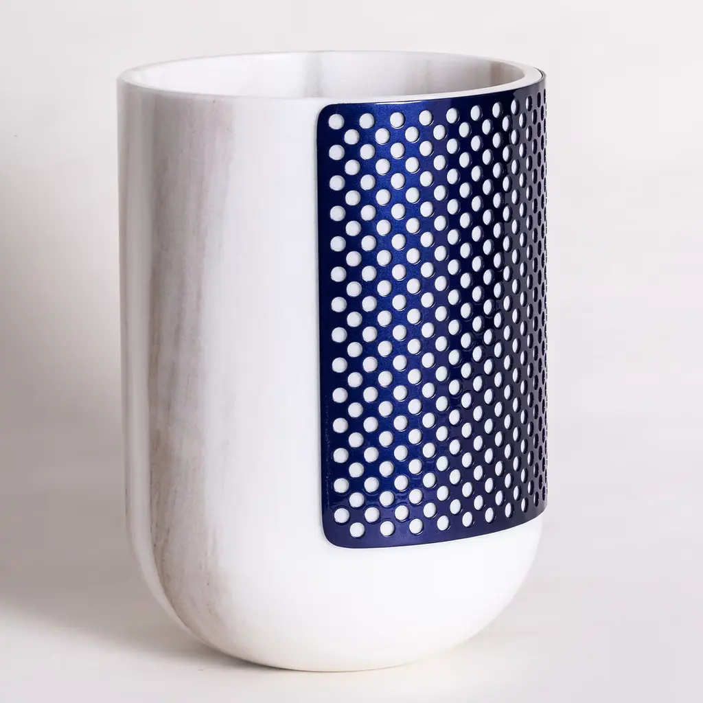 Superbly handcrafted of White Lasa Covelano Marble, this sleek cylindrical vase features an exquisitely contrasting decoration composed of a dark blue metal grid. An iconic design for a contemporary entryway console or living room sideboard, it will make for an exquisite housewarming or holiday gift for a design aficionado.