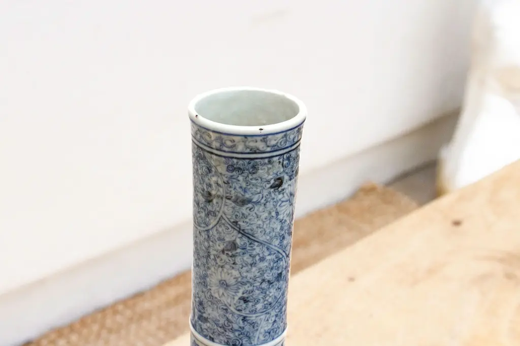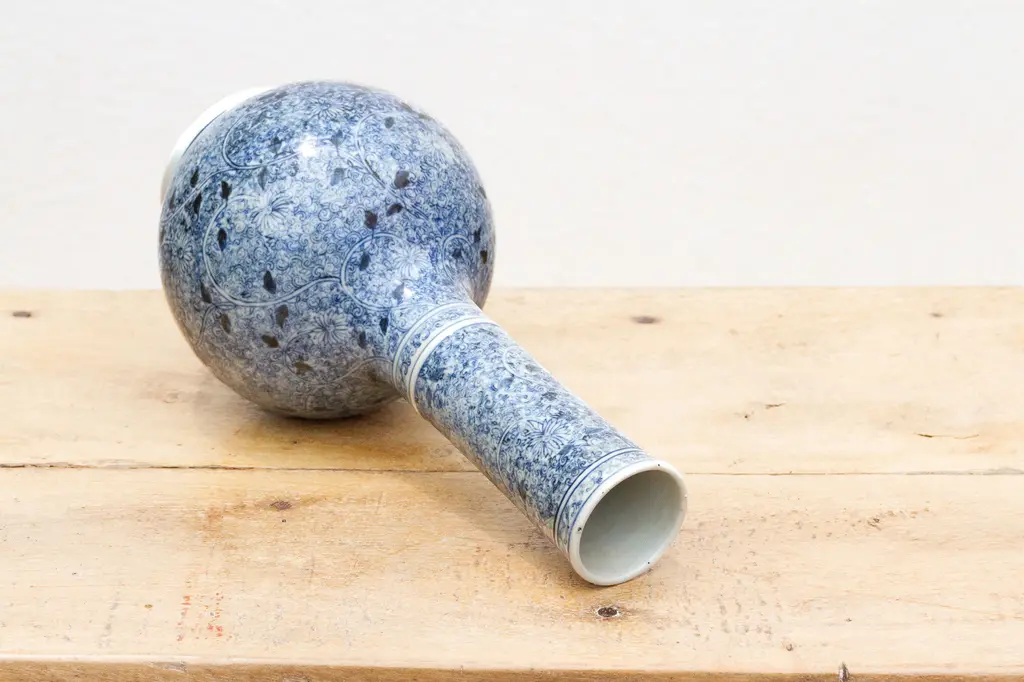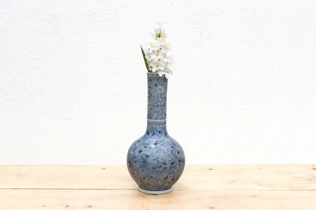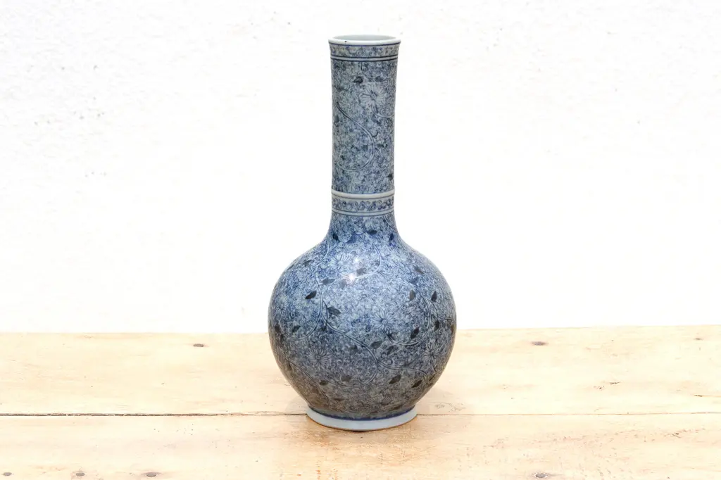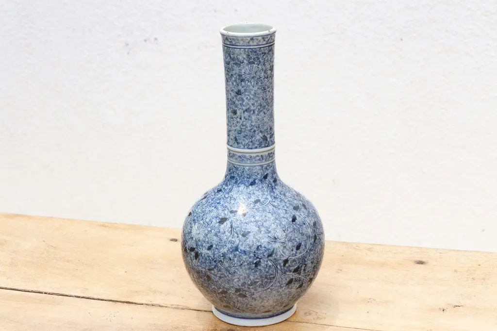 This 11-inch tall, 6-inch wide porcelain vase showcases refined Asian craftsmanship. Featuring a soft mottled blue and white glaze, often called “powder blue,” it offers a serene visual texture. Its globular body and slender neck reflect classic Chinese design. Made in China, this elegant piece serves as a sophisticated accent—ideal for displaying a single flower or as a striking standalone display on a shelf or console.
