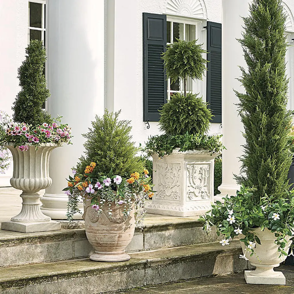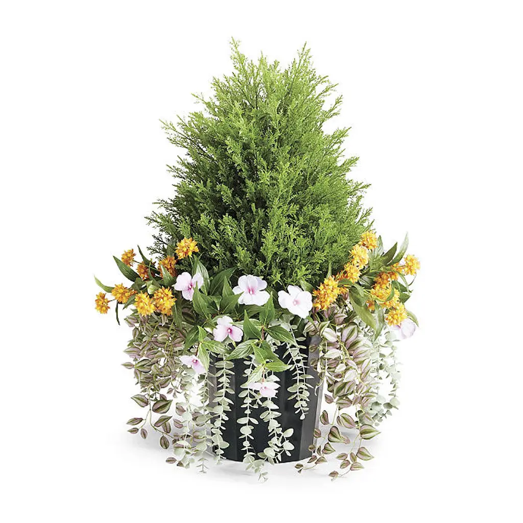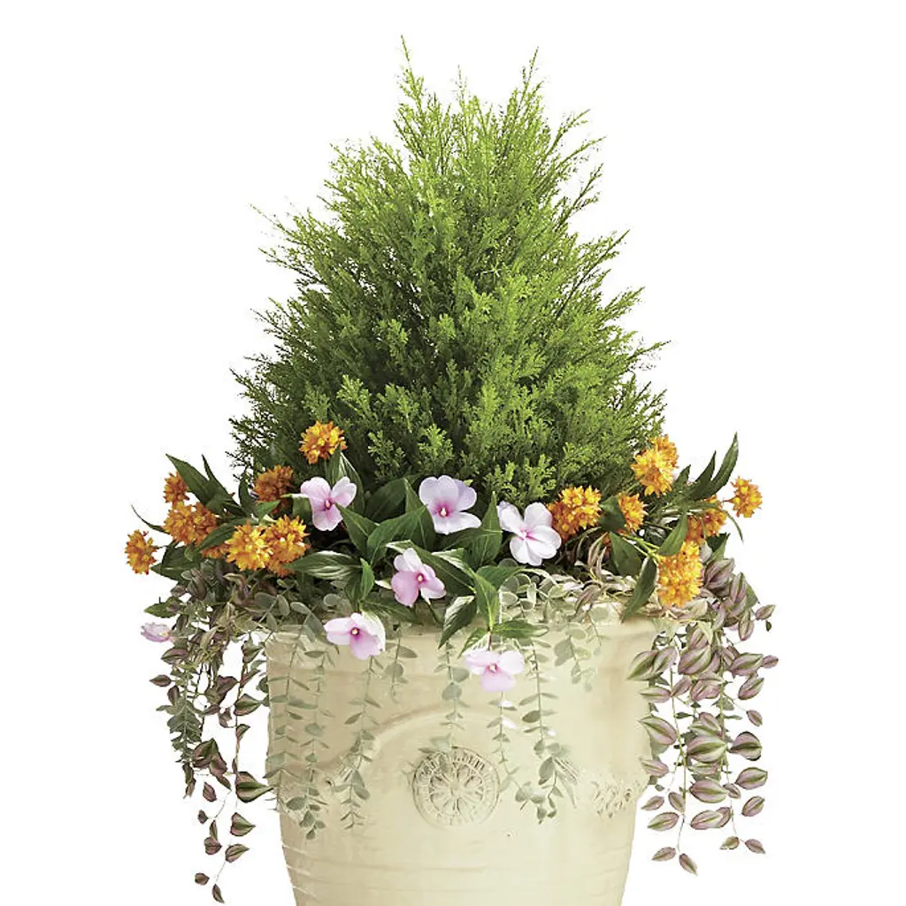 Our Indoor/Outdoor Cypress Floral Urn Filler is exquisitely crafted to mimic real foliage and densely arranged for fullness from any angle. The lifelike cypress tree is encircled by colorful impatiens and butterfly milkweed, as well as cascading eucalyptus leaves and variegated tradescantia. Arrives in a black nursery pot ready to be placed in your favorite planter or urn.For indoor or outdoor useLifelike faux foliageBlack plastic nursery pot (11-1/2" dia. x 11-1/4"H)UV treated to prevent fadingFluff and shape greenery after unpackingWipe with a soft, damp clothImported A Frontgate exclusive.At Frontgate, our primary focus is quality. We guarantee that every product we sell will stand up to the supreme test – our customers' satisfaction. To learn more about our policies, visit our Shipping & Processing, Returns & Exchanges and Warranty & Price Guarantee pages.Our Indoor/Outdoor Cypress Floral Urn Filler is exquisitely crafted to mimic real foliage and densely arranged for fullness from any angle. The lifelike cypress tree is encircled by colorful impatiens and butterfly milkweed, as well as cascading eucalyptus leaves and variegated tradescantia. Arrives in a black nursery pot ready to be placed in your favorite planter or urn.For indoor or outdoor useLifelike faux foliageBlack plastic nursery pot (11-1/2" dia. x 11-1/4"H)UV treated to prevent fadingFluff and shape greenery after unpackingWipe with a soft, damp clothImported A Frontgate exclusive.At Frontgate, our primary focus is quality. We guarantee that every product we sell will stand up to the supreme test – our customers' satisfaction. To learn more about our policies, visit our Shipping & Processing, Returns & Exchanges and Warranty & Price Guarantee pages.