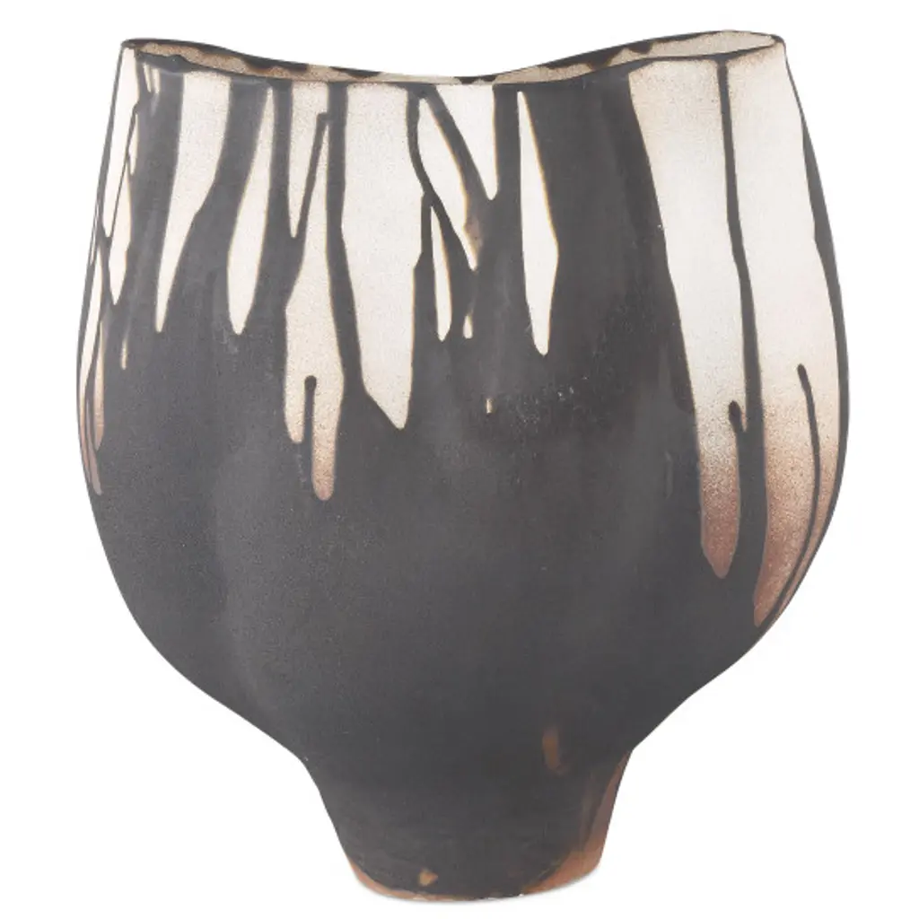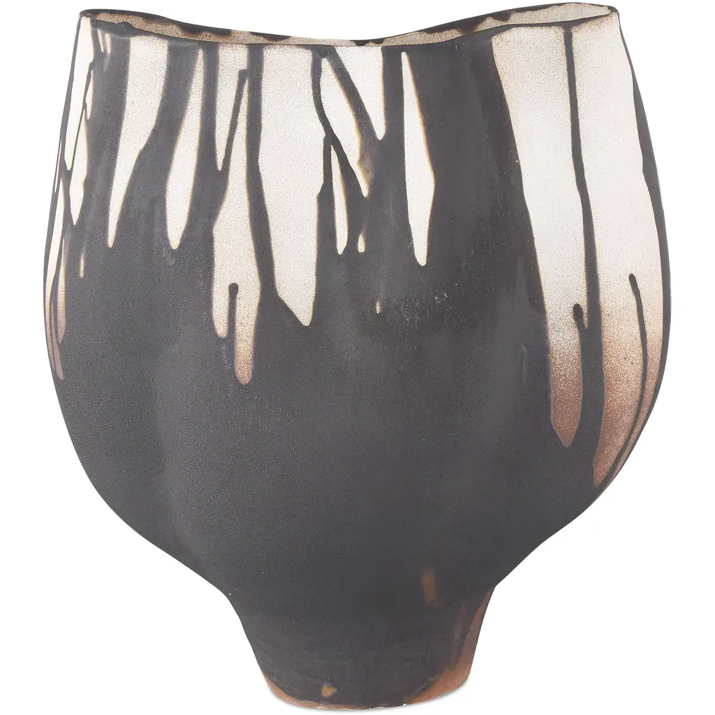 The dripped pattern on the surface of the Inoue Medium Vase was inspired by the art of Imperial Japan, particularly the rusticity of Zen ideals that arose during the Kamakura period. Made of porcelain, the black and off-white vessel is subtly rough to the touch and has a matte appearance. The gallery-worthy vase is hand-thrown and hand-decorated so the patterns will vary slightly.