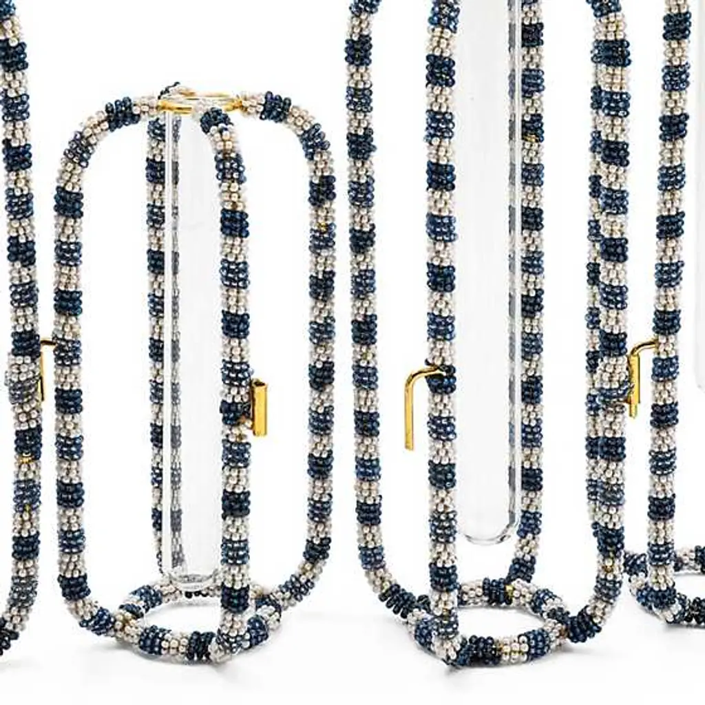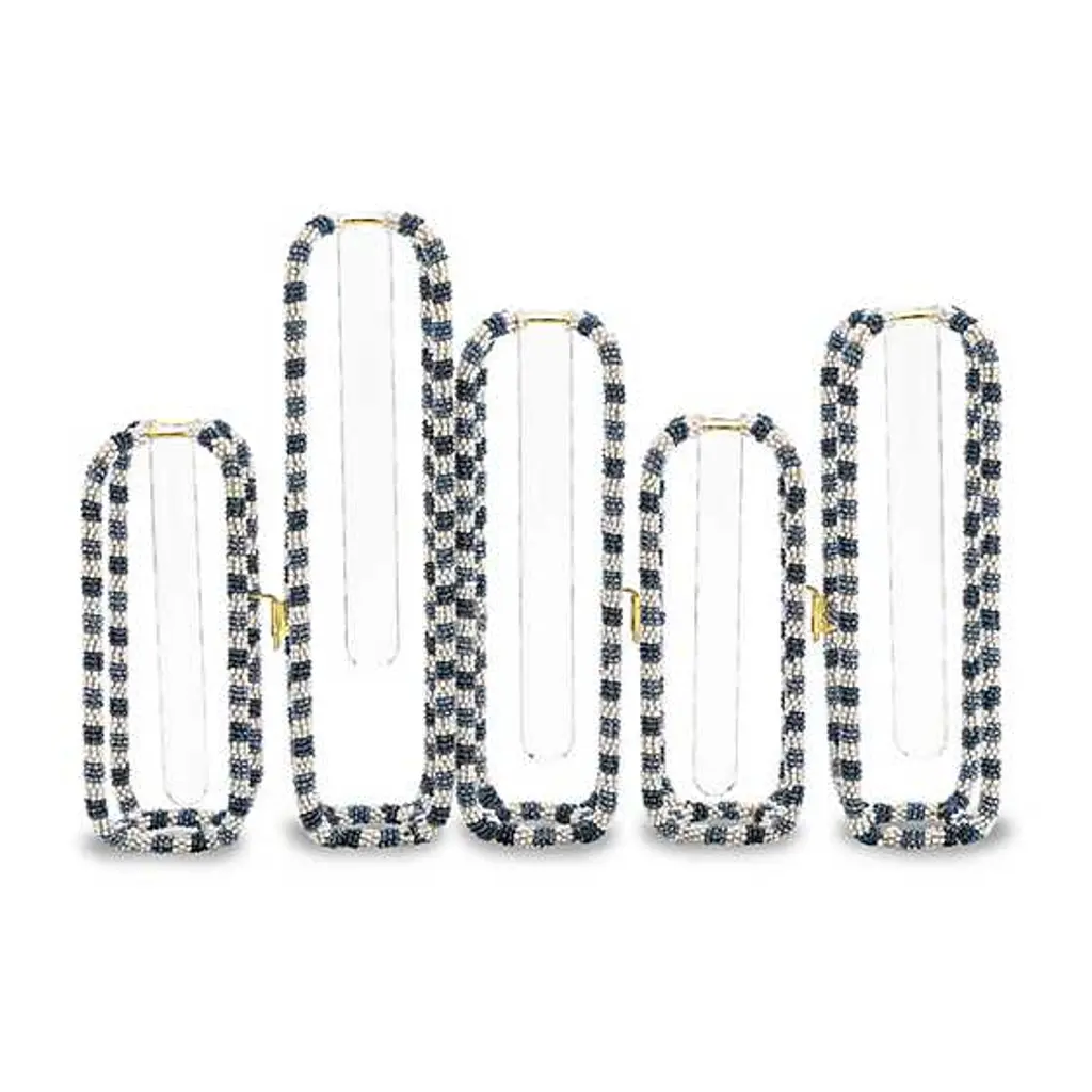 This unique set of five interlocking vases is made of metal frames decorated with blue and white beads that hold individual glass vials. Display them together or separately.