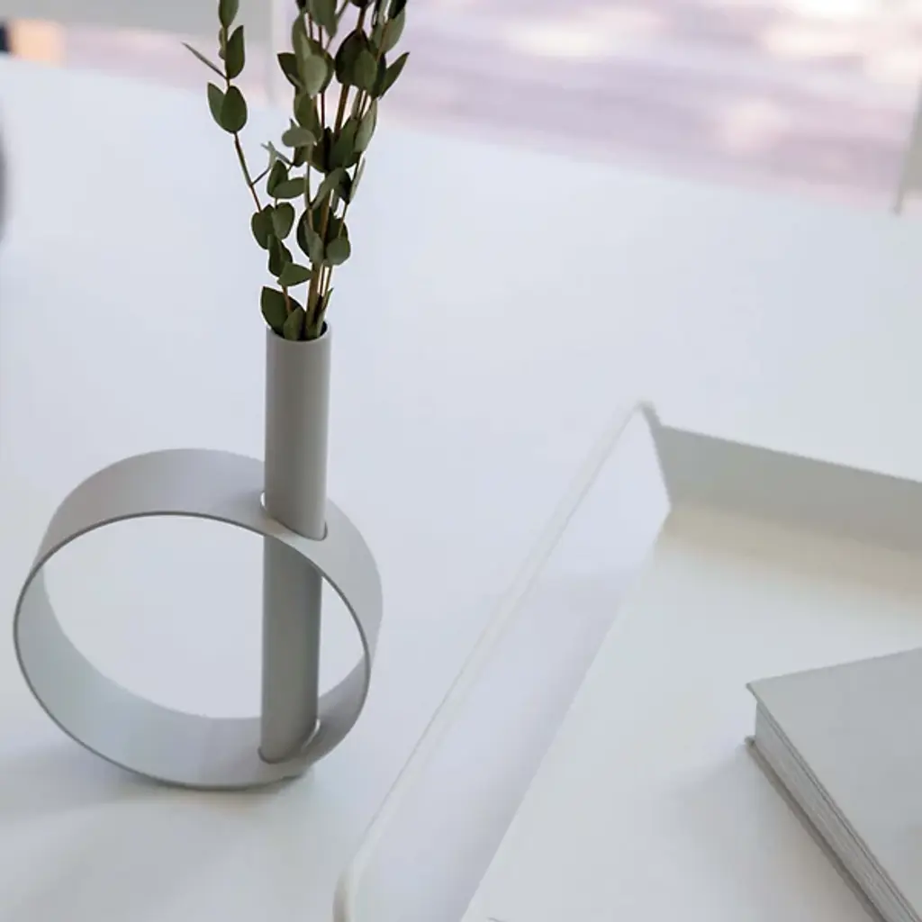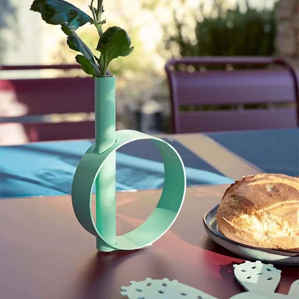The perfect way to punctuate a stylish tabletop. The Ios Single Stem Vase by Fermob is a singular design, composed of 2 pieces: a watertight aluminum tube and a flat-bottomed ring of steel. The tube is removable, allowing for easy maintenance of a flower or small arrangement; get everything just the way you want it, then slide the tube back into its steel holder. Use this vase to add color and floral texture to a lounge or dining table, indoors or out.