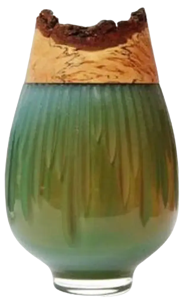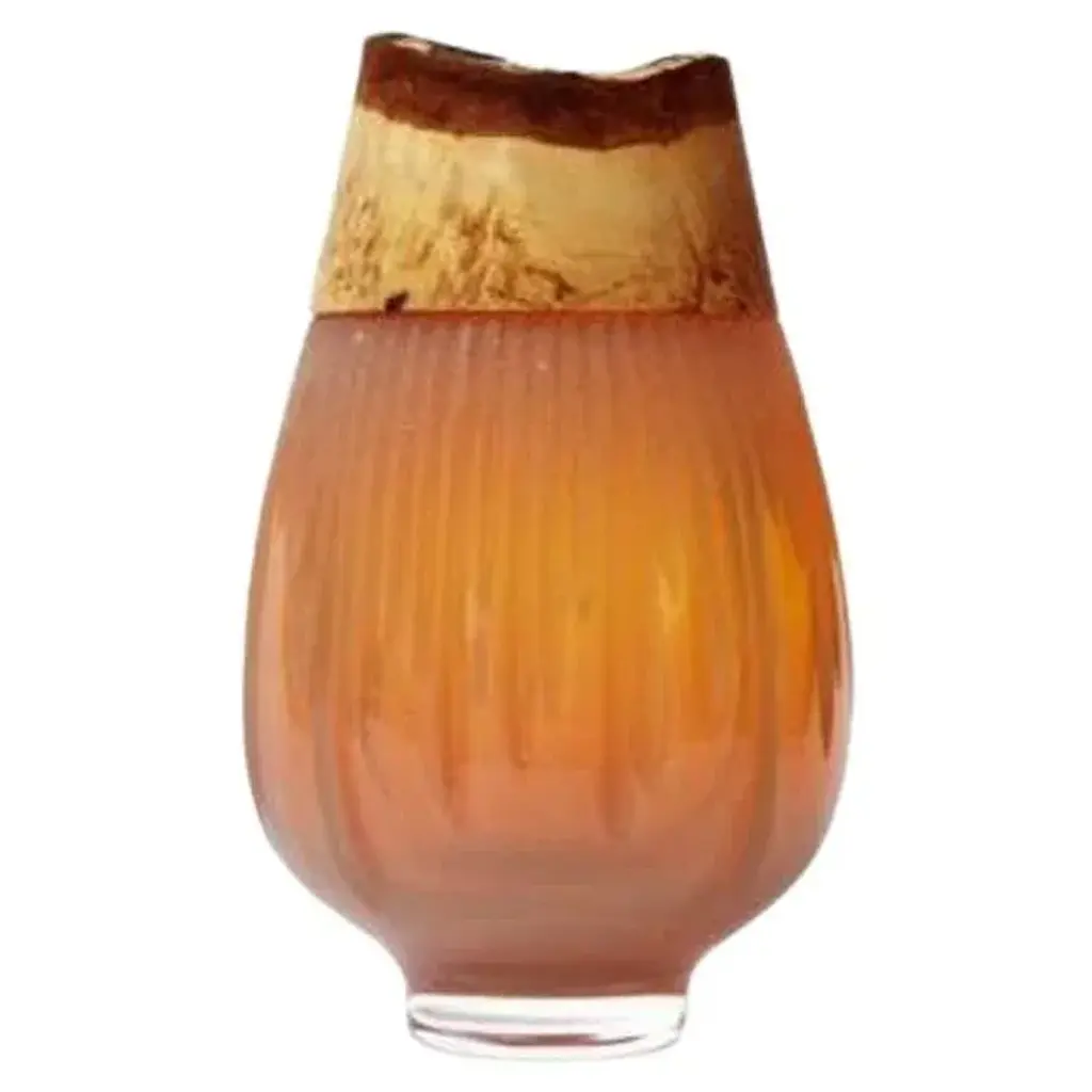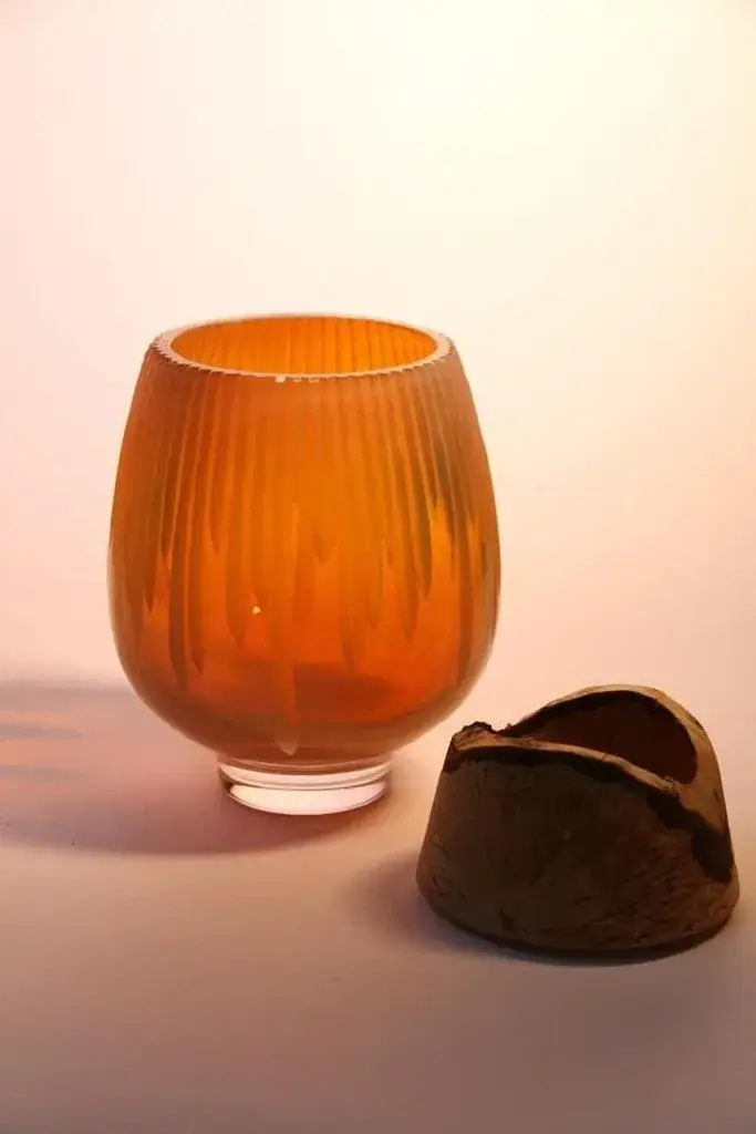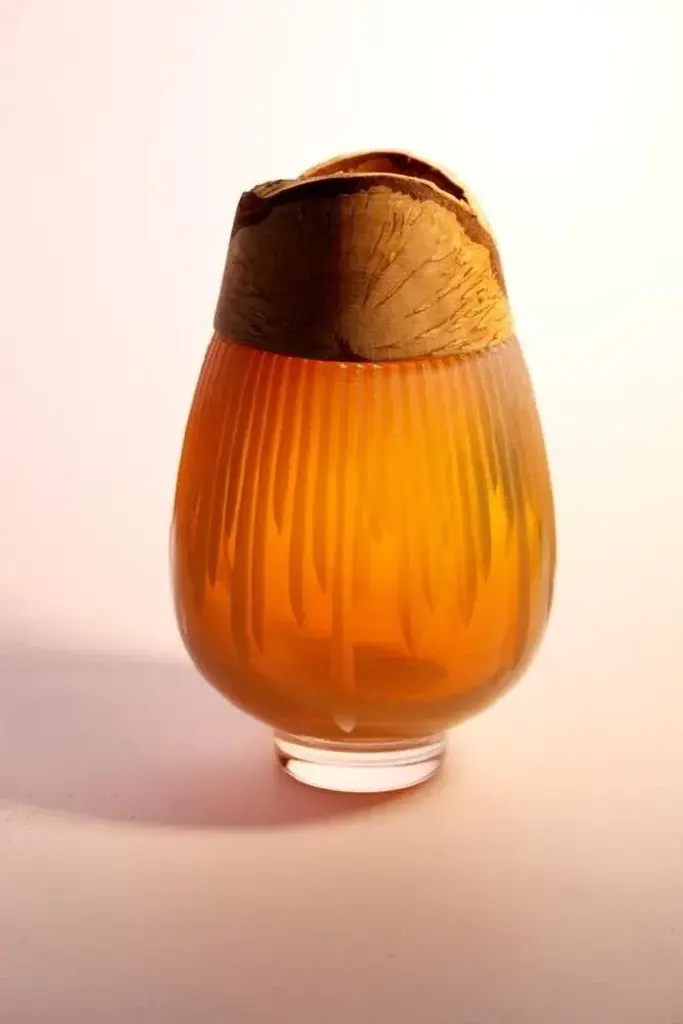 Iris Amber Frida with cuts stacking vessel, Pia Wüstenberg Dimensions: D 13 x H 20 Materials: cut glass, wood with its sculpted glass topped by Curly Birch, Poppy is an exquisite vessel. This delightful piece finds heritage in the refined skills of Bohemian glass cutting and the long rooted tradition of forestry and woodwork in Karelia, Finland. Handmade in Europe: hand blown glass (Czechia), handturned wood (Finland). The materials then come to our warehouse in North Germany where they are fitted and assembled. This piece is attributed to the mentioned designer/maker. It has no attribution mark and no official proof of authenticity, however it is well documented in design history. I take full responsibility for any authenticity issues arising from misattribution