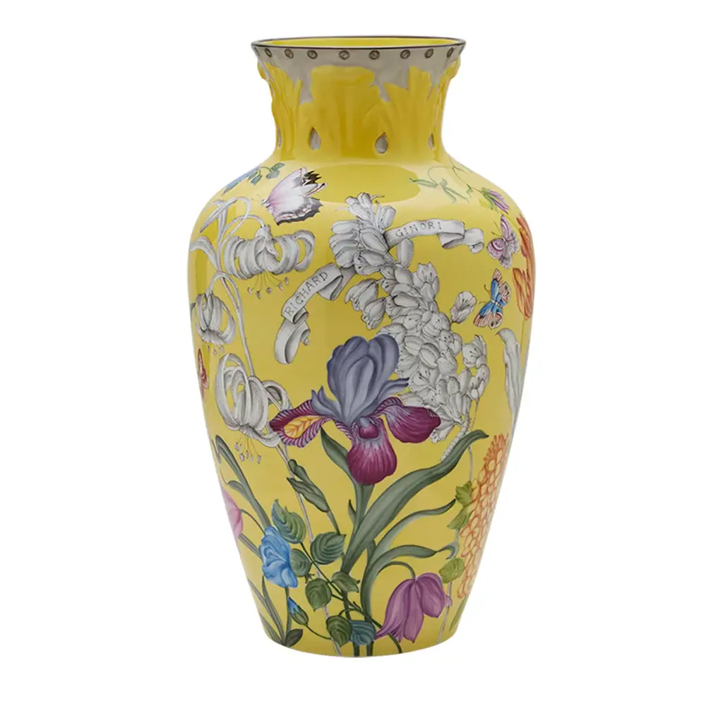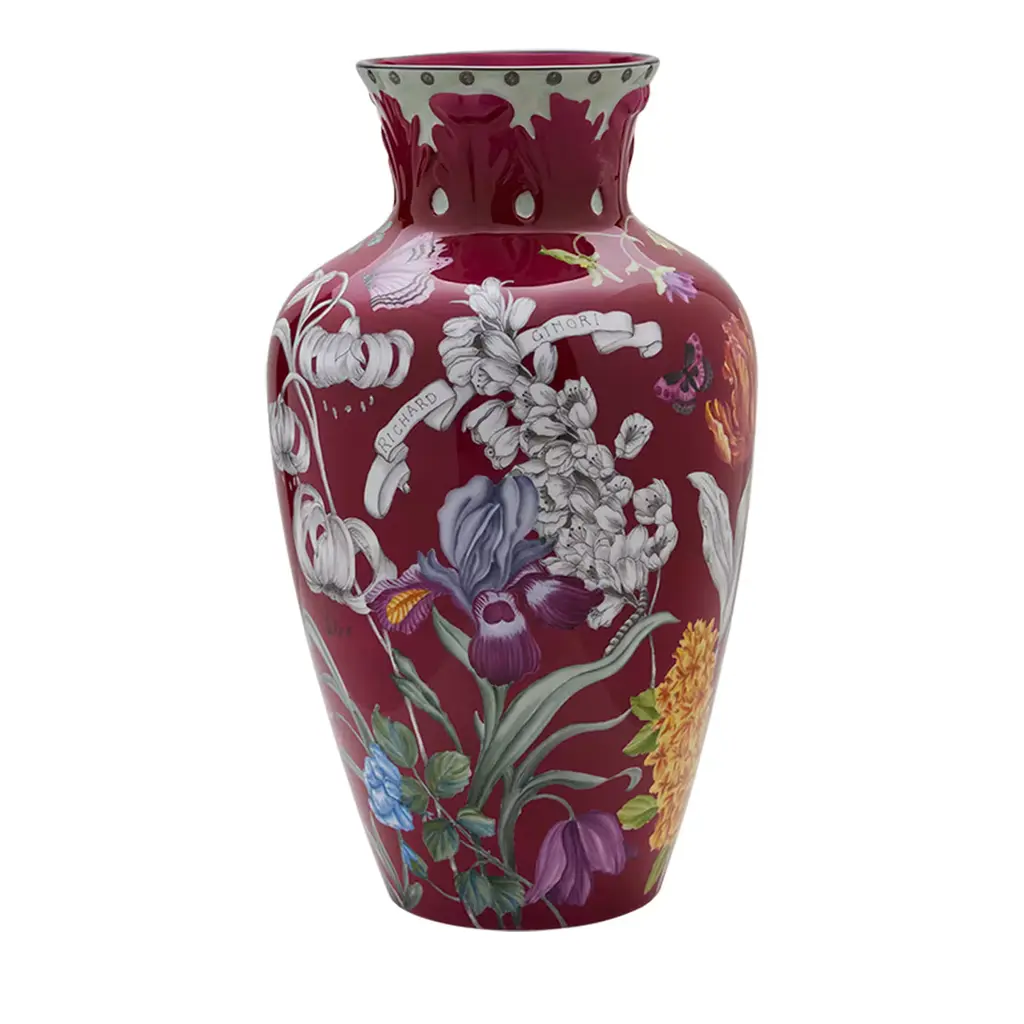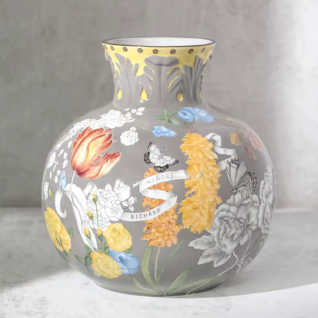 Showcasing the elegant bulging shape of a classic amphora, this exquisite porcelain vase is part of the Iris Garden Collection named after a symbolic historical place in Florence. Entirely painted by hand on a gray-lacquered background, the nature-inspired decoration of iris flowers is made using techniques typical of German naturalist and painter Maria Sibylla Merian.