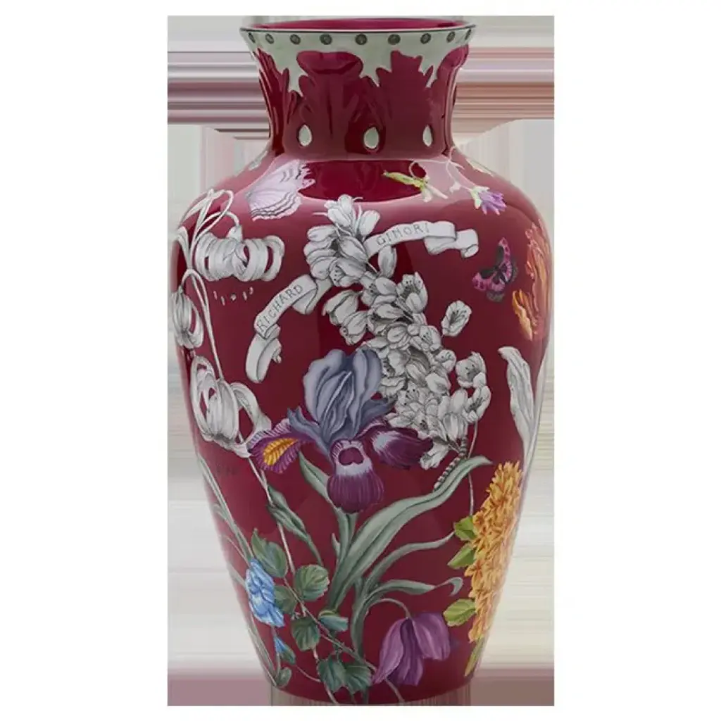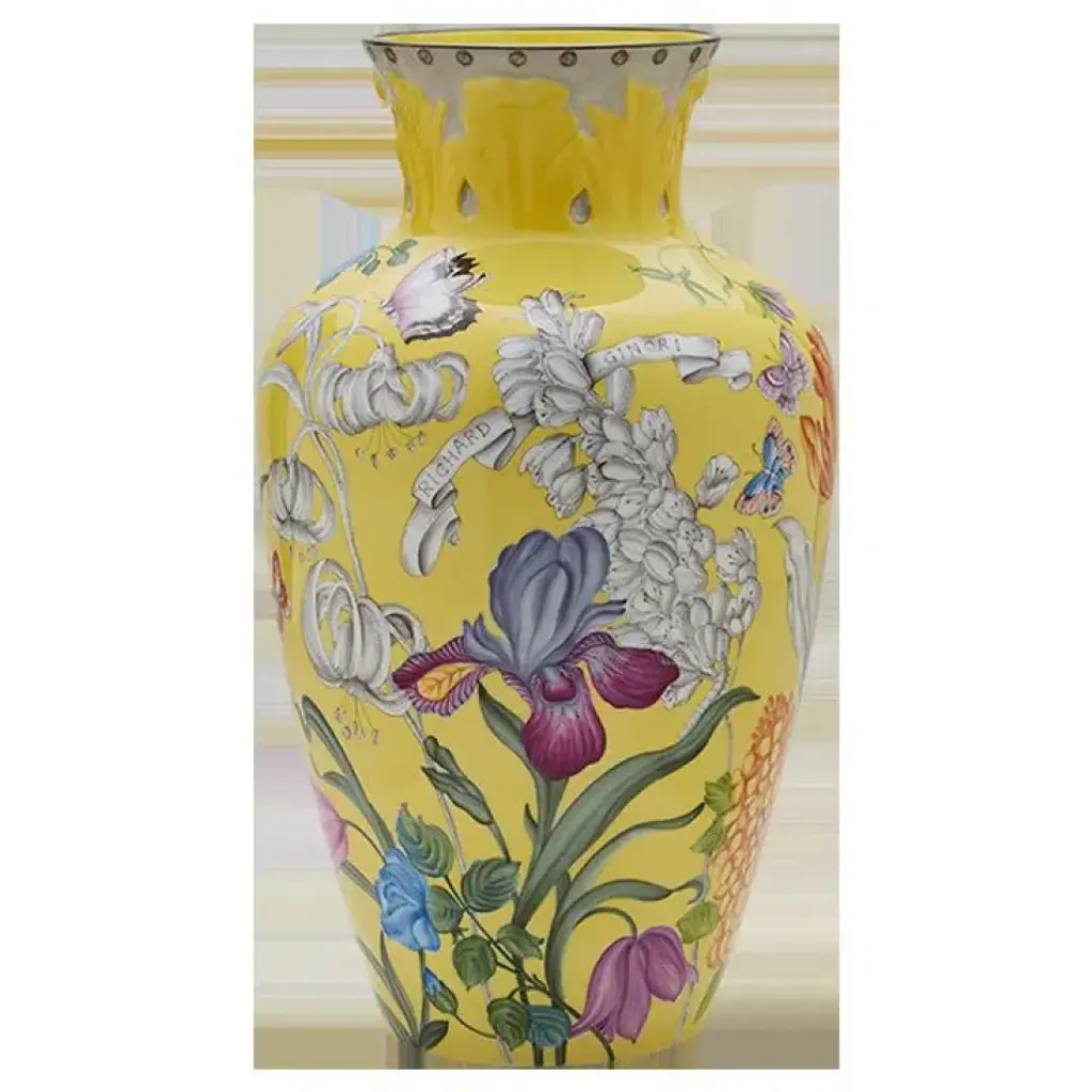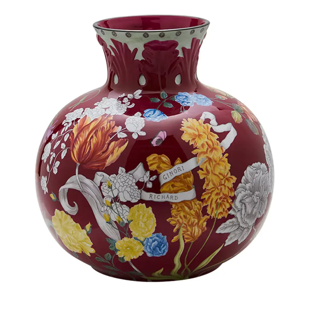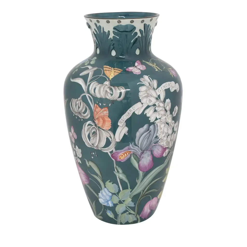 Showcasing the elegant bulging shape of a classic amphora, this exquisite porcelain vase is part of the Iris Garden Collection named after a symbolic historical place in Florence. Entirely painted by hand on a gray-lacquered background, the nature-inspired decoration of iris flowers is made using techniques typical of German naturalist and painter Maria Sibylla Merian.