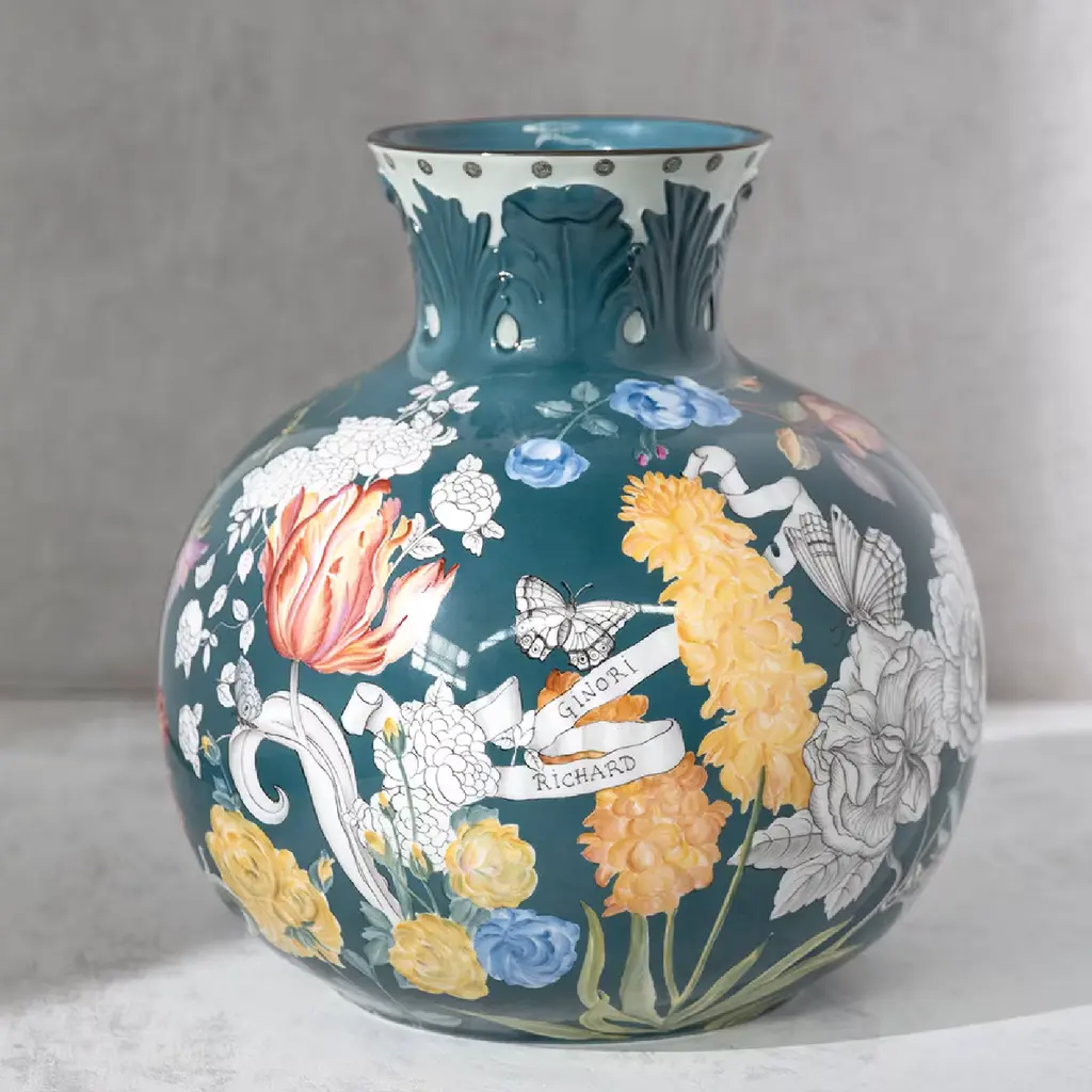 The Iris Garden is one of the most symbolic places in Florence, and gives the name to this refined collection of porcelain vases. This piece features a sinuous and bulging amphora-shaped silhouette enriched with a superbly handmade painting of nature and iris flowers, made using the painting techniques of German naturalist and painter Maria Sibylla Merian.