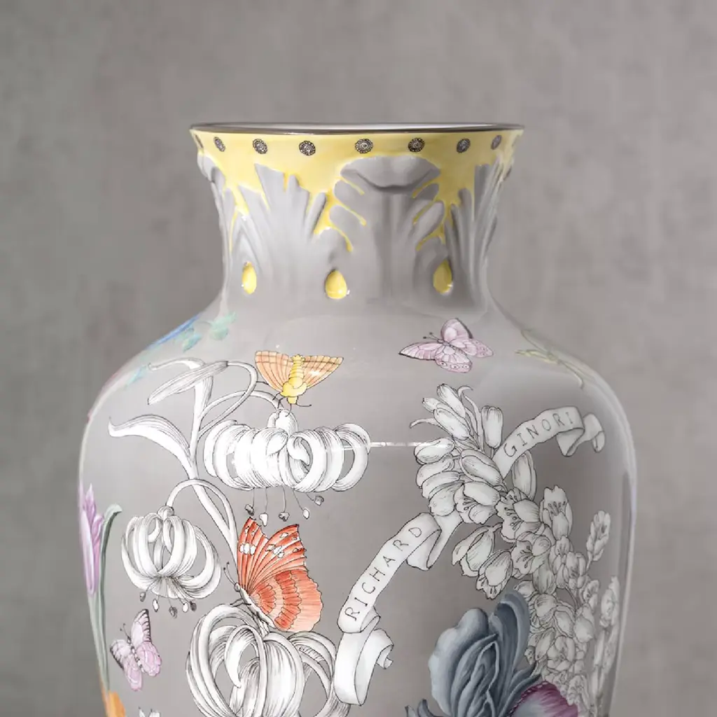 A splendid collector's piece of refined sophistication, this vase is exquisitely handcrafted of fine porcelain. Boasting a gray-lacquered background, it features a painted decoration inspired by the techniques of German naturalist and painter Maria Sibylla Merian. The piece belongs to the Iris Garden Collection named after a historical place in Florence.