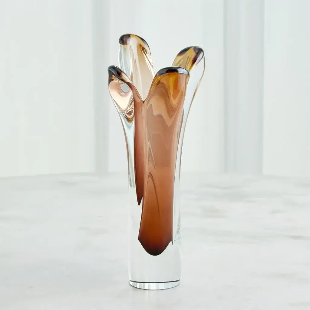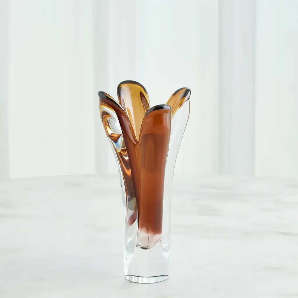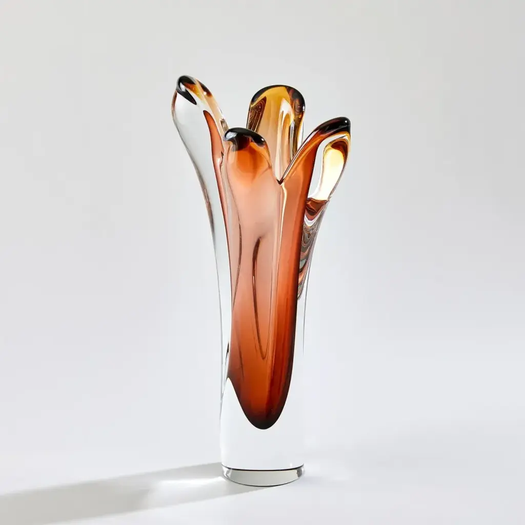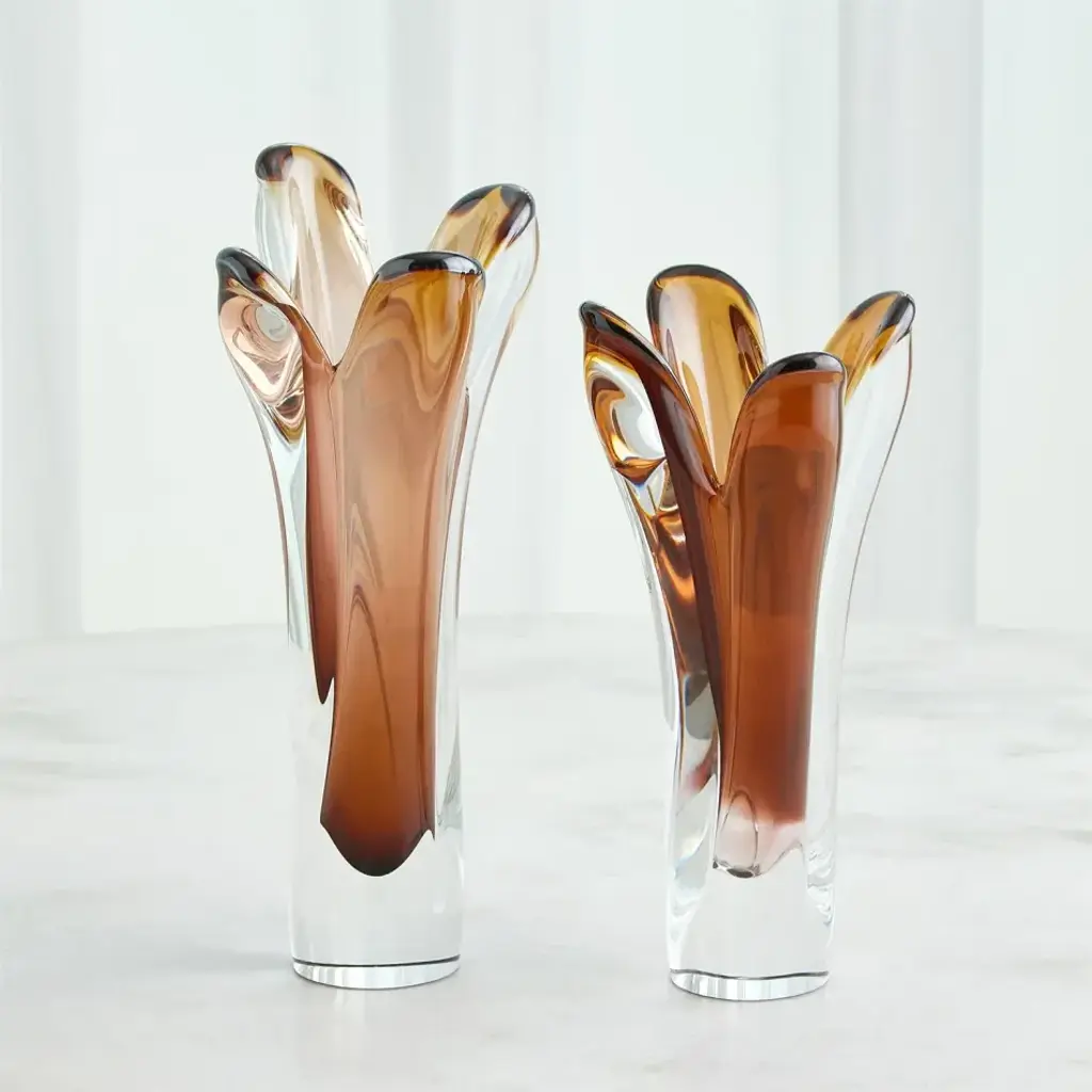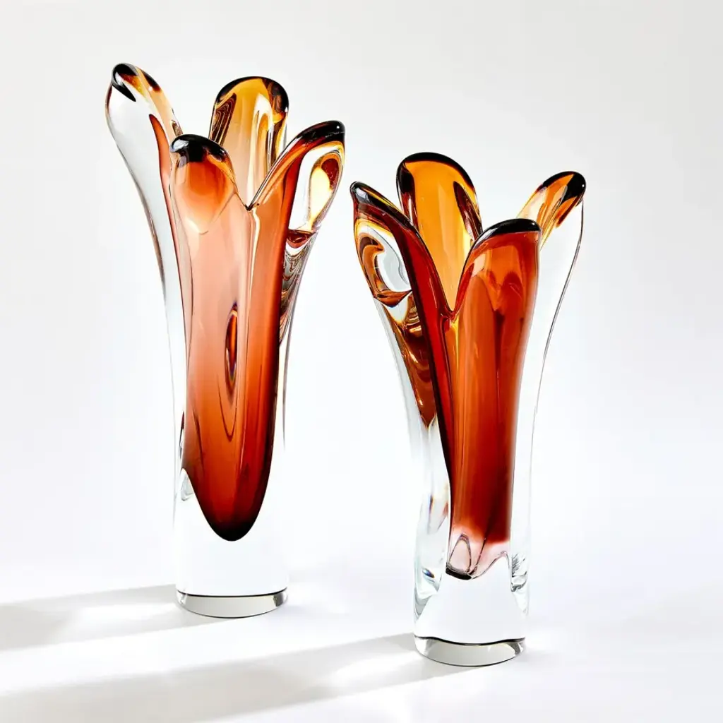 The Iris Vases showcase the exceptional artistry of Polish glassblowers. These vases are carefully crafted from Polish mouth-blown art glass, and their striking encased color effect is achieved through a delicate hand-blowing technique. Layers of clear and amber-colored glass blend harmoniously, creating a captivating visual interplay. What truly sets these vases apart is the skilled hand-pulling process, resulting in intriguing and one-of-a-kind designs. From a fashion forward perspective, Global Views offers accessories, furniture, statement lighting, and an assortment of rugs and mirrors to add beauty and joy to your home.