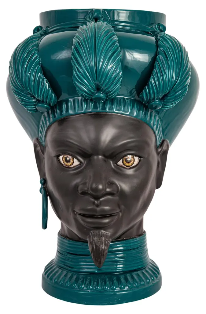 THE COLLECTIONThis collection offers ideas for contemporary décor through sophisticated revelations of art bound to the tradition of ceramics of Caltagirone, objets d’art that combine history and design.The extreme attention to details, supported by twenty years of experience of master craftsmen, is the company’s strength.The production technique hides secrets and art mixtures that make the product unique and exclusive. Mosche Bianche chooses to combine art and design to recall history through ceramic artworks in doing so, history revives, as in a fairy tale, an incredible civilization that is the sicilian culture.The moorish heads in ceramics, tribute to the beauty of ancient Sicily and its traditions, draw inspiration from a legend of love and jealousy set during the arabic domination in Sicily.A STORY OF LOVE AND JEALOUSYThe legend tells that during the moorish domination in Sicily around 1000, in the arabic district of Palermo “al hàlisah” that a moor who, overwhelmed by a violent passion, declared his love to her. Noticed means “the chosen one”, a sweet girl the young girl charmed by his promise of love reciprocated. However, the moor was hiding a terrible truth. He already had a wife and children back home. So, when the girl discovered it, she decided to keep his beloved face with her forever. Without hesitation, she cut off his head and create a vase in which she planted a basil shoot. This aromatic plant has always had an aura of holiness as it represents the rulers’ plant. In this sense, that terrible act was justified by her absolute love to continue to take care of her beloved young moor. Every day in fact, the tears of the young heart-broken girl watered the plant of basil that kept thriving and flourishing. And all the neighbours, inebriated by that sentof the beautiful plant, started to commission clay vases shaped as a moor head.Different sizes available.