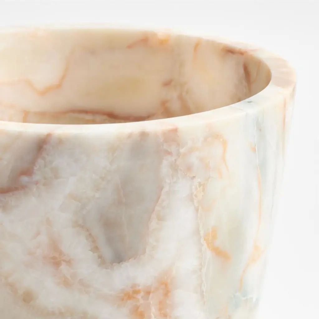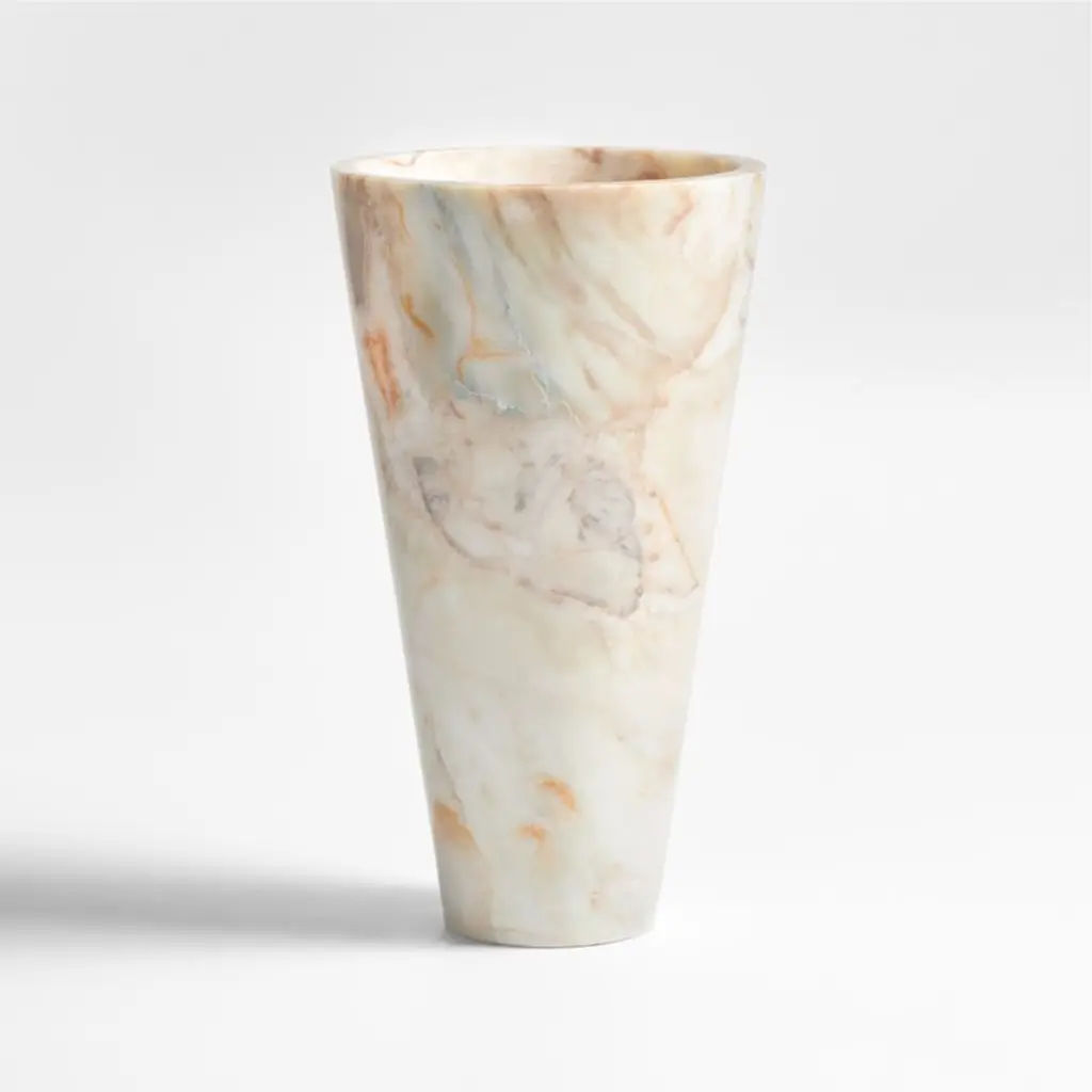 Gorgeously animated with pink highlights on creamy white, red marble stuns in our Isola vase. The soft hues and unique patterning of the natural material provide organic contrast to the vessel's modern geometric shape to create visual balance. Exuding warm, organic luxury, the hand-carved conical vase presents fresh, dried and faux botanicals for a stunning display. Fascinating variations in hue and veining make each piece beautifully unique.