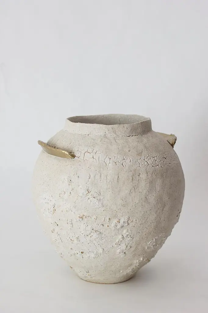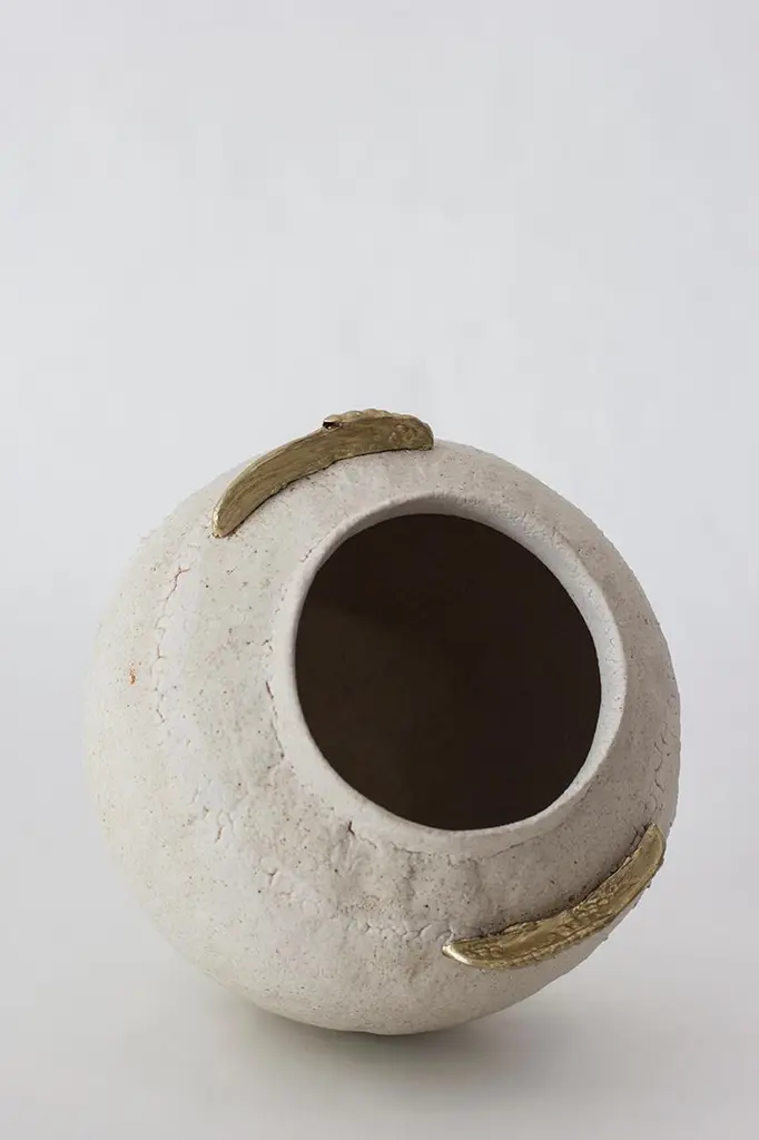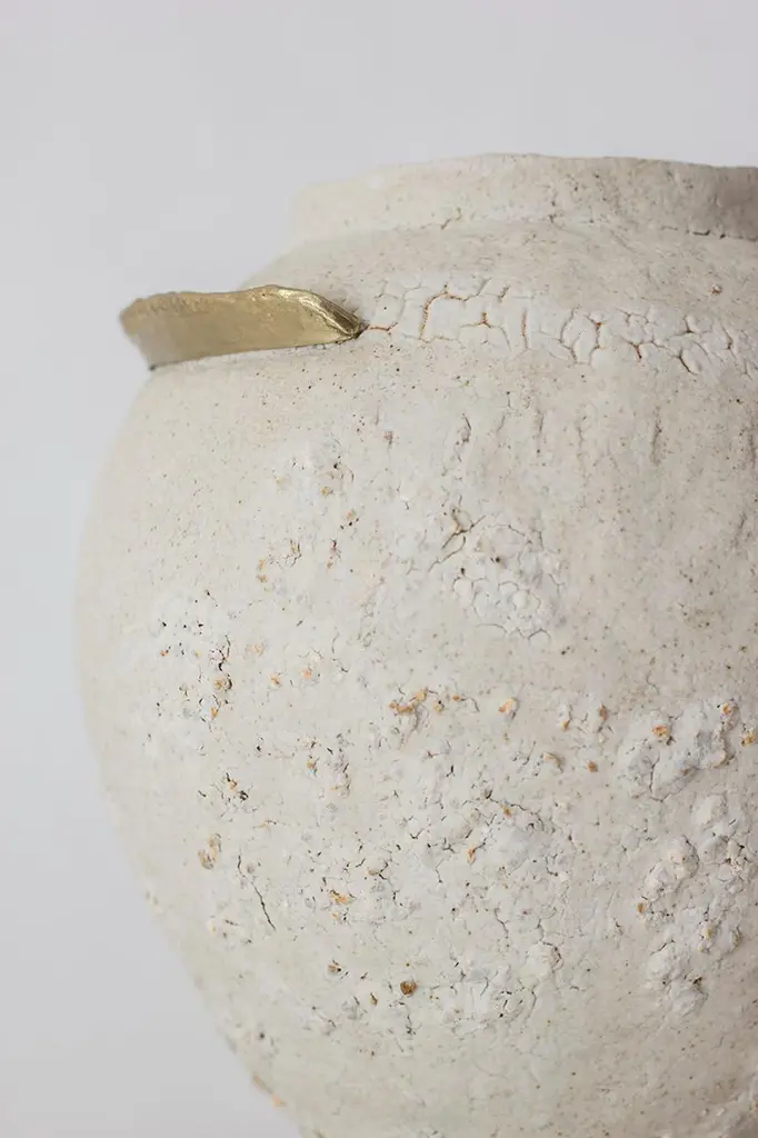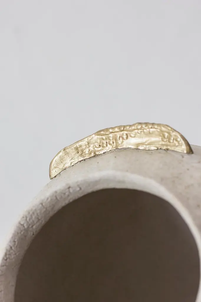 "Isolated" brass and glaze stoneware vase, Raquel Vidal and Pedro Paz.Glaze stoneware and brass vase.Measures: 230 x 210 mm.Materials: Hand-sculpted, glazed pottery.Raquel Vidal and Pedro Paz Craft pottery and jewelry that seeks to preserve ancient techniques and aesthetics. Their work is defined by a deep respect for materials, metal and clay being the primary raw materials with which they work. Both of these elements have been used since the beginning of humanity to not only make tools and supplies but also for creating objects to contemplate and connect with our bodies and environment. Pottery and jewelry have worked together in each society’s development, mutating and showing the interests, needs and concerns of a given era.Raquel and Pedro believe these ancient arts also help us understand our ancestors, get closer to them and experience how they felt materials and shapes. The Material connections between metal and clay are also of interest. Both materials have long and slow production processes and an intimate connection with fire, a somewhat rebel and magic element, that humanity has always craved to control.This belief that materials and the processes applied to them can transform the artist into a restorer of old sensibilities is foundational for Raquel and Pedro. Every piece is crafted slowly and methodically, there is no rushing in the process, and with a respect for the natural worl's own "will" to produce its own results.