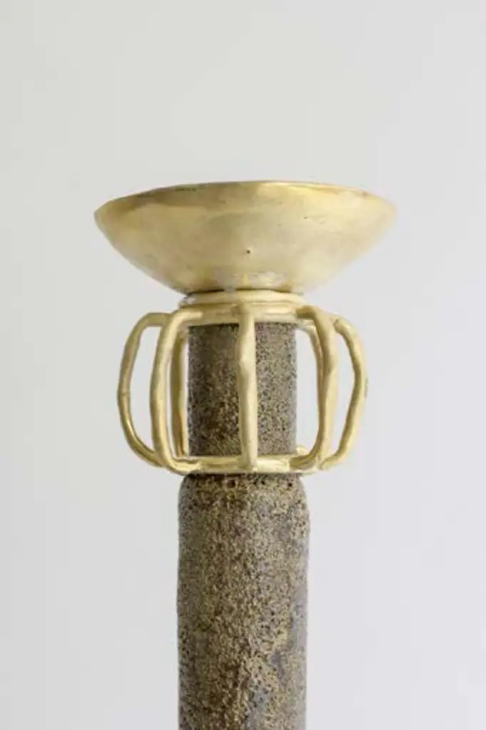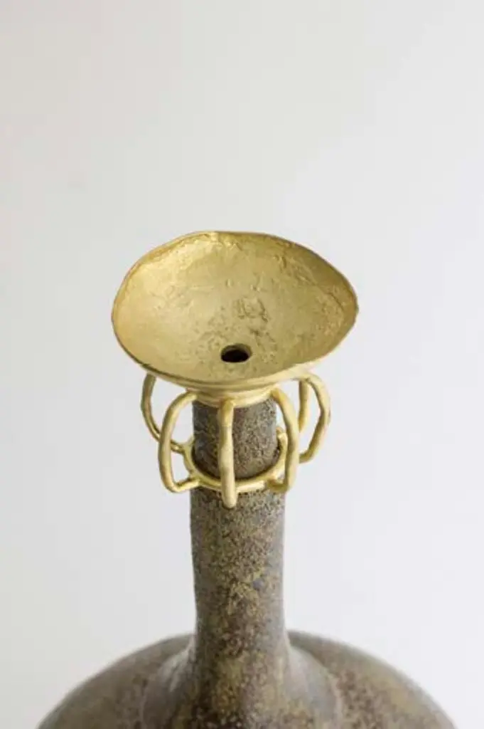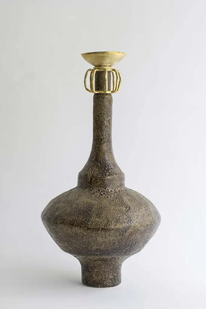 "Isolated N.29" stoneware vase by Raquel Vidal and Pedro Paz.One of a kind.Dimensions: D 23.5 x H 43.5 cm.Materials: Hand sculpted, stoneware with grog.The pieces are handbuilt white stoneware with grog, and brushed with experimental glazes mix and textured surface, resulting in slight variations with each piece. No watertight. Made in Valencia, Spain.Raquel Vidal and Pedro Paz Craft pottery and jewelry that seeks to preserve ancient techniques and aesthetics. Their work is defined by a deep respect for materials, metal and clay being the primary raw materials with which they work. Both of these elements have been used since the beginning of humanity to not only make tools and supplies but also for creating objects to contemplate and connect with our bodies and environment. Pottery and jewelry have worked together in each society’s development, mutating and showing the interests, needs and concerns of a given era.Raquel and Pedro believe these ancient arts also help us understand our ancestors, get closer to them and experience how they felt materials and shapes. The Material connections between metal and clay are also of interest. Both materials have long and slow production processes and an intimate connection with fire, a somewhat rebel and magic element, that humanity has always craved to control.This belief that materials and the processes applied to them can transform the artist into a restorer of old sensibilities is foundational for Raquel and Pedro. Every piece is crafted slowly and methodically, there is no rushing in the process, and with a respect for the natural worl's own "will" to produce its own results.