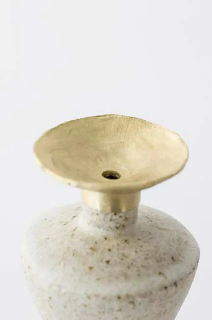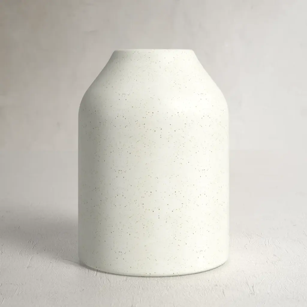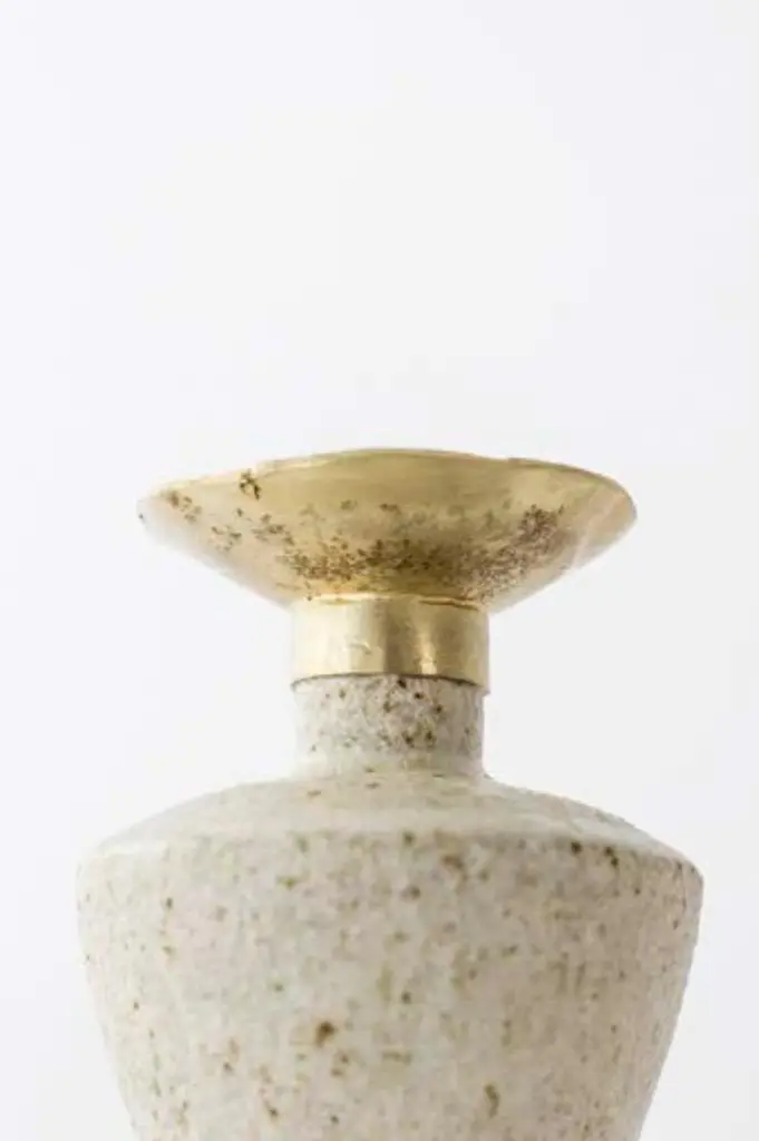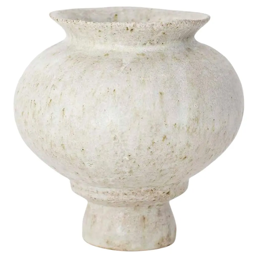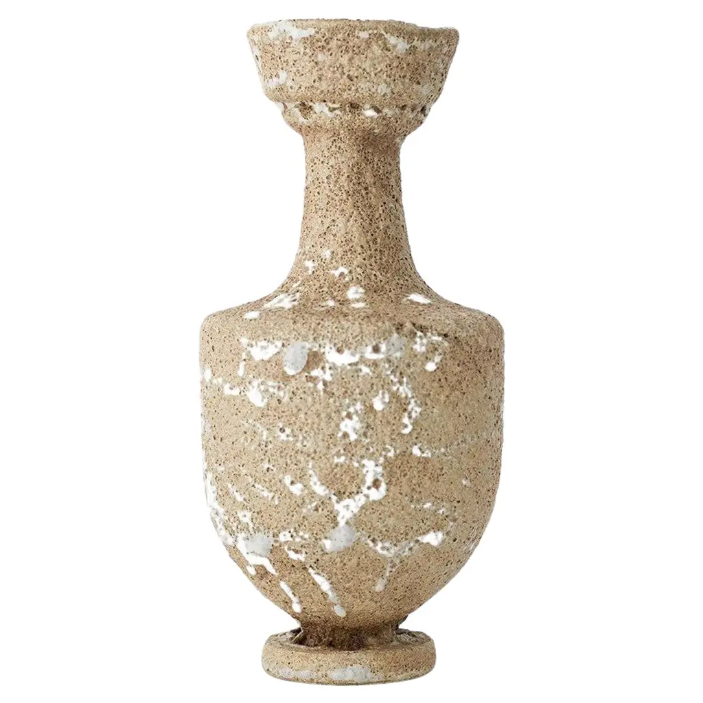 "Isolated N.6" stoneware vase by Raquel Vidal and Pedro PazOne of a KindDimensions: D 9 x H 13 cmMaterials: Hand sculpted, Stoneware with grogThe pieces are handbuilt white stoneware with grog, and brushed with experimental glazes mix and textured surface, resulting in slight variations with each piece. No watertight. Made in Valencia, Spain.Raquel Vidal and Pedro Paz craft pottery and jewelry that seeks to preserve ancient techniques and aesthetics. Their work is defined by a deep respect for materials, metal and clay being the primary raw materials with which they work. Both of these elements have been used since the beginning of humanity to not only make tools and supplies but also for creating objects to contemplate and connect with our bodies and environment. Pottery and jewelry have worked together in each society’s development, mutating and showing the interests, needs and concerns of a given era.Raquel and Pedro believe these ancient arts also help us understand our ancestors, get closer to them and experience how they felt materials and shapes. The material connections between metal and clay are also of interest. Both materials have long and slow production processes and an intimate connection with fire, a somewhat rebel and magic element, that humanity has always craved to control.This belief that materials and the processes applied to them can transform the artist into a restorer of old sensibilities is foundational for Raquel and Pedro. Every piece is crafted slowly and methodically, there is no rushing in the process, and with a respect for the natural worl's own "will" to produce its own results.