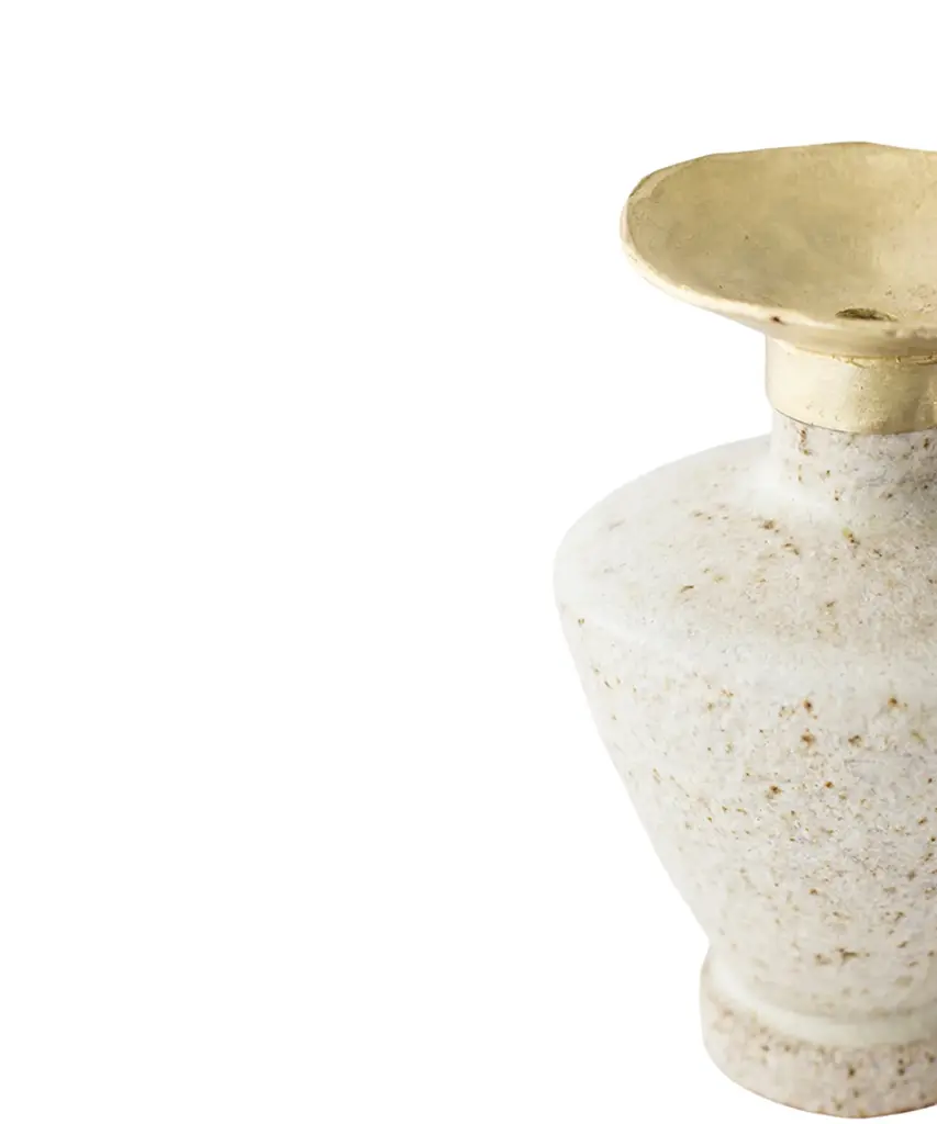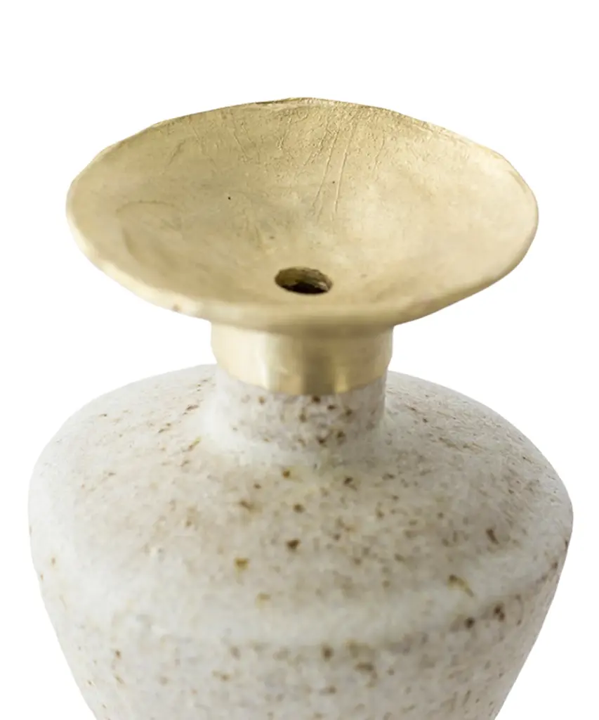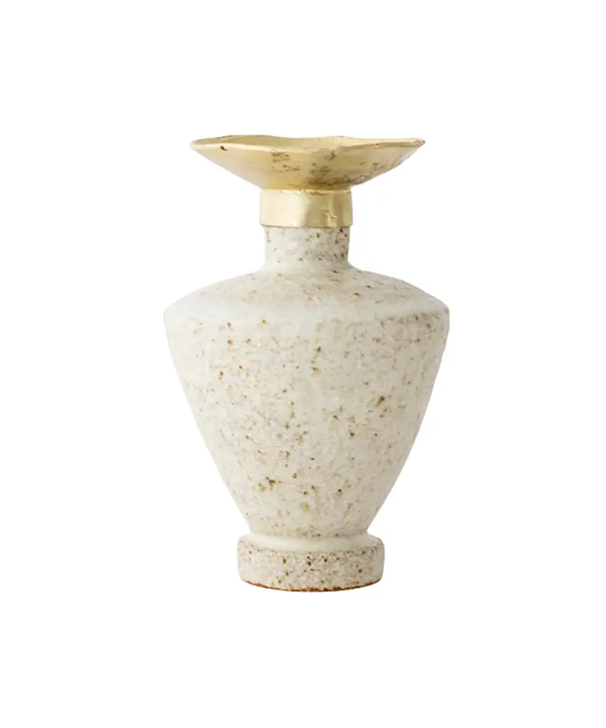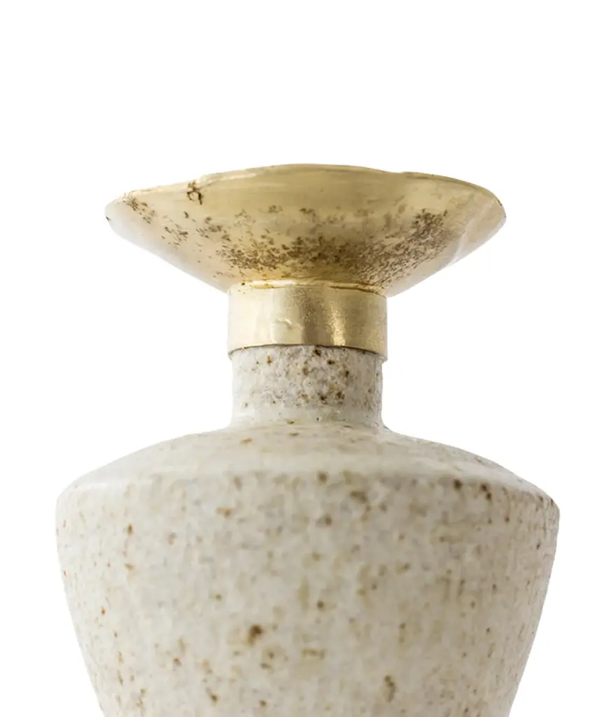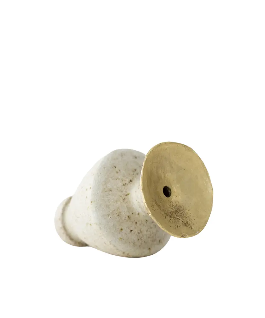 The "Isolated" series by Canoa Lab is comprised of reworked and redesigned forms and shapes from ancient Mediterranean vases. Each piece is designed in isolation and with larger dimensions, using the coiling technique. In some of these vases, metal is used, by employing precious metalworking techniques, such as wax-modelling and lost-wax casting. All of the pieces in this series are made of stoneware with grog from Manises (Valencia), and self-formulated glazes. The metal pieces are made of cast brass. The stoneware vase in handmade to order by the Valencia-based studio, Canoa Lab.
