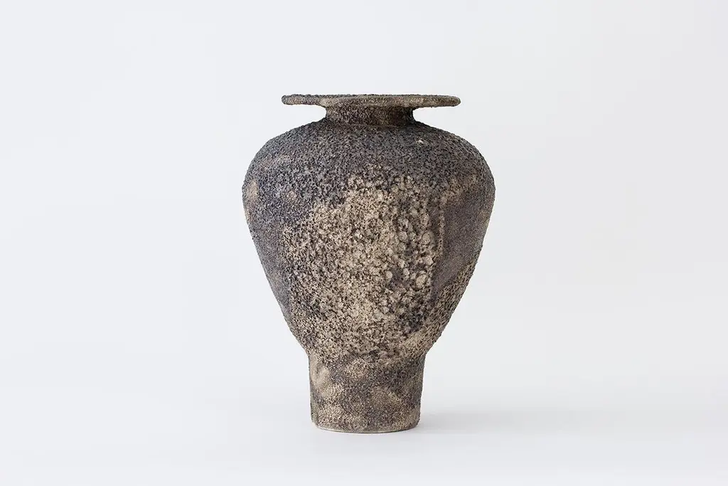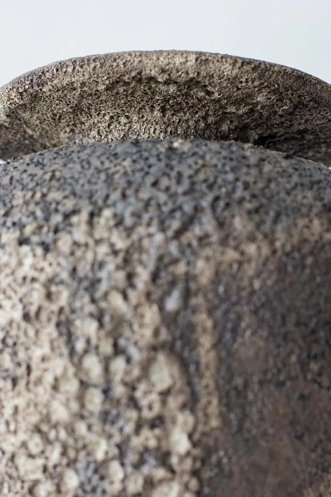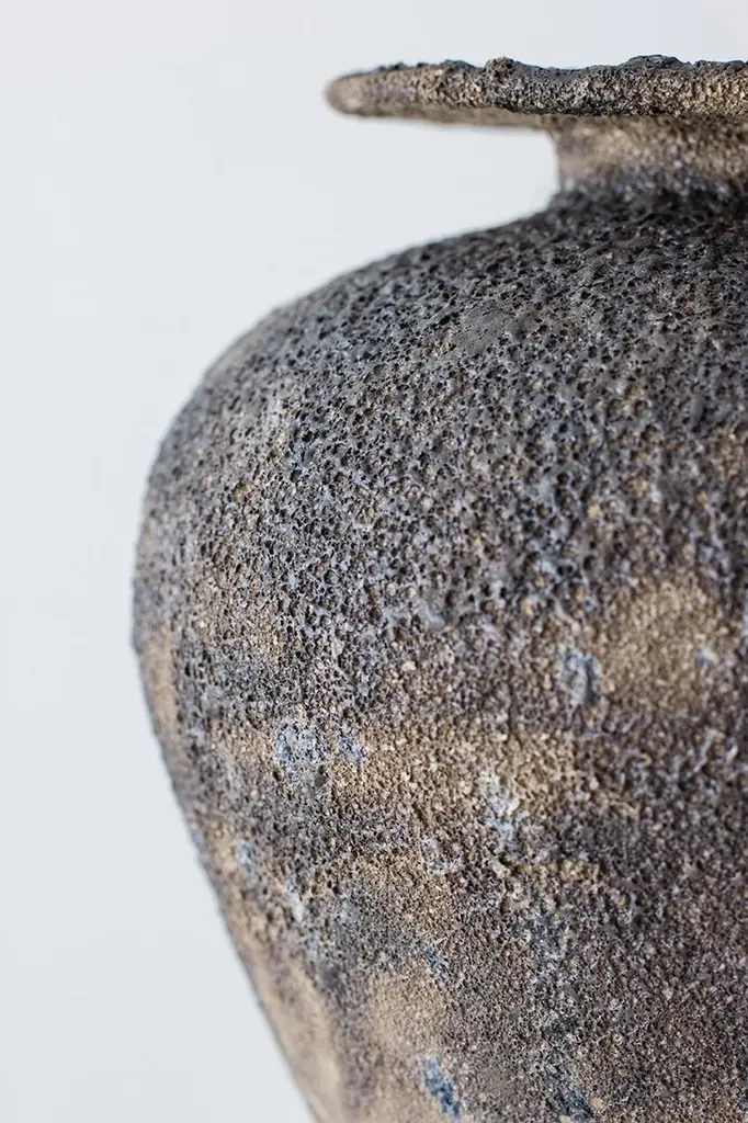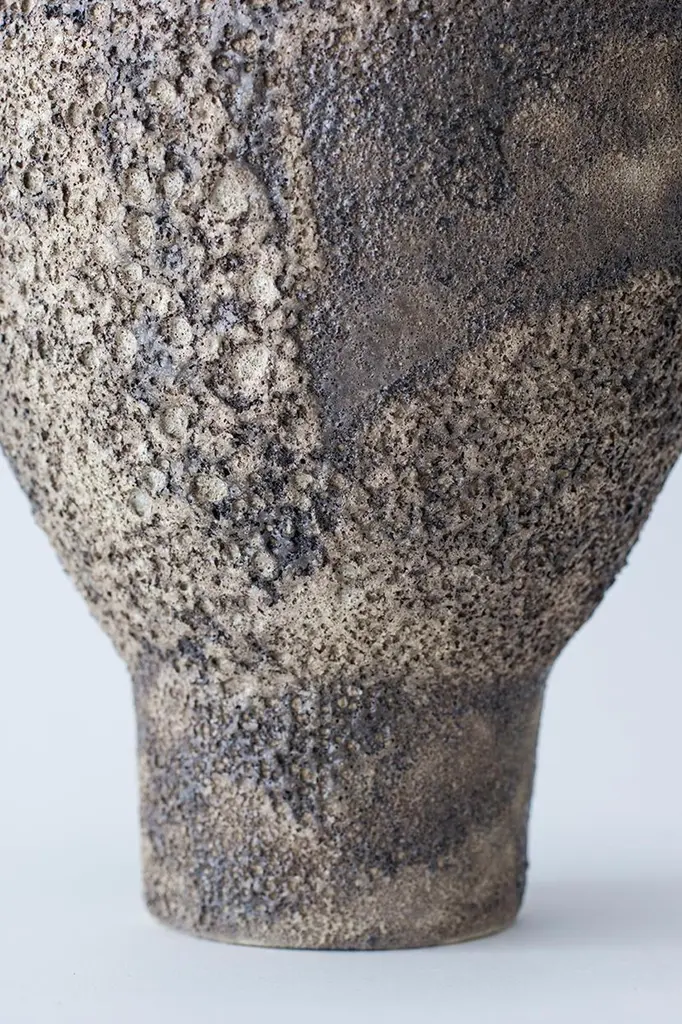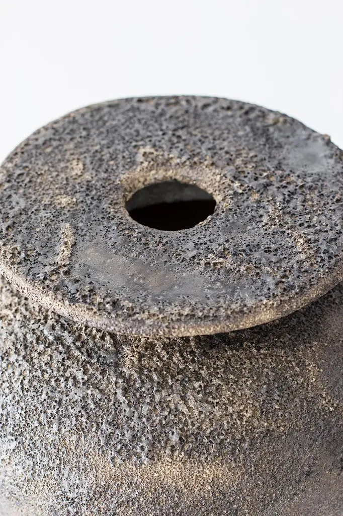 "Isolated n.7" stoneware vase by Raquel Vidal and Pedro PazDimensions: 28.5 x 21.5 cmMaterials: Hand sculpted, glazed potteryThe pieces are handbuilt white stoneware with grog, and brushed with experimental glazes mix and textured surface, resulting in slight variations with each piece. No watertight. Made in Valencia, Spain.Raquel Vidal and Pedro Paz craft pottery and jewelry that seeks to preserve ancient techniques and aesthetics. Their work is defined by a deep respect for materials, metal and clay being the primary raw materials with which they work. Both of these elements have been used since the beginning of humanity to not only make tools and supplies but also for creating objects to contemplate and connect with our bodies and environment. Pottery and jewelry have worked together in each society’s development, mutating and showing the interests, needs and concerns of a given era.Raquel and Pedro believe these ancient arts also help us understand our ancestors, get closer to them and experience how they felt materials and shapes. The material connections between metal and clay are also of interest. Both materials have long and slow production processes and an intimate connection with fire, a somewhat rebel and magic element, that humanity has always craved to control.This belief that materials and the processes applied to them can transform the artist into a restorer of old sensibilities is foundational for Raquel and Pedro. Every piece is crafted slowly and methodically, there is no rushing in the process, and with a respect for the natural worl's own "will" to produce its own results.