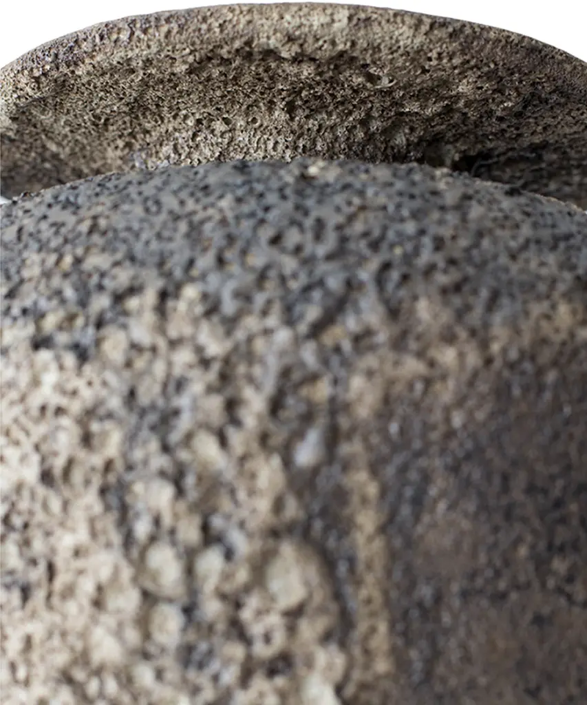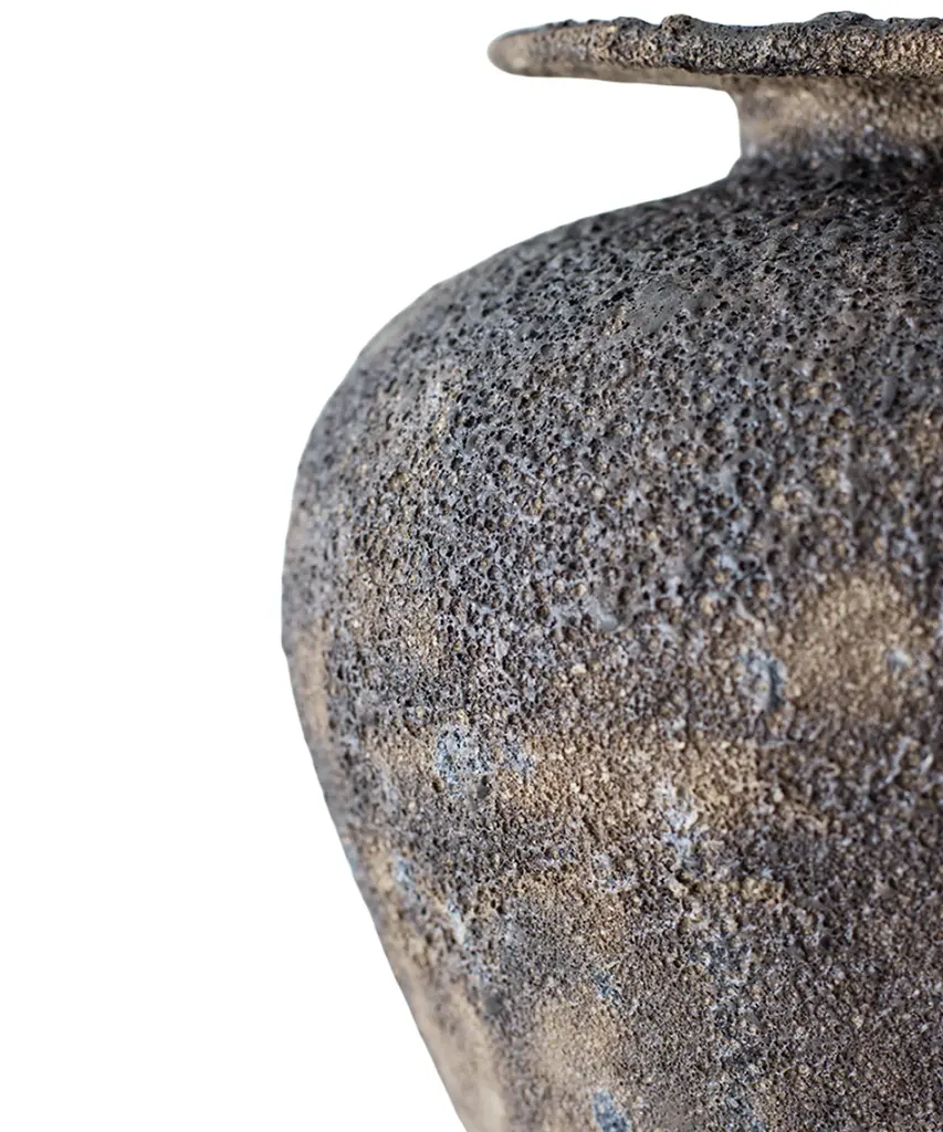 The "Isolated" series by Canoa Lab is comprised of reworked and redesigned forms and shapes from ancient Mediterranean vases. Each piece is designed in isolation and with larger dimensions, using the coiling technique. In some of these vases, metal is used, by employing precious metalworking techniques, such as wax-modelling and lost-wax casting. All of the pieces in this series are made of stoneware with grog from Manises (Valencia), and self-formulated glazes. The metal pieces are made of cast brass. The stoneware vase in handmade to order by the Valencia-based studio, Canoa Lab.
