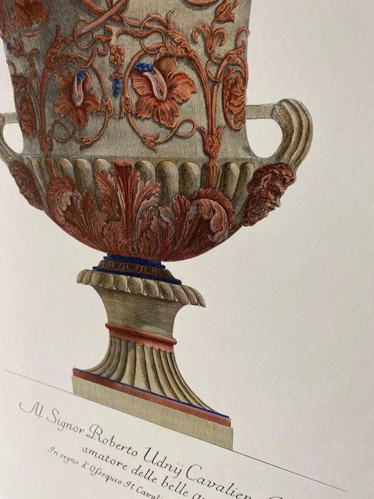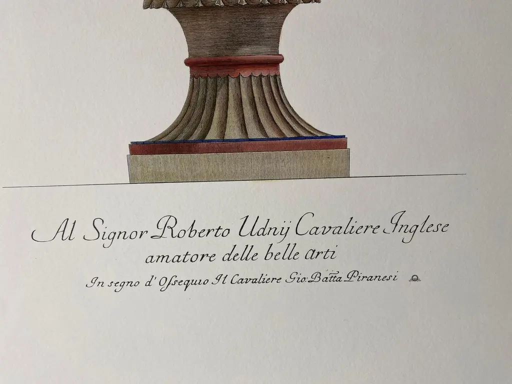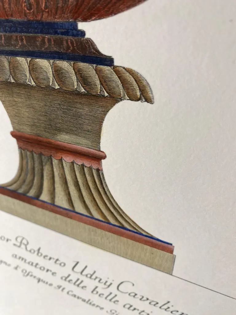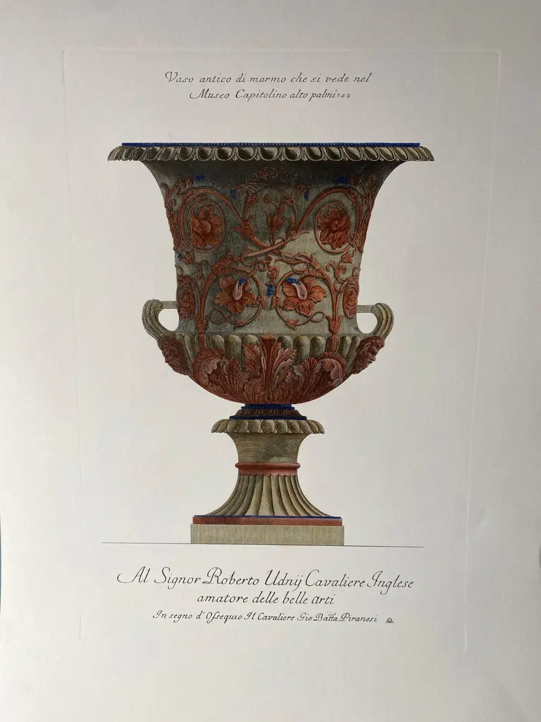 Large Roman marble vase printed on a hand press on 100% cotton engraving paper.Completely handpainted with a cream wash, pompeian red and blue highlights and details.Light brown mat with black hand embellishments.This type of colour finish was also used for another Roman vase that goes in pairsPaper dimension 50 x 70 cmSlab rebate dimensions 35 x 51 cmThis is a reproduction of the beautiful illustrations drawn and engraved by Giovan Battista Piranesi (Mogliano Veneto 1720 ─ Rome 1778), who embellishes this representation with a specific dedication, to His Excellency Mr Roberto Udny English Knight.Bottom left the signature - Cavalier Piranesi del.(ineò) ed inc.(ise)Note Plate to: G.B. Piranesi, Vasi, candelabri, cippi, sarcofagi, tripodi, lucerne ed ornamenti, 1768-1778 ARTECORNICI design produces hand colored art prints, artisan frames, lightings, decorative accessories and furniture . All our products are designed and produced in Florence by Italian master craftsmen.