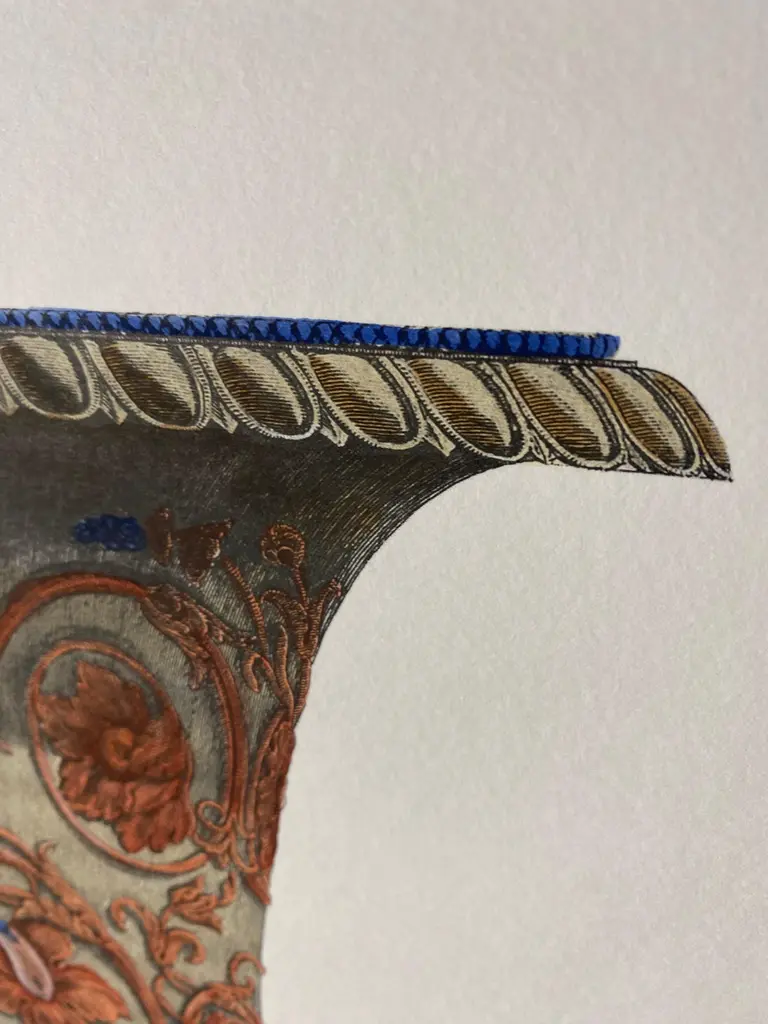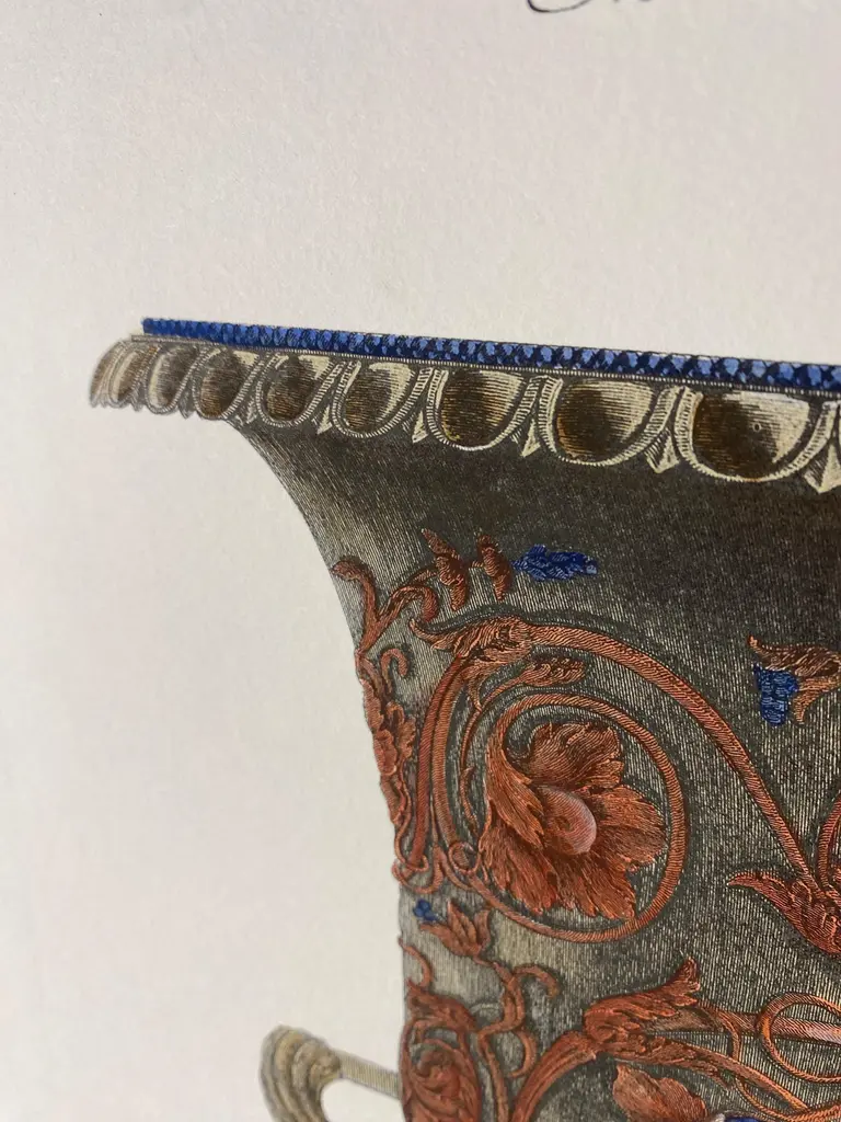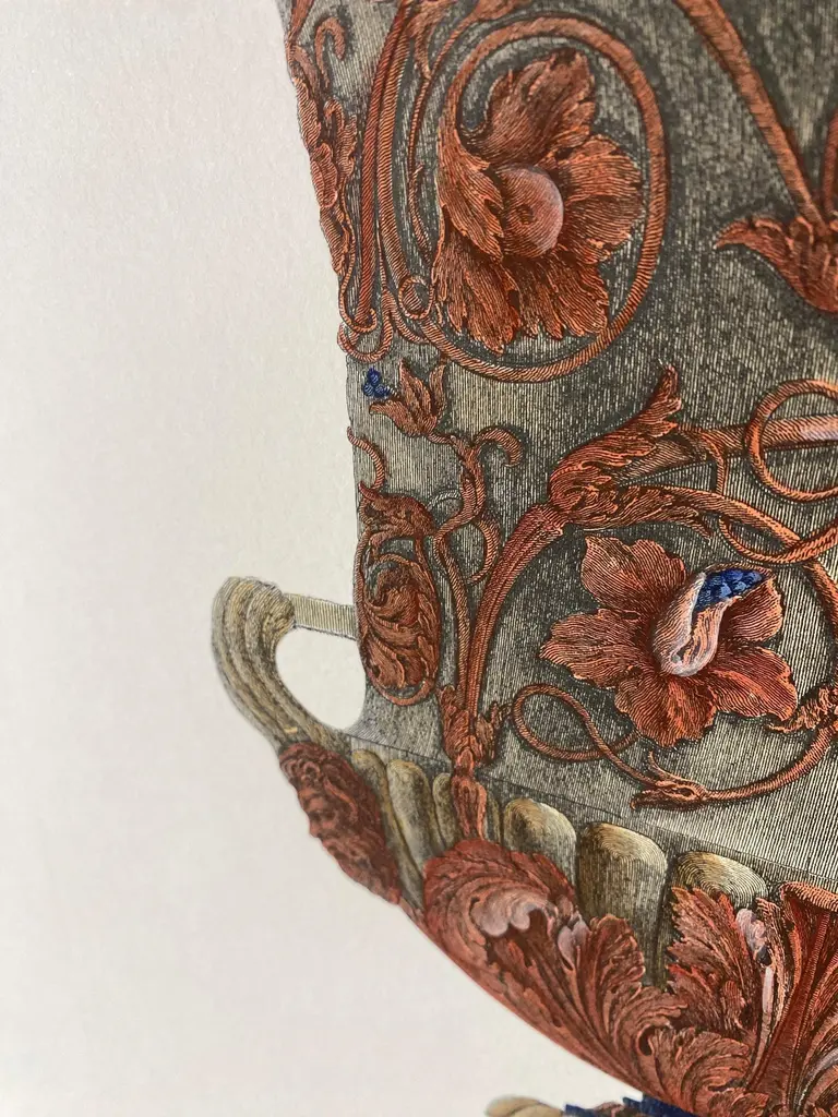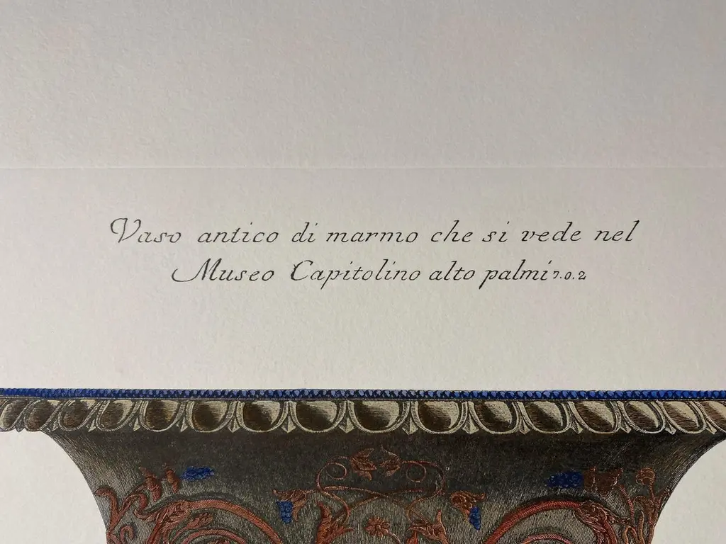 Large Roman marble vase printed on a hand press on 100% cotton engraving paper.Completely handpainted with a cream wash, pompeian red and blue highlights and details.Light brown mat with black hand embellishments.This type of colour finish was also used for another Roman vase that goes in pairsPaper dimension 50 x 70 cmSlab rebate dimensions 35 x 51 cmThis is a reproduction of the beautiful illustrations drawn and engraved by Giovan Battista Piranesi (Mogliano Veneto 1720 ─ Rome 1778), who embellishes this representation with a specific dedication, to His Excellency Mr Roberto Udny English Knight.Bottom left the signature - Cavalier Piranesi del.(ineò) ed inc.(ise)Note Plate to: G.B. Piranesi, Vasi, candelabri, cippi, sarcofagi, tripodi, lucerne ed ornamenti, 1768-1778 ARTECORNICI design produces hand colored art prints, artisan frames, lightings, decorative accessories and furniture . All our products are designed and produced in Florence by Italian master craftsmen.