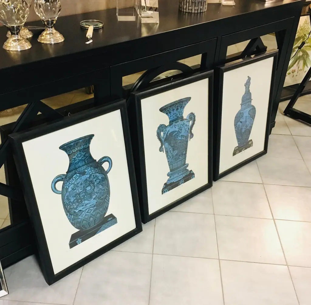 Series of three prints representing 3 different ancient Chinese vases with a black patinated wooden frame, it is printed with an antique press and colored by our best local artisans.With an experience of over 40 years, Artecornici design create high quality hand made frames using precious woods and working various types of high quality finishes, lacquers and aging, offering a vast choice of models.Each print is an artisanal Florentine product, reproducing images of the European eighteenth and nineteenth centuries with the same printing techniques (engraving with a star press), the golden age of prints, which are then finished and watercolored exclusively by hand The richness of our work lies in the ability to make our customers' requests our own, creating products with personalized, unique and precious creations, renewing our collections year after year.