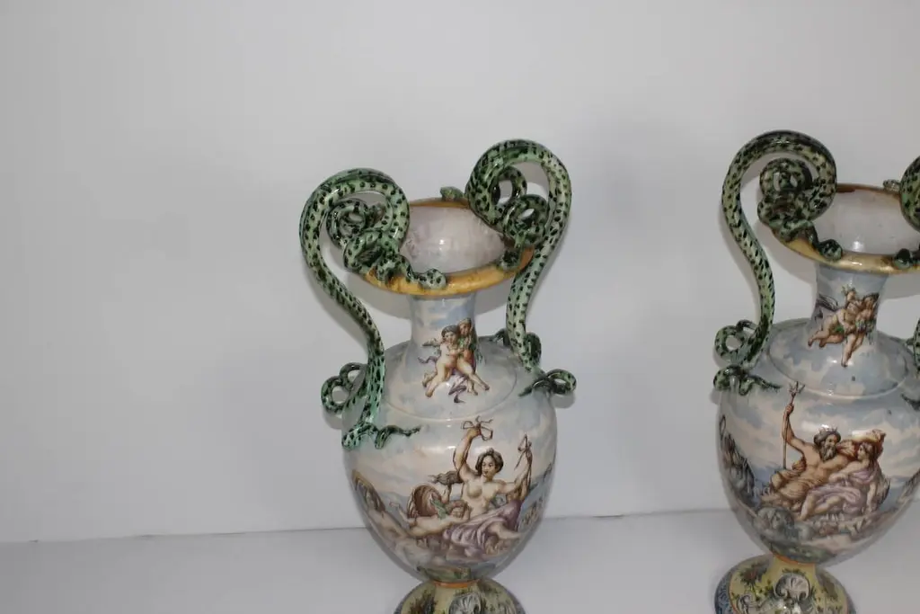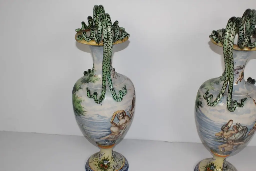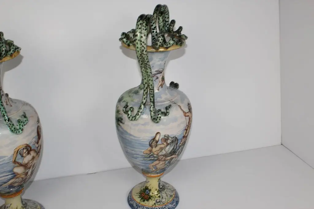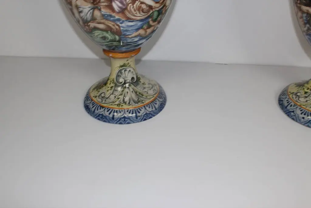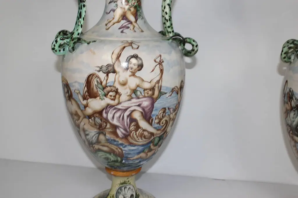 Late 19th century hand-painted Italian urns. The urns depict men, women, and angles in the ocean. The colors are soft but the handlers are painted in green and black in snack pattern. They are both signed.