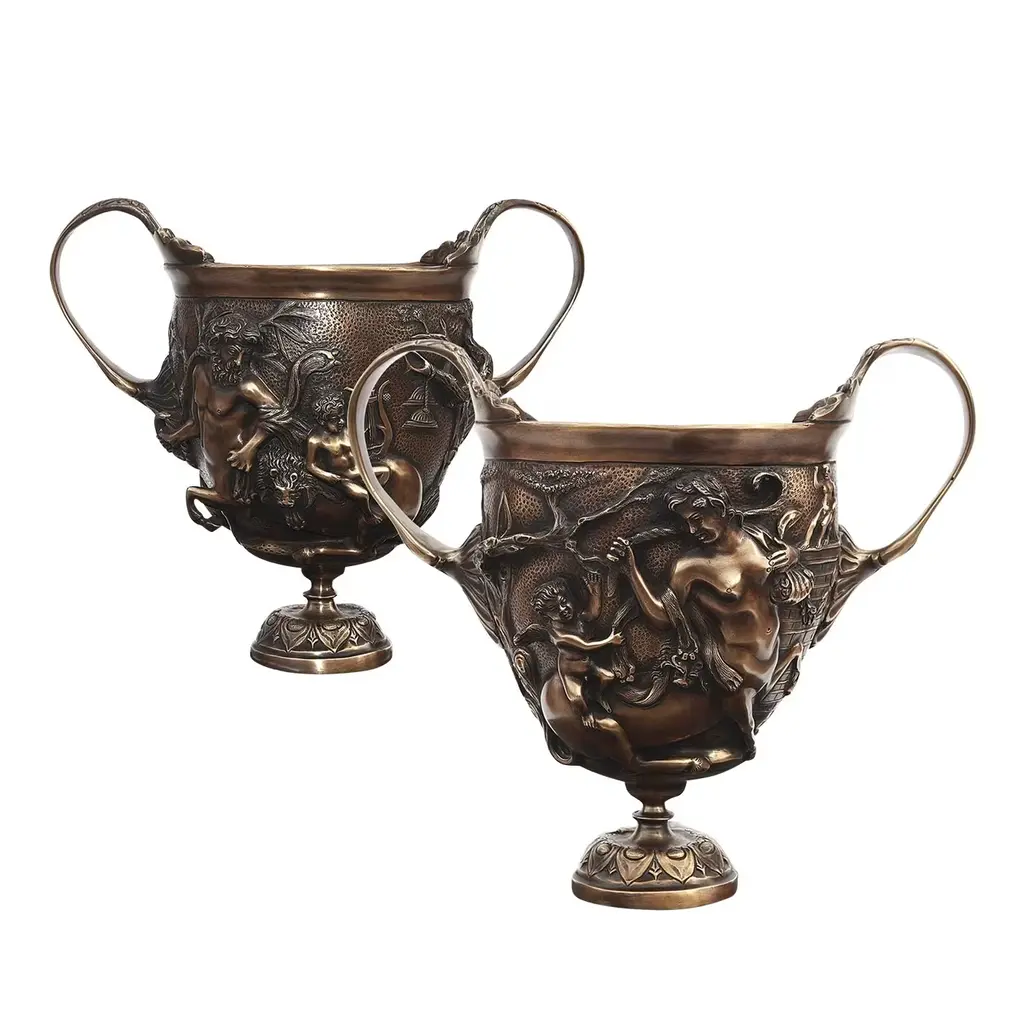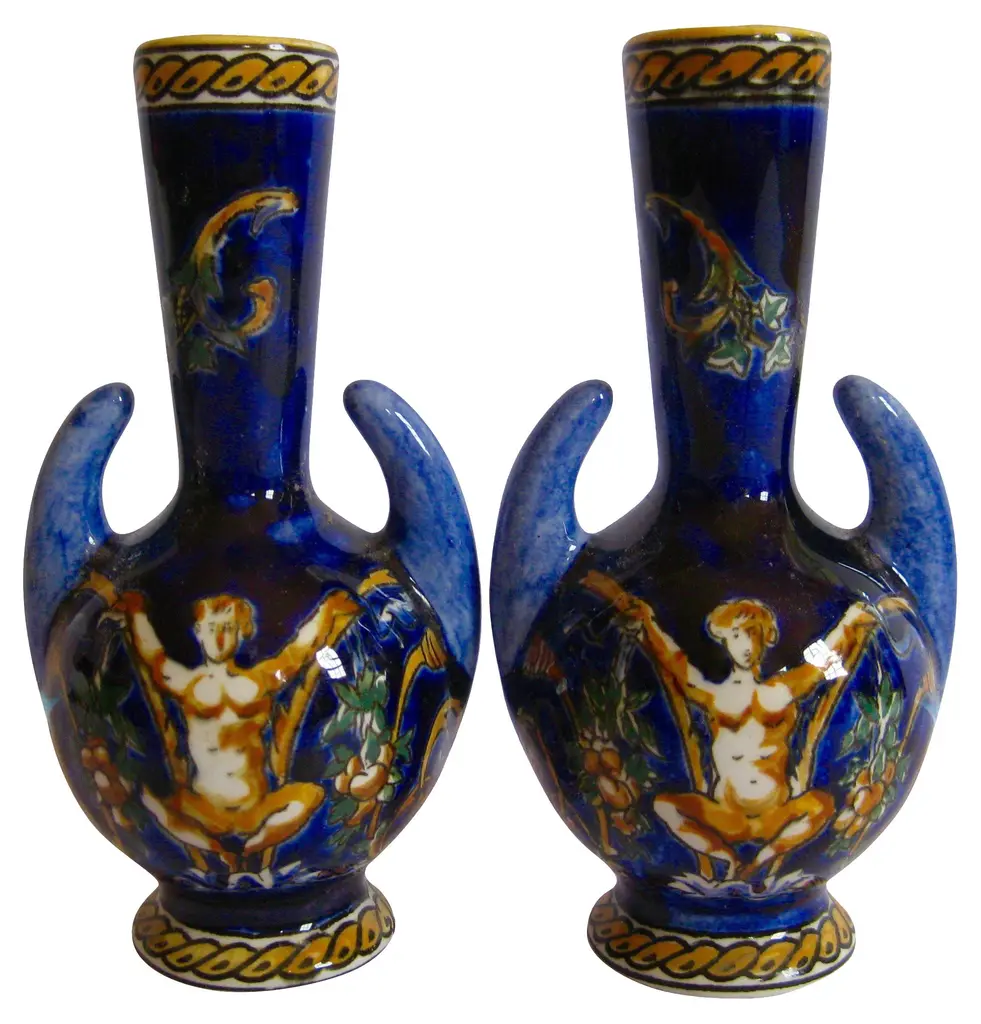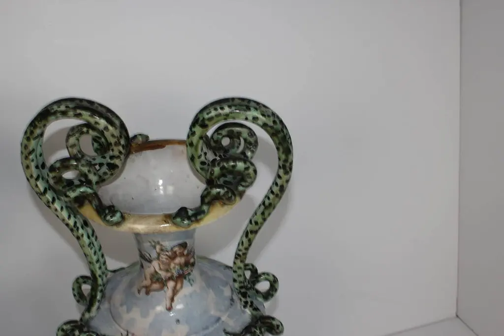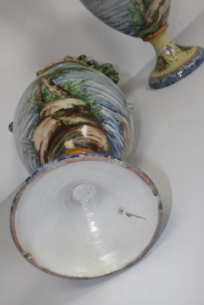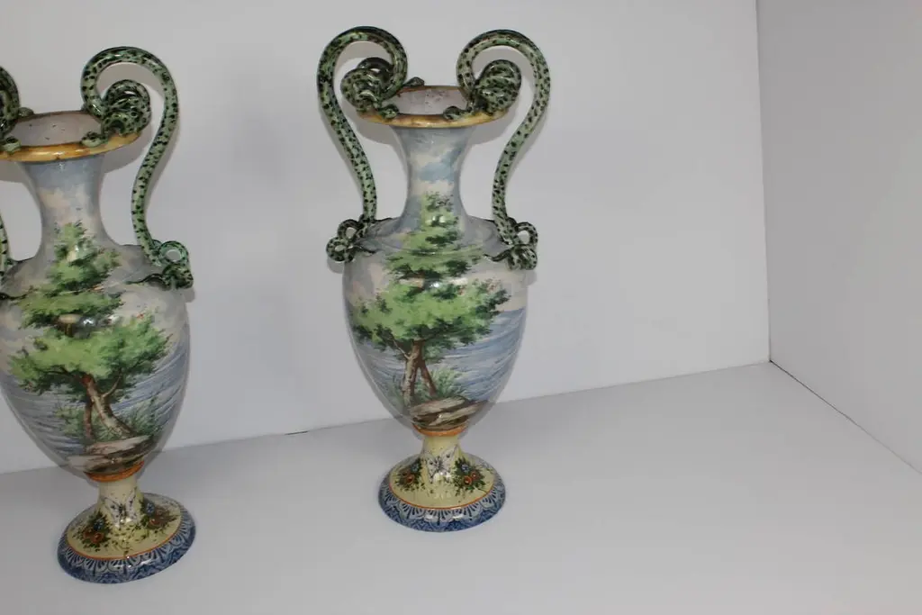 Late 19th century hand-painted Italian urns. The urns depict men, women, and angles in the ocean. The colors are soft but the handlers are painted in green and black in snack pattern. They are both signed.