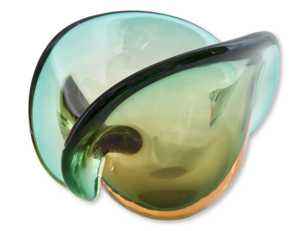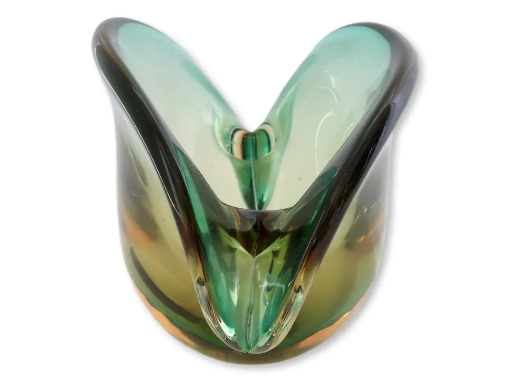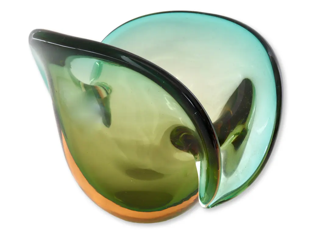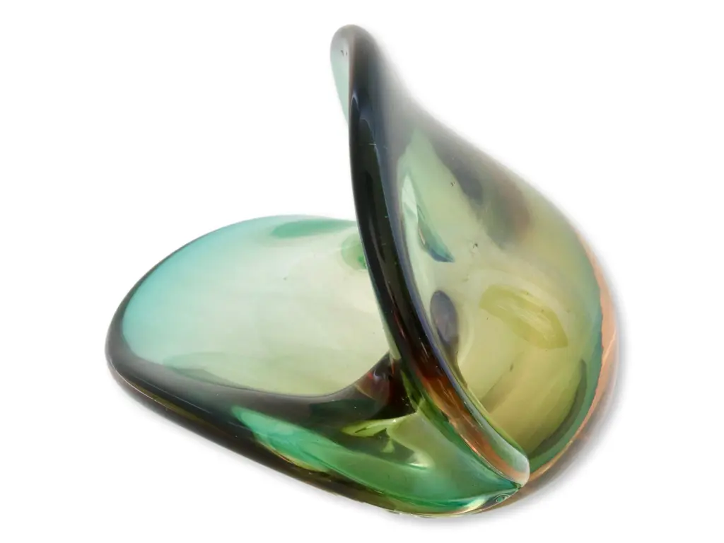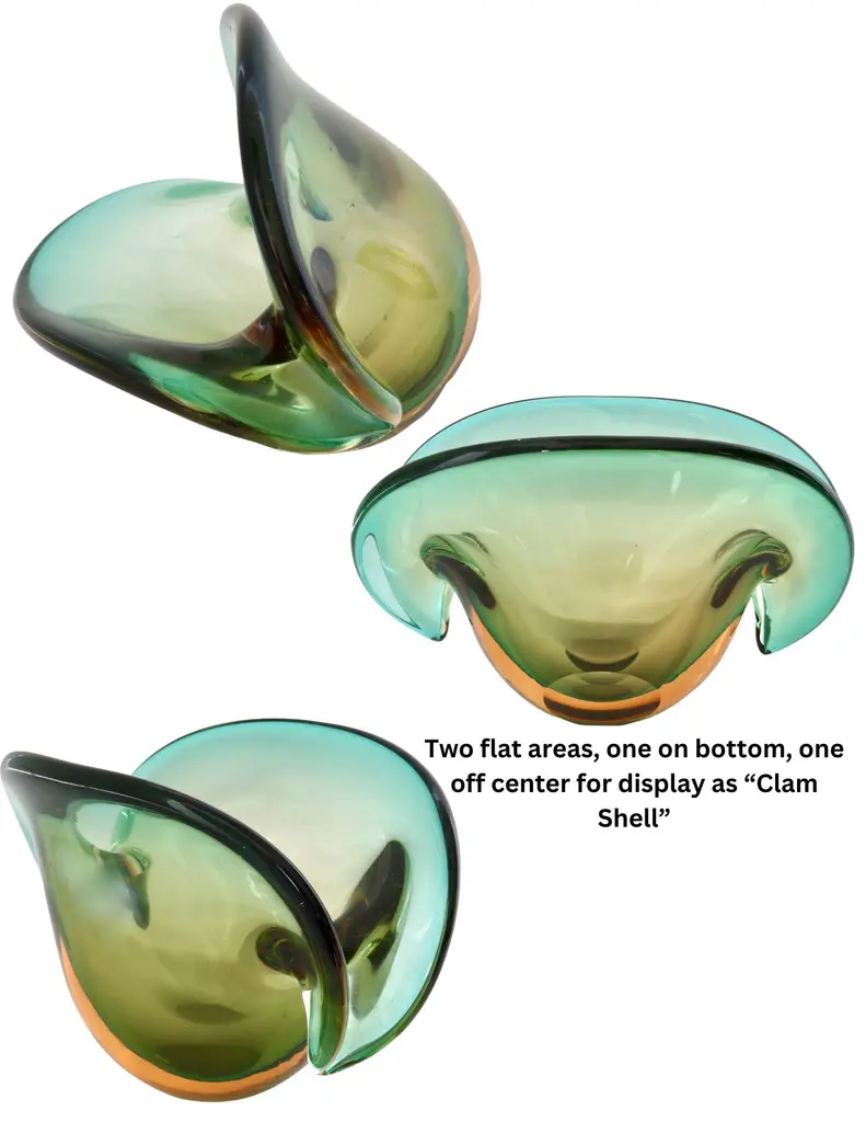 This midcentury Murano glass clam shell vase, attributed to Archimede Seguso, features elegant curves and can double as a cigarette holder. With two flat areas for display, it can be positioned either straight up or tilted. A versatile and stylish addition to any decor. Unsigned. Circa 1950s.
