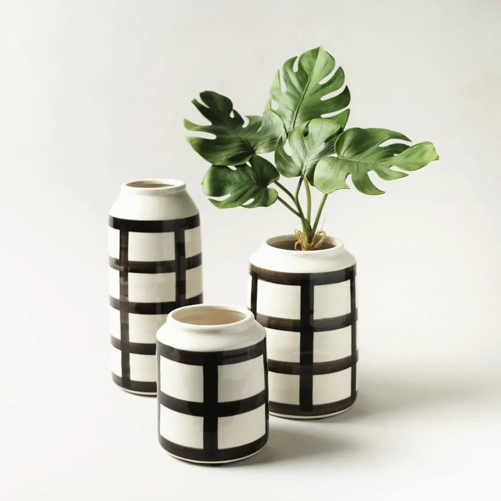 Enhance your home decor with this elegant Glazed Decorative Terracotta Vase. The neutral black and white tones paired with the criss-cross pattern is the perfect combination to create a stunning display. The quality terracotta and glaze finish is sure to last for seasons to come. Complete the look by adding a bunch of dried or faux florals.
