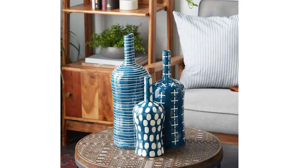 Provide textural appeal to your home by placing this Ivy Collection Blue Ceramic Contemporary Vase Set of 3 on any accent table, countertop, or shelves.